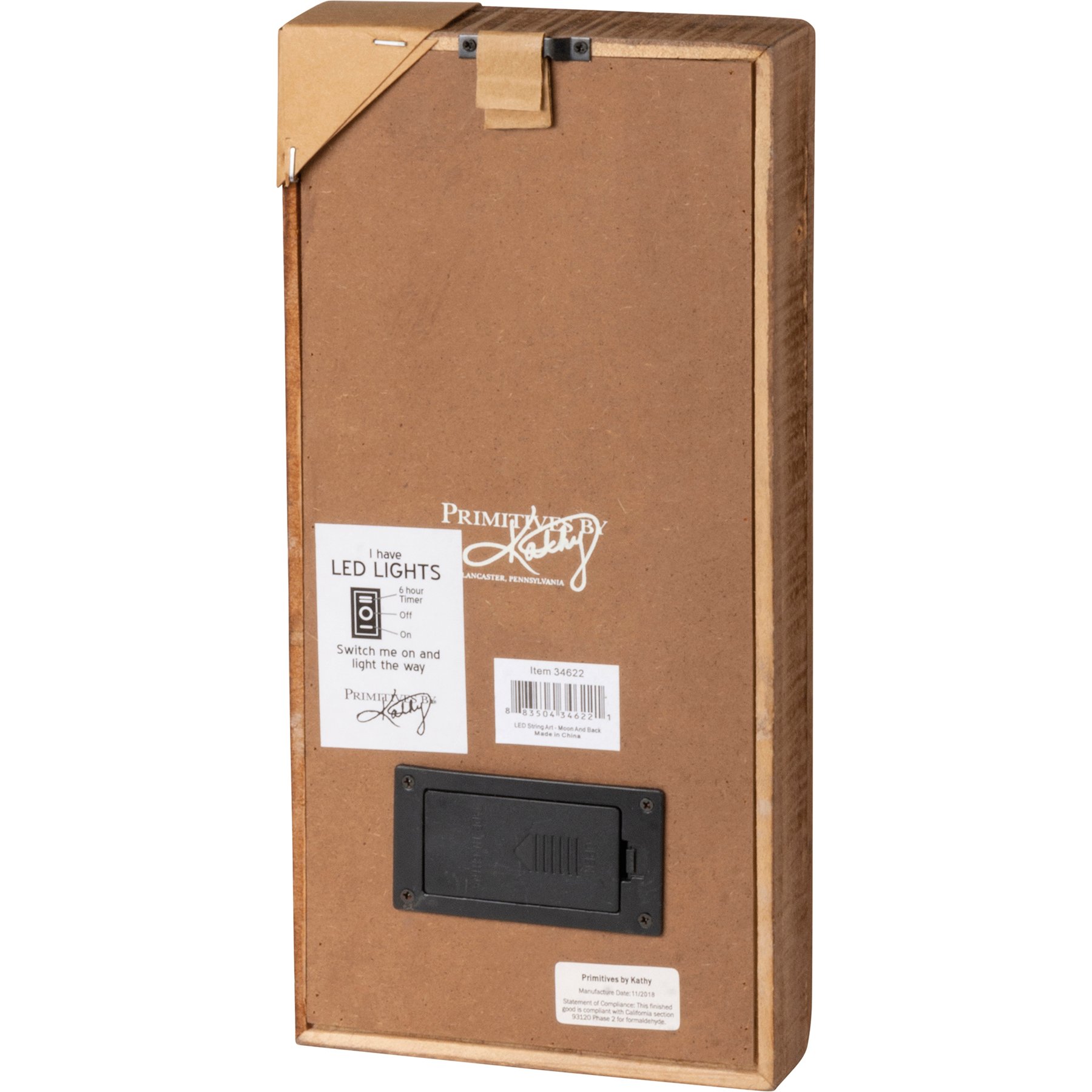 A slat wood box sign featuring a stacked "Love You To The Moon And Back And More Than All The Stars In The Sky" sentiment, moon and star designs, hand-strung details, and light up accents. Easy to hang as a gallery wall accent or can free-stand alone on a shelf or mantel. 6 Hr Timer, 2 AA Batteries (not included).