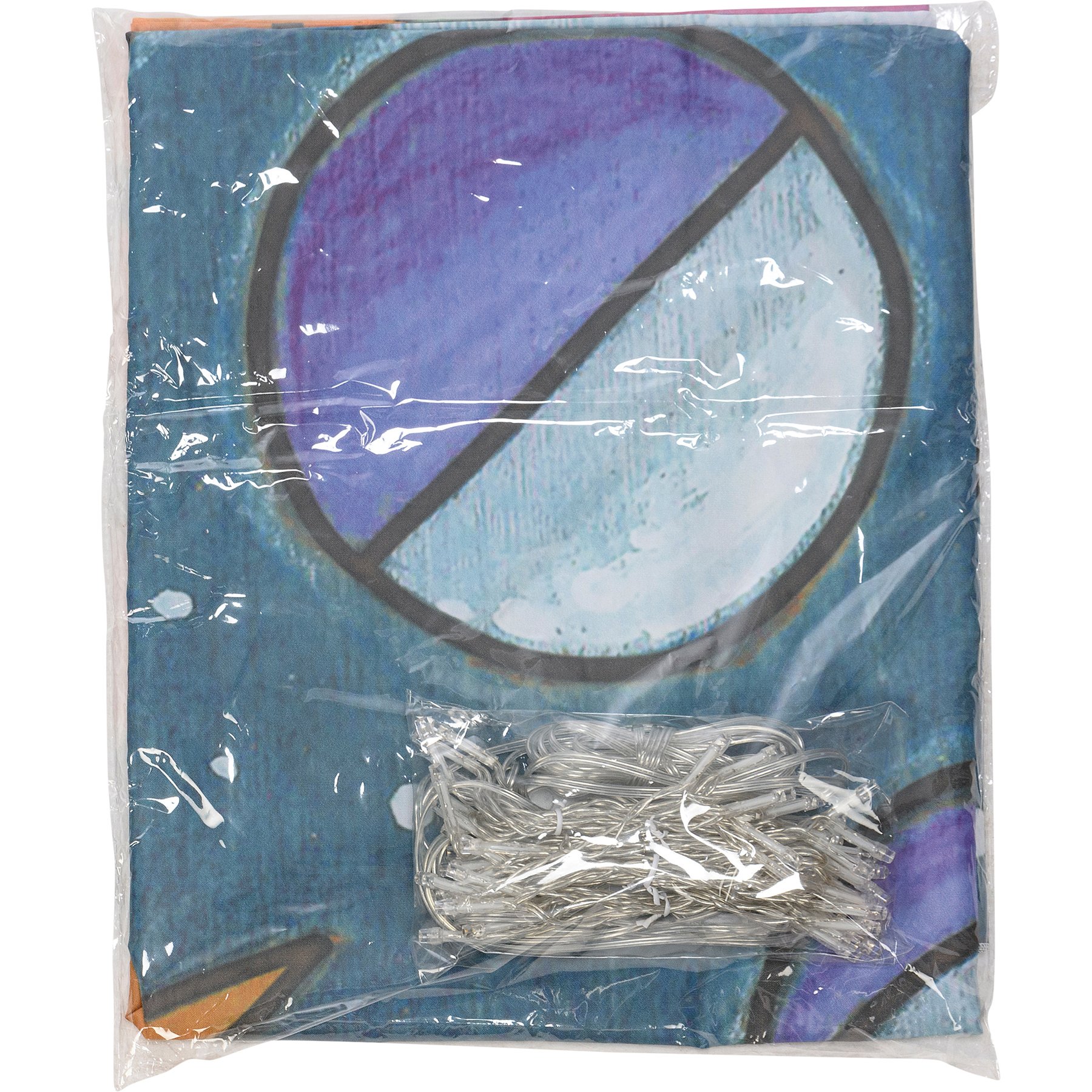 A lighted polyester tapestry featuring colorful and celestial wood burned designs. Comes with 52 individual firefly lights. Lights have a 6 Hour timer. Requires 3 AA batteries (not included). Some assembly required.