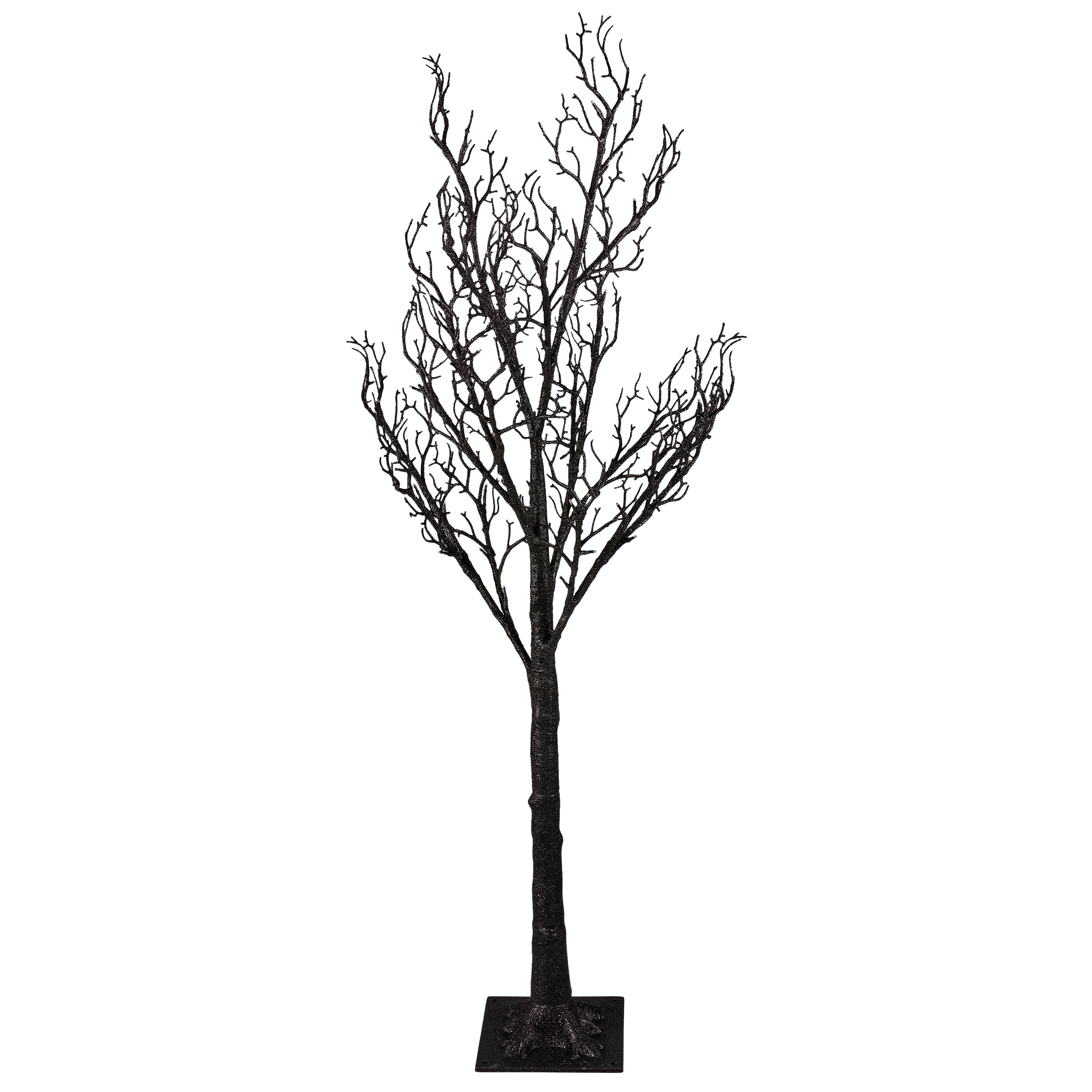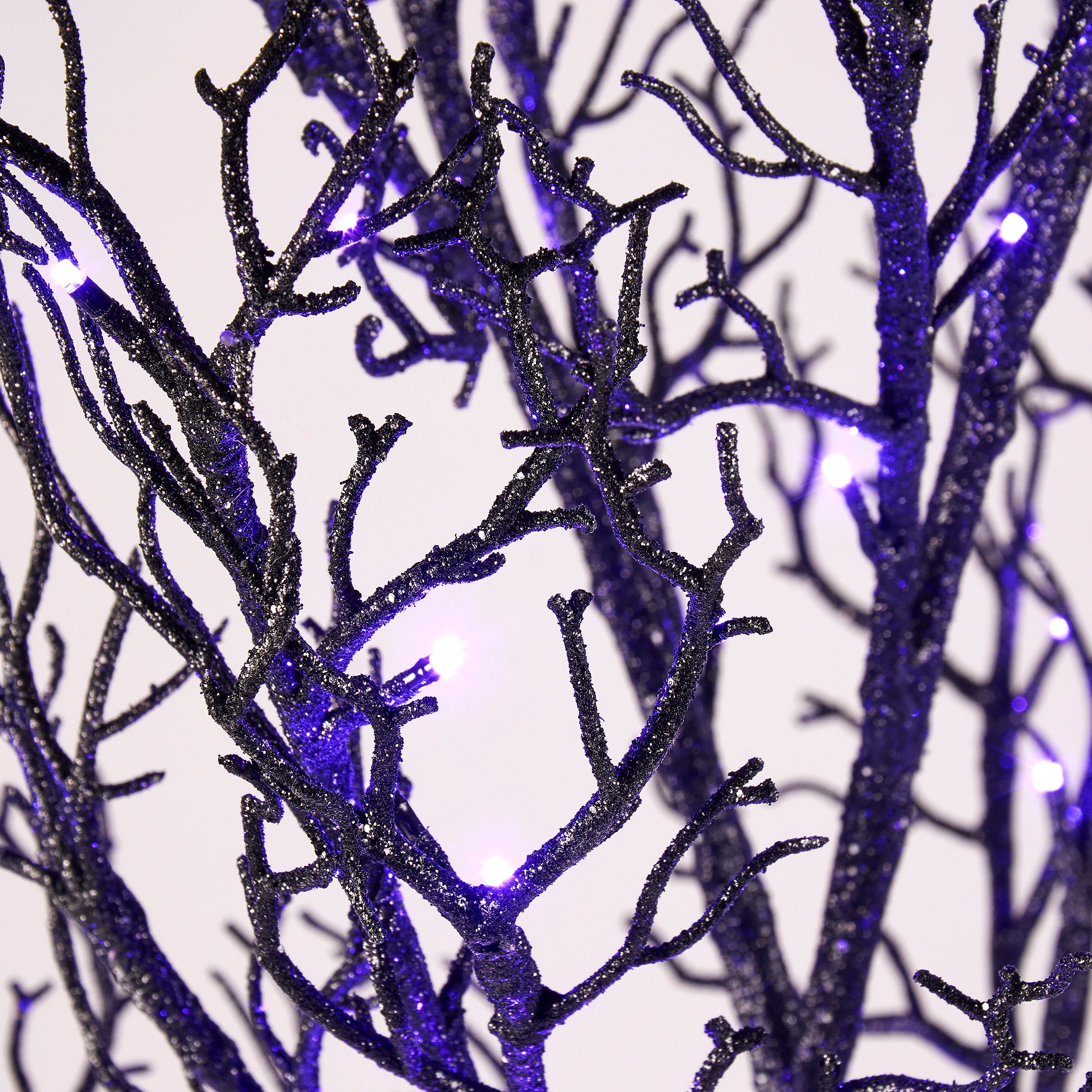 A lighted tree from our Halloween Collection featuring a dark black tree design with glitter accents. Tree features 4' height with 48 lights throughout the twigs that can change between orange and purple color as well as multiple light settings, including twinkle, sequential, wave and steady on. Our Lighted Black Glitter Tree is designed for indoor or outdoor use and is powered by outlet with 16' cord. A seasonal home accent perfect for adding spooky light to any display.