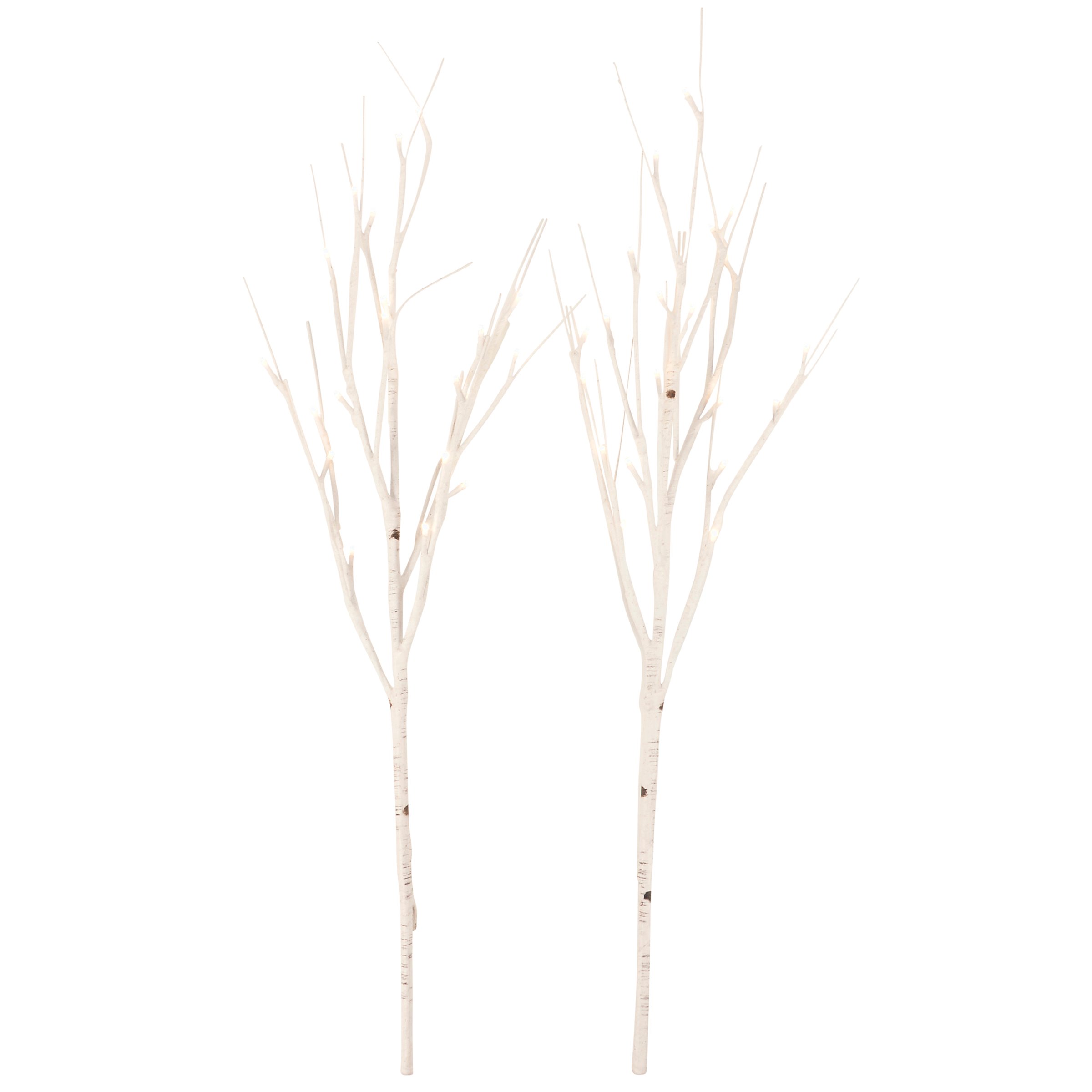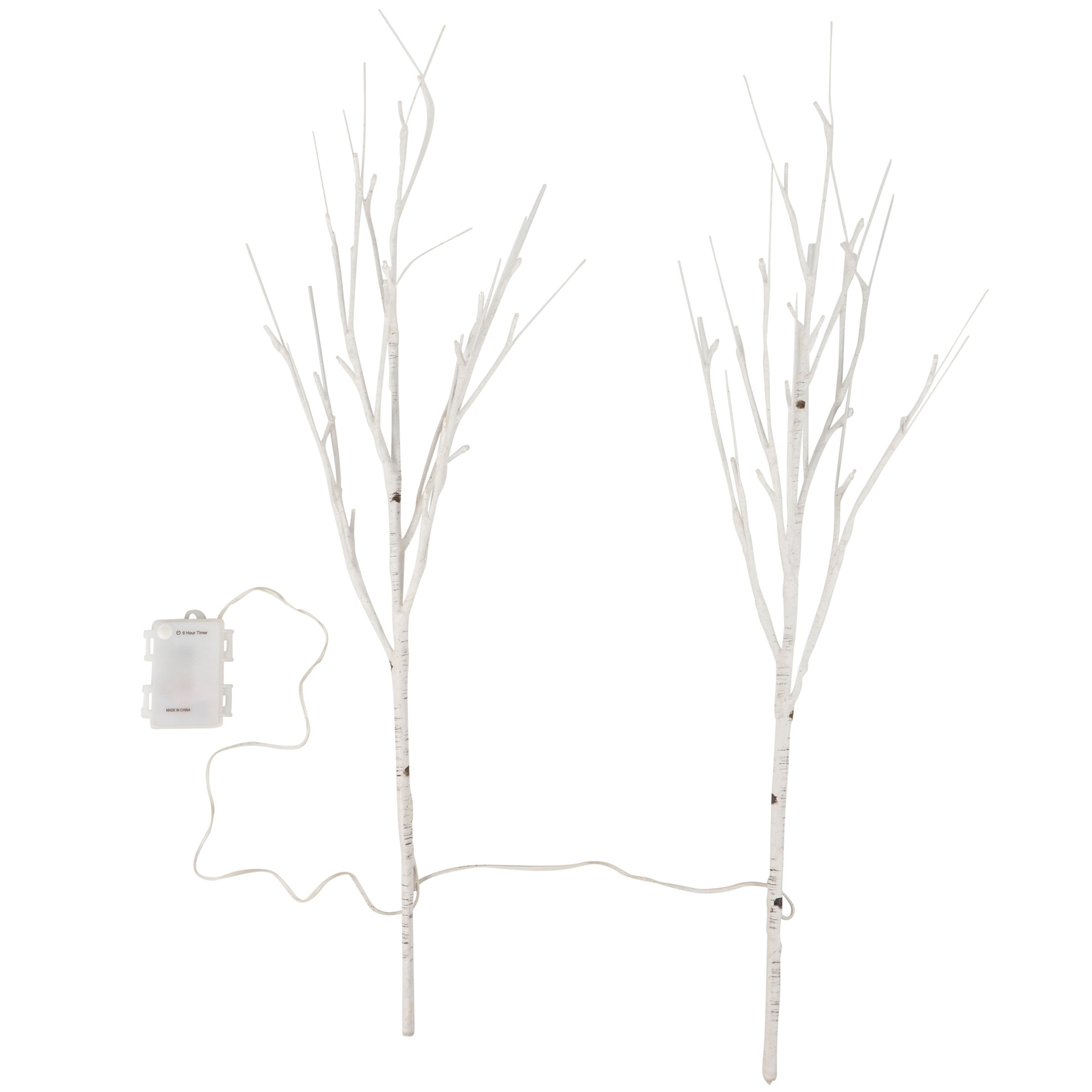 A pair of lighted white birch twigs from our Lighting Collection that's easy to display in a vase. Each stem stands 30" tall with 40 warm white lights throughout the twigs. Our Birch Double lighted twig includes a convenient 6-hour timer and runs on 3 AA batteries. Batteries not included. A seasonal home accent perfect for adding natural light to any room.
