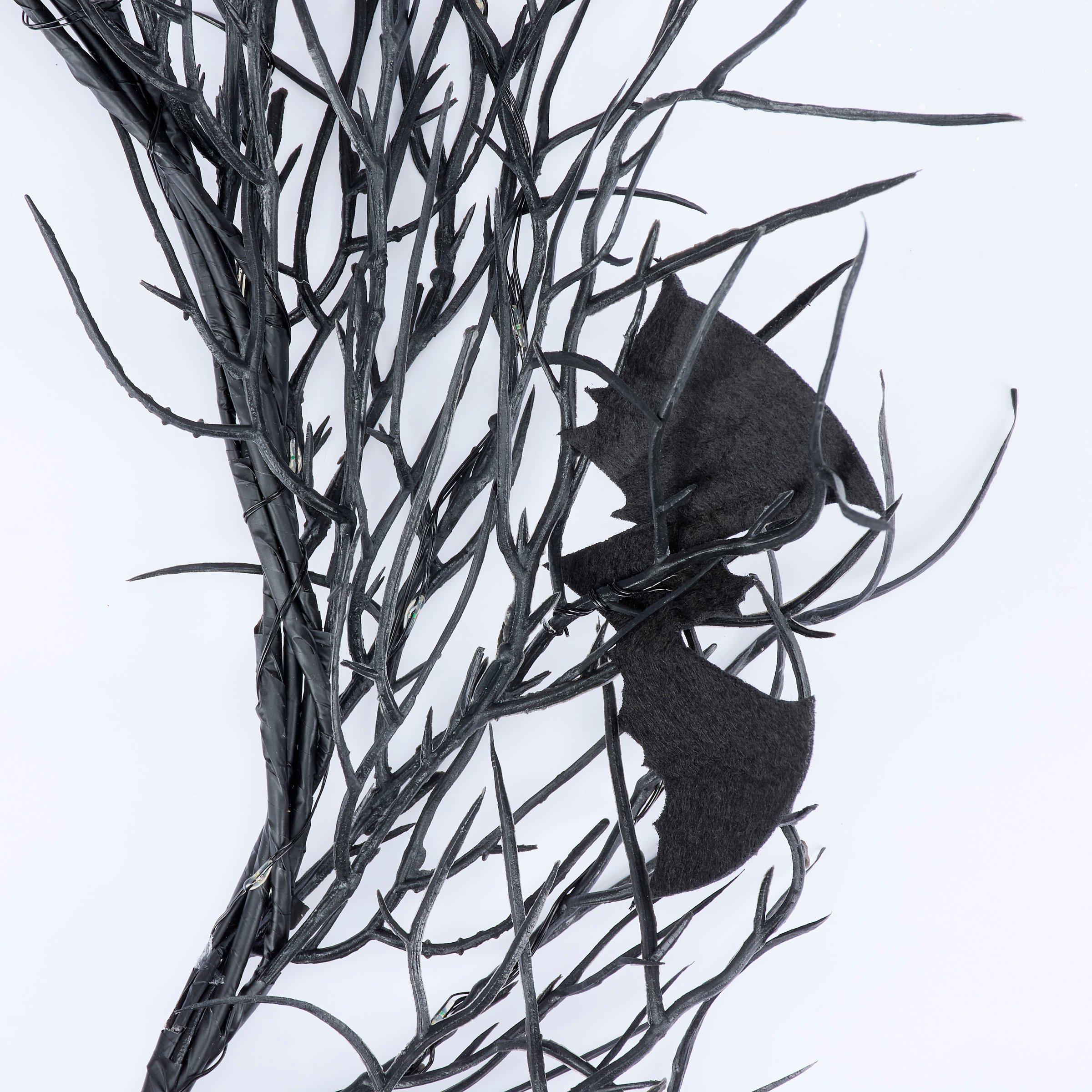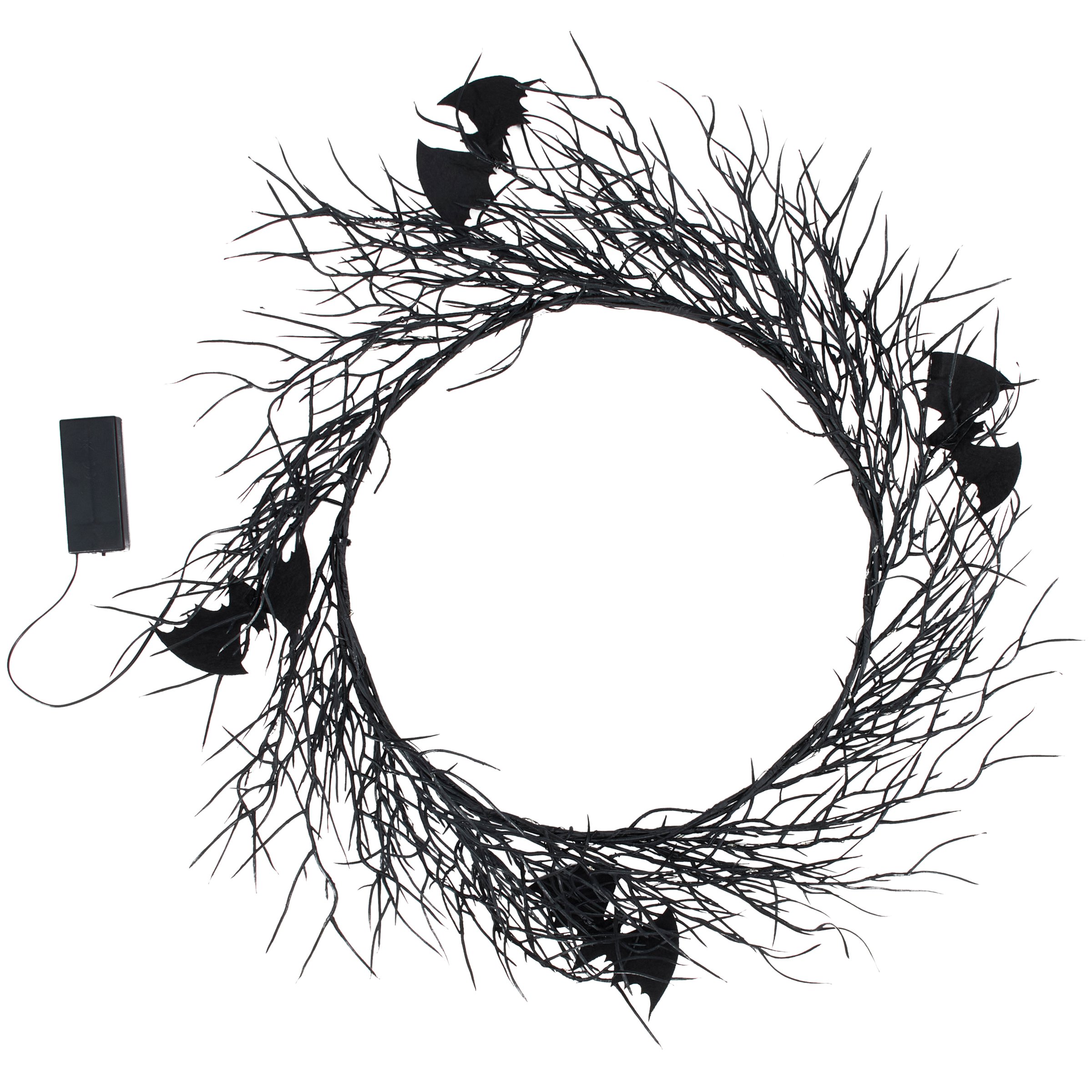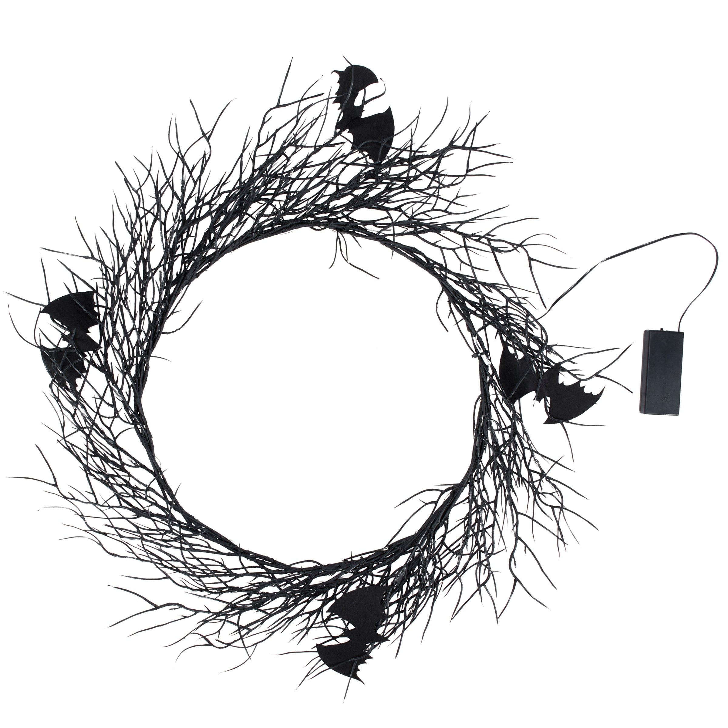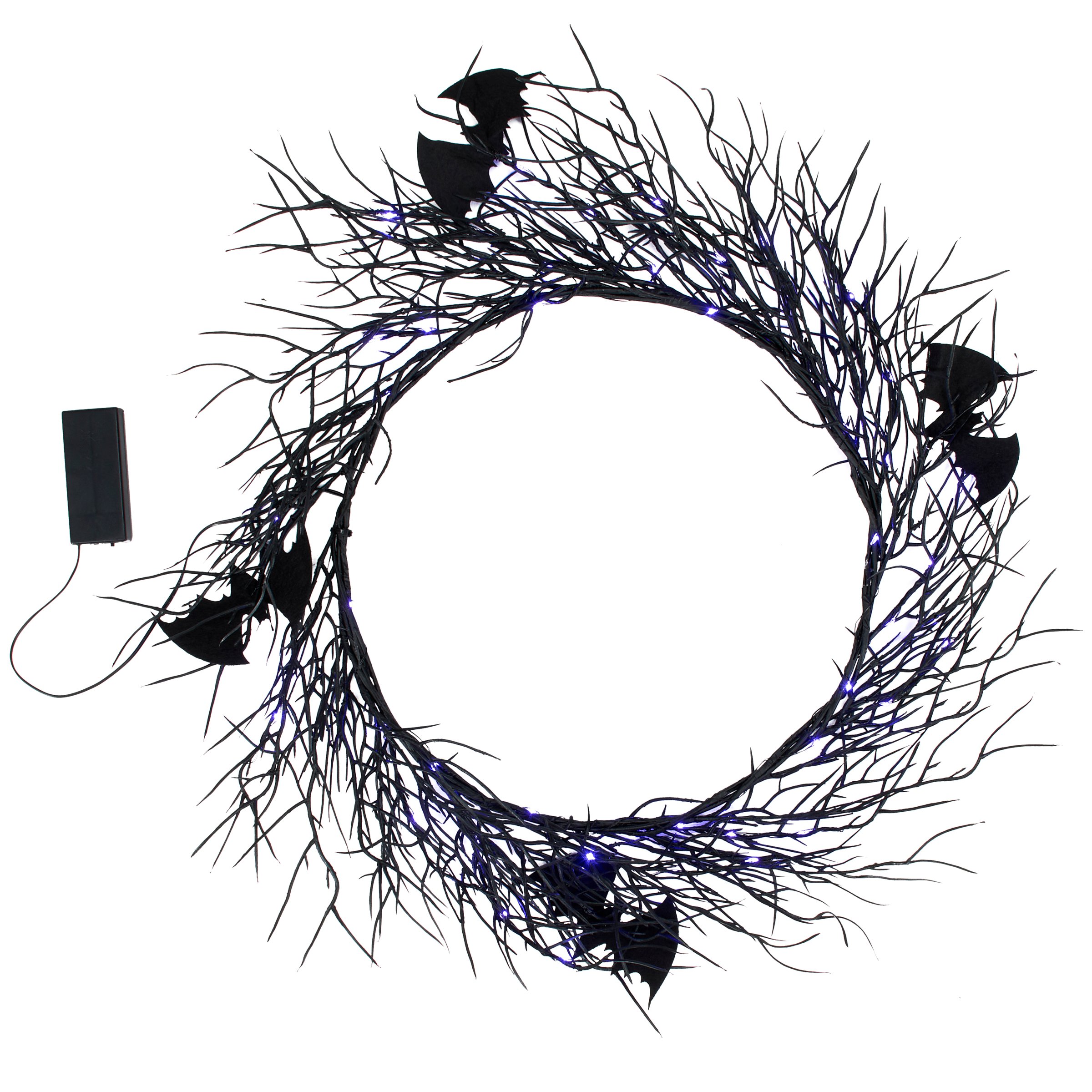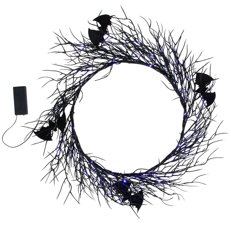 A lighted wreath from our Halloween Collection featuring felt bats on black twisted branches with purple lights throughout. Seasonal wreath includes 45 lights along a 20 inch diameter attached to power source and cord. Our Batty lighted wreath features a convenient 6 hour timer and runs on 2 AA batteries. Batteries not included. Indoor use only. A moody Halloween home accent perfect for adding seasonal lighting to any room.