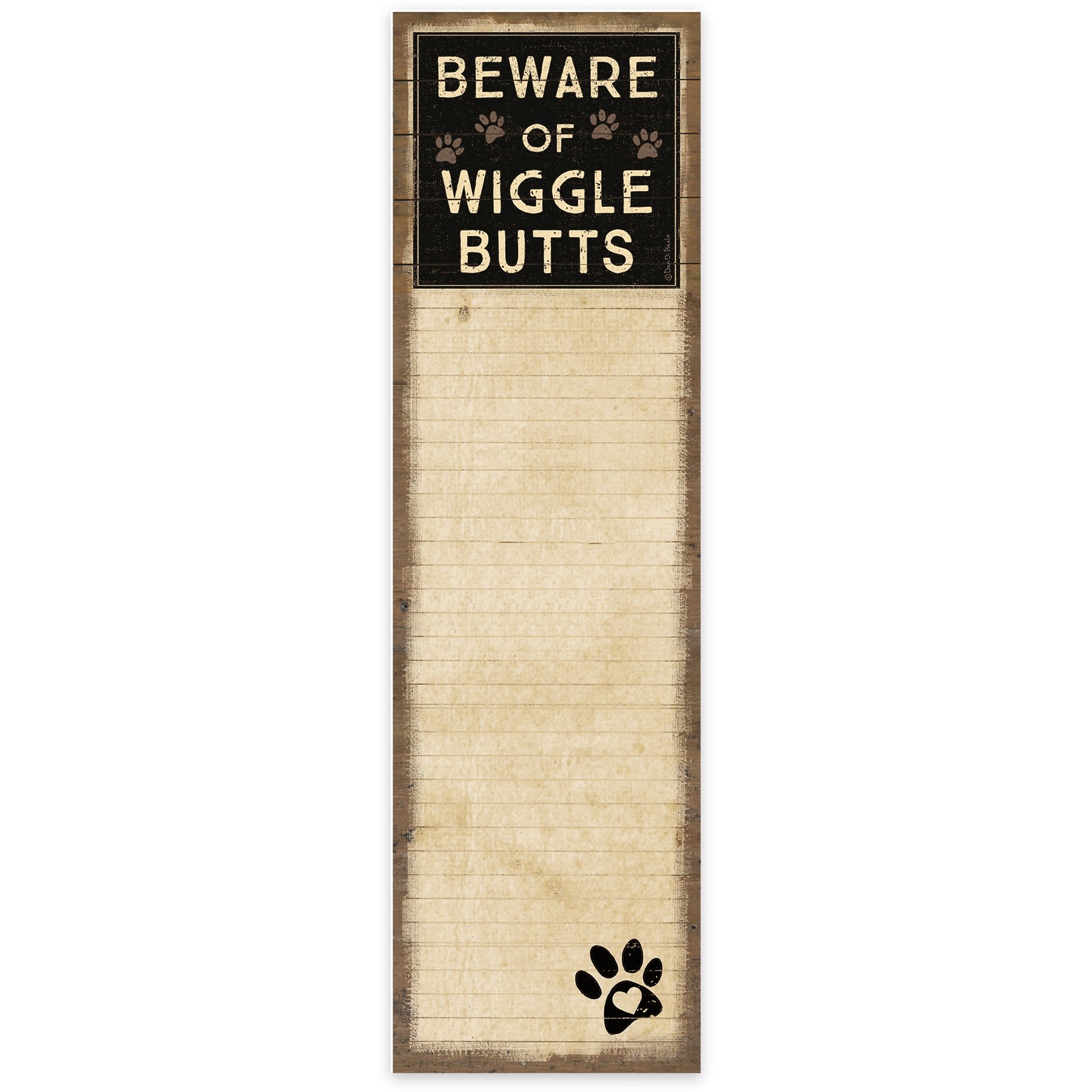 A list notepad displaying a rustic design of a fun dog inspired sentiment that reads "Beware Of Wigglebutts" on a slat wood background with lined space to write underneath. Our Wigglebutts list pad includes 60 pages and a strong magnet to easily hang on magnetic surface for display. Proudly made in the USA. A rustic pet-themed gift perfect for adding functional style to any space.