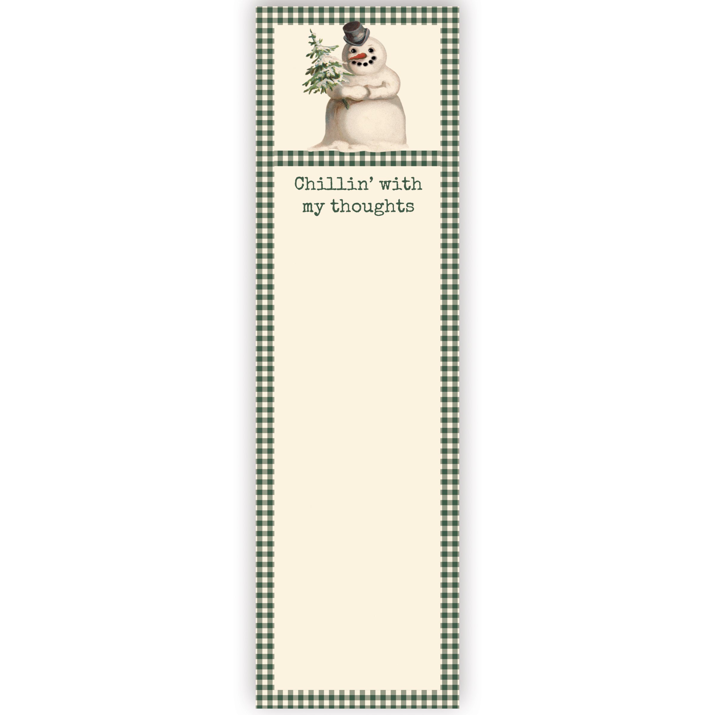 A list notepad from our Christmas Collection displaying vintage art of a happy snowman with a green gingham border around a blank writing space and a fun snowman inspired sentiment that reads "Chillin' With My Thoughts." Our Chillin' With My Thoughts list pad includes 60 pages and a strong magnet to easily hang on magnetic surface for display. Proudly made in the USA. A fun Christmas gift perfect for adding functional style to any space.