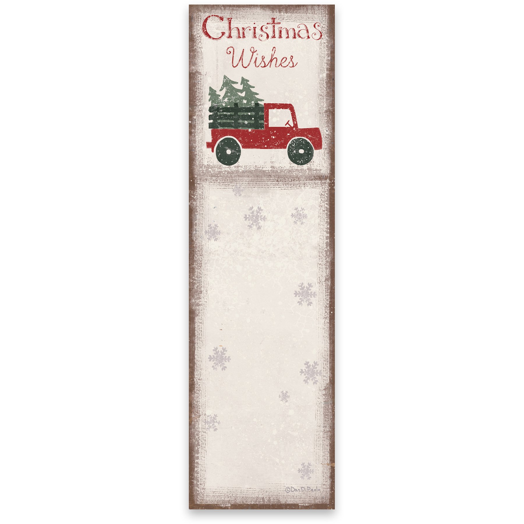 A rustic-inspired magnetic paper list notepad for Christmas featuring a distressed "Christmas Wishes" sentiment with truck and trees design. Complements well with coordinating designs for a festive collection. Includes 60 pages. Made in USA.