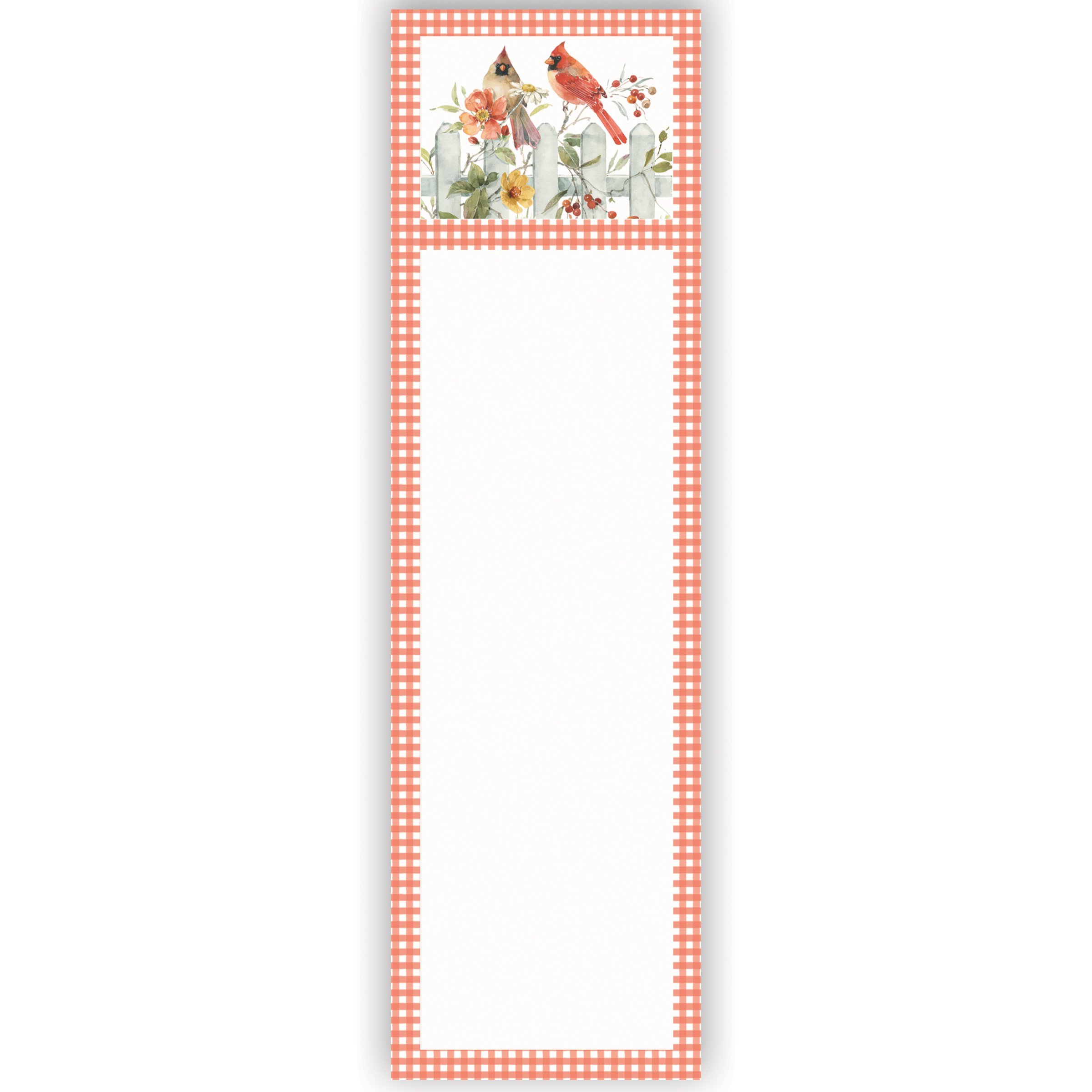 A list notepad from our Botanical Collection displaying a charming scene of a cardinal couple perched on a fence and summer flowers with a complementing red gingham pattern border and blank space underneath for writing. Cardinal couple design and pattern are replicated from original art hand painted in a delicate watercolor style. Our Everyday Cardinals list pad includes 60 pages and a strong magnet to easily hang on magnetic surface for display. Proudly made in the USA. A charming cardinal themed gift perfect for adding functional style to any space.