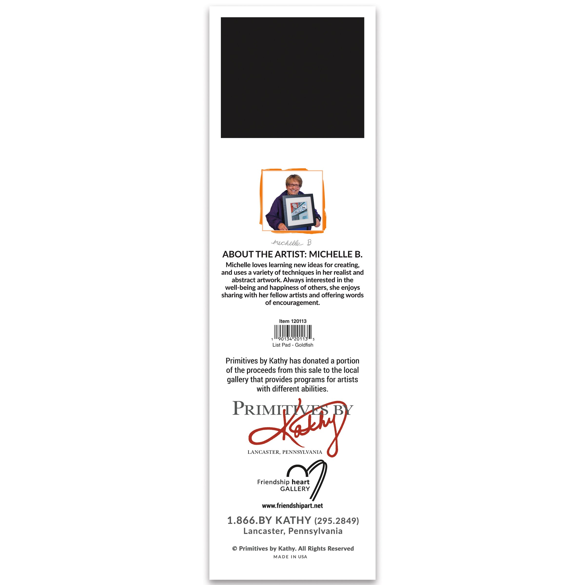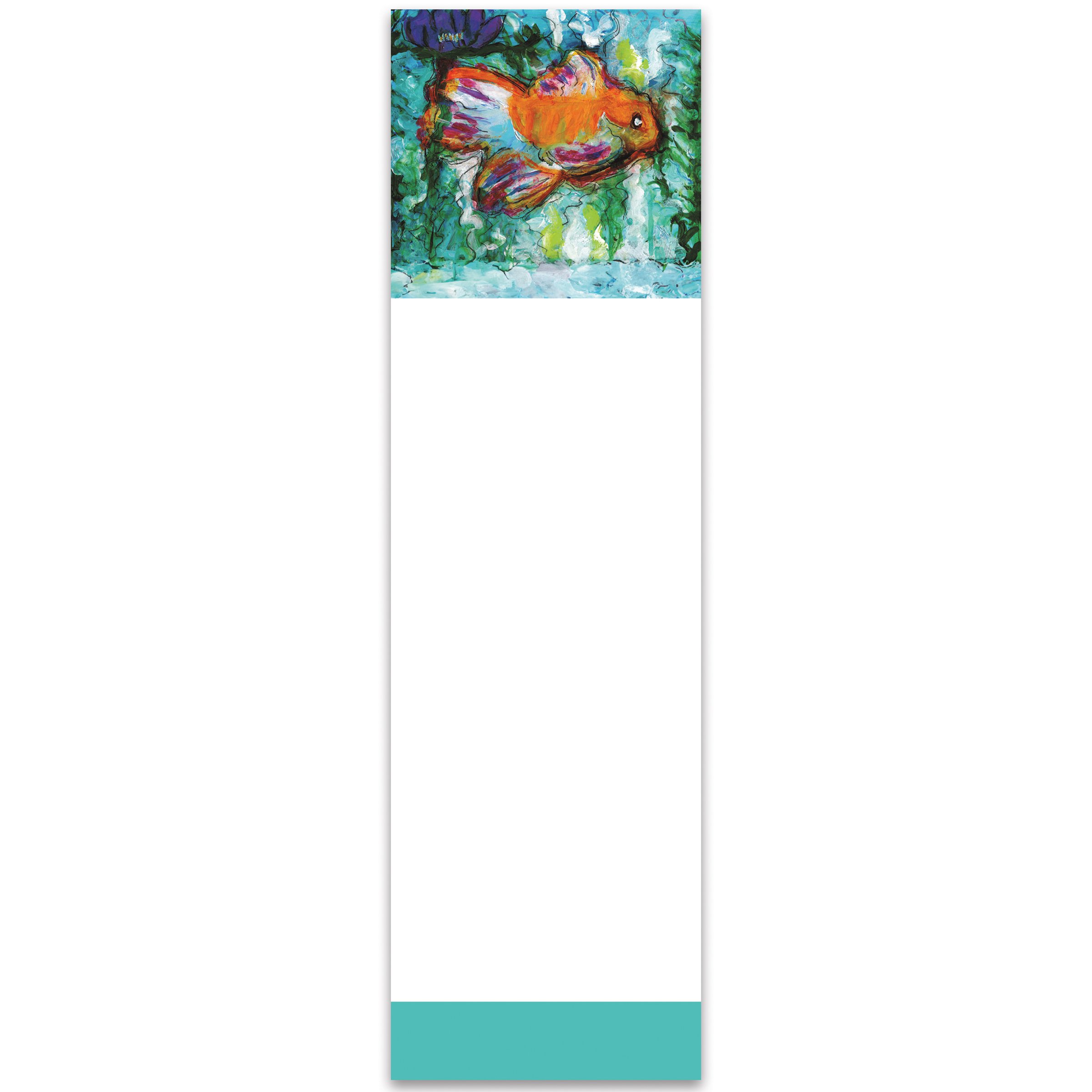 A list notepad from our Friendship Heart Gallery Collection displaying a uniquely hand painted scene of a goldfish with blank space underneath for writing. Goldfish design is replicated from original art created at the Friendship Heart Gallery in downtown Lancaster, PA that supports artists with intellectual disabilities and autism. Our Goldfish list pad includes 60 pages and a strong magnet to easily hang on magnetic surface for display. Proudly made in the USA. A pet-themed gift perfect for adding functional style to any space.