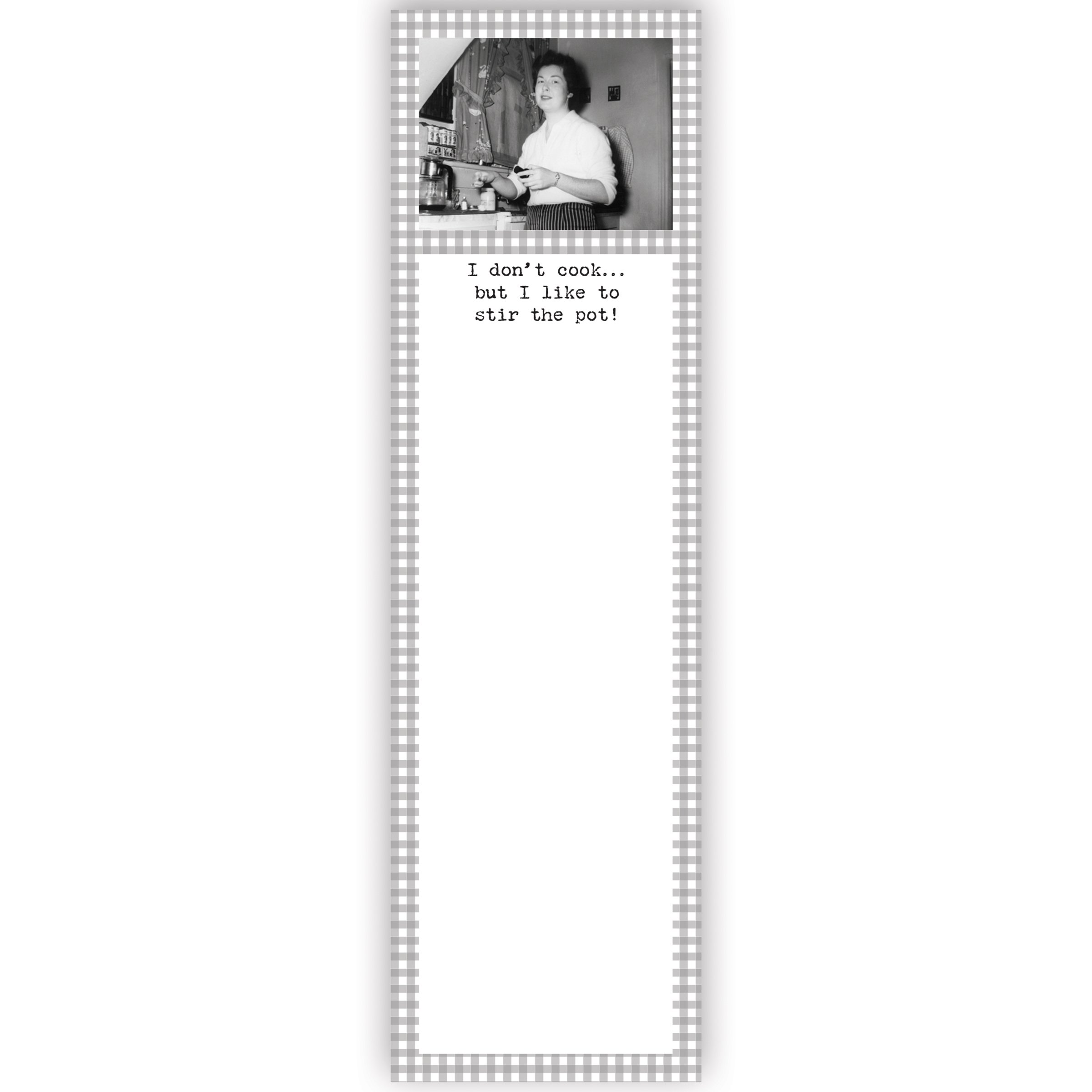 A list notepad from our Trash Talk By Annie Collection displaying a vintage black and white photograph with a blank space for writing under and a sassy sentiment that reads "I Don't Cook... But I Like To Stir The Pot!" Our I Like To Stir The Pot list pad includes 60 pages and a strong magnet to easily hang on magnetic surface for display. Proudly made in the USA. A fun gift perfect for adding functional sassy style to any space.
