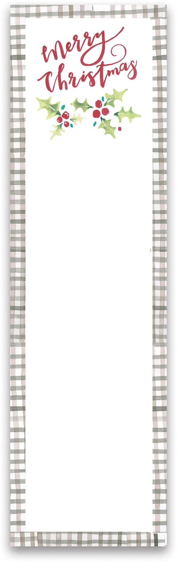 A watercolor art-inspired magnetic paper list notepad lending a hand lettered "Merry Christmas" sentiment with holly design and checkered border. Contains 60 pages. Complements well with coordinating design pieces for a festive collection. Made in USA.