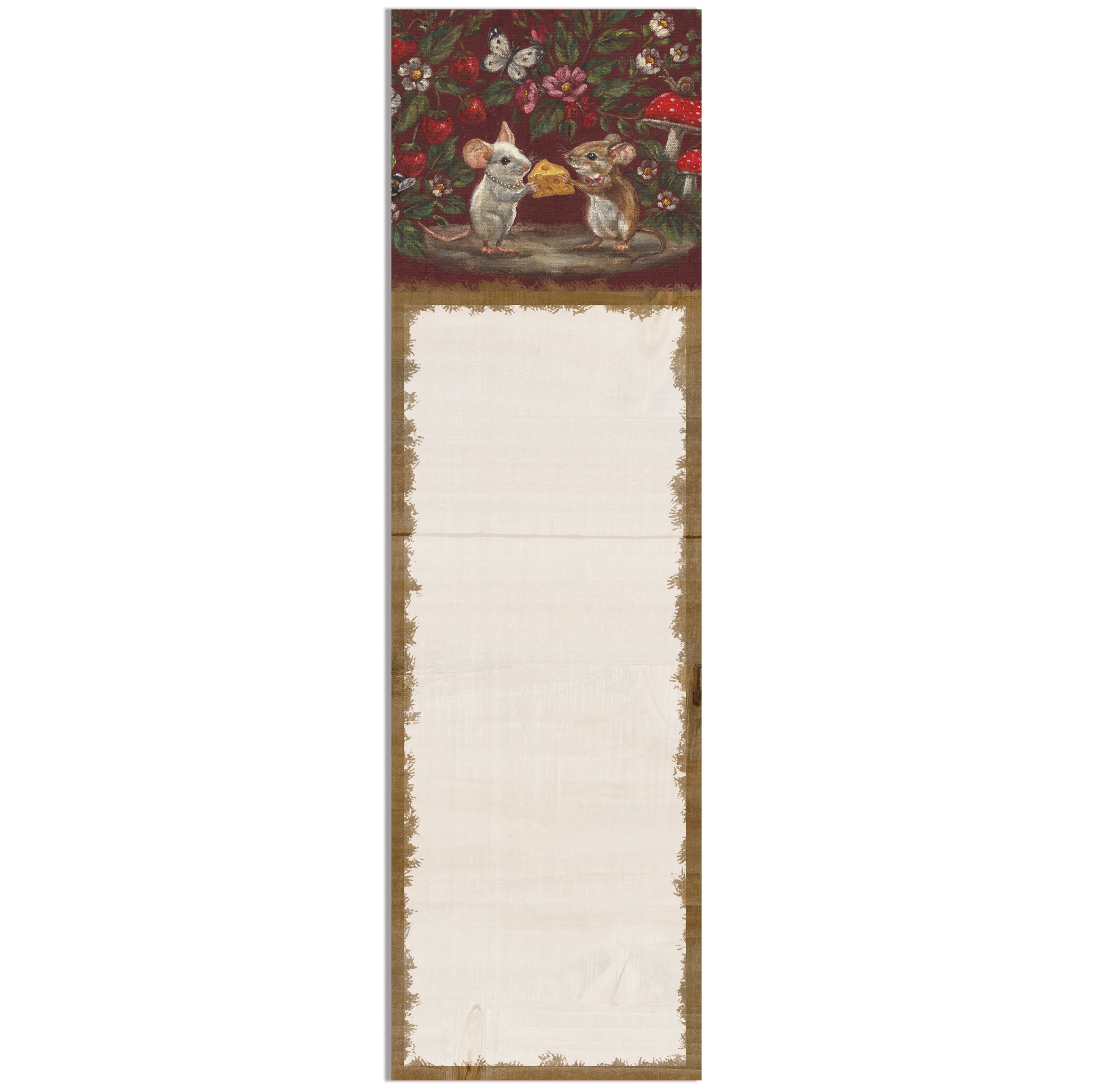 A list notepad from our Valentine's Day Collection displaying a heartwarming scene of moody florals surrounding a cute mouse couple gifting a piece of cheese with a decorative space underneath for writing. Valentine mice design is replicated from original artwork painted onto burlap canvas, giving the art a unique depth and texture. Our Mouse Love list pad includes 60 pages and a strong magnet to easily hang on magnetic surface for display. Proudly made in the USA. An animal-themed Valentine's Day gift perfect for adding functional style to any space.