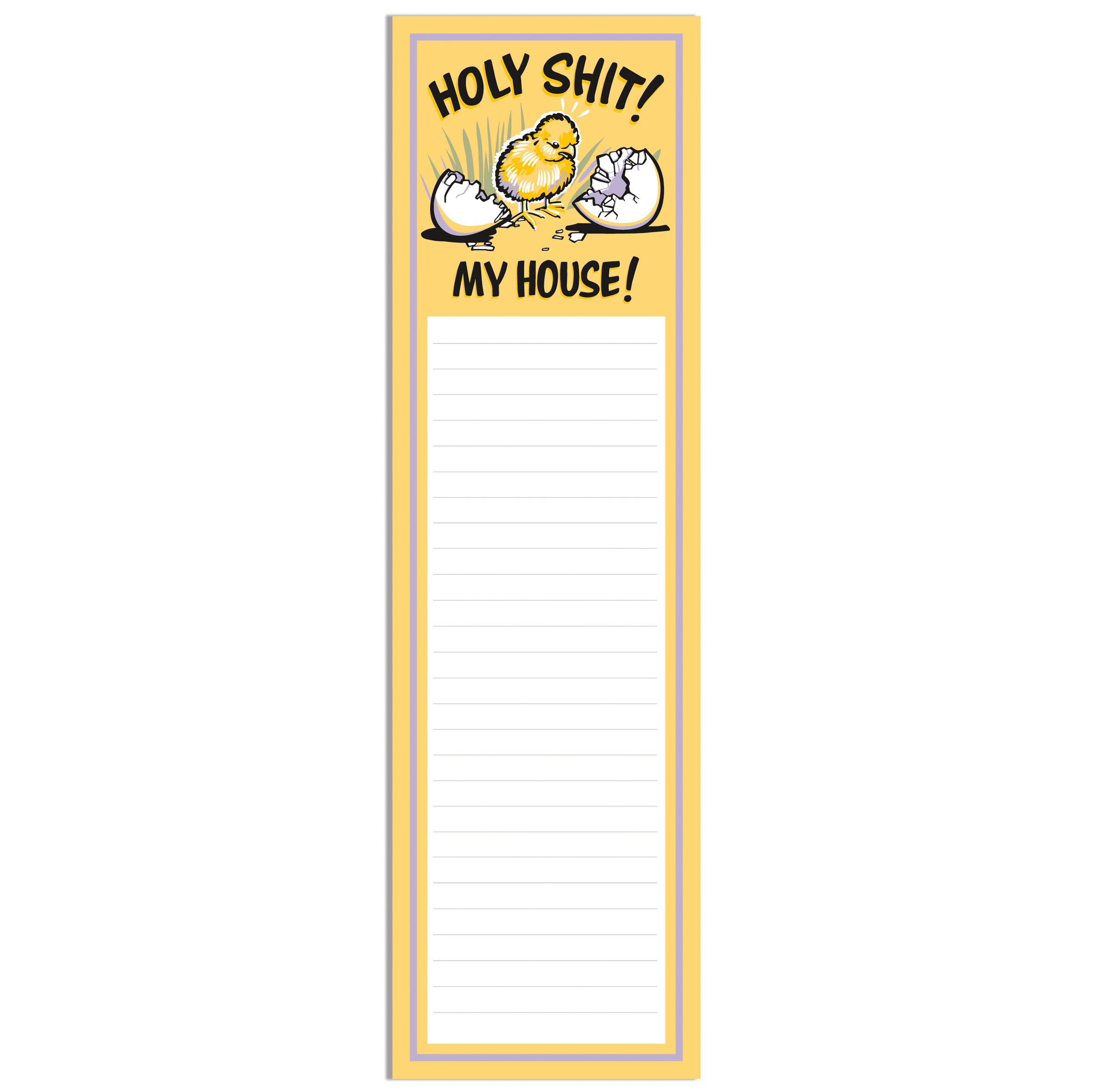 A list notepad from our Easter & Spring Collection displaying a playful hand illustrated design of a chick looking at a broken eggshell with a funny Easter sentiment that reads "Holy Shit! My House!" and lined space underneath for writing. Our My House! list pad includes 60 pages and a strong magnet to easily hang on magnetic surface for display. Proudly made in the USA. A fun Easter gift perfect for adding functional style to any space.