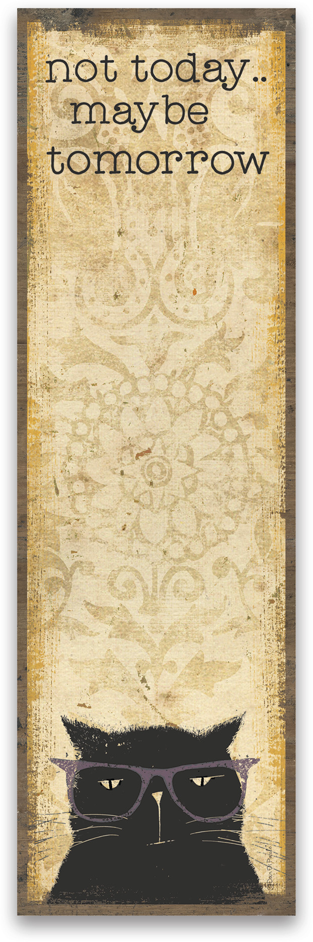 A list notepad displaying a rustic pet-themed design featuring a sassy cat with a sarcastic sentiment that reads "Not Today... Maybe Tomorrow." Our Not Today list pad includes 60 pages and a strong magnet to easily hang on magnetic surface for display. Proudly made in the USA. A fun pet-themed gift perfect for adding functional style to any space.