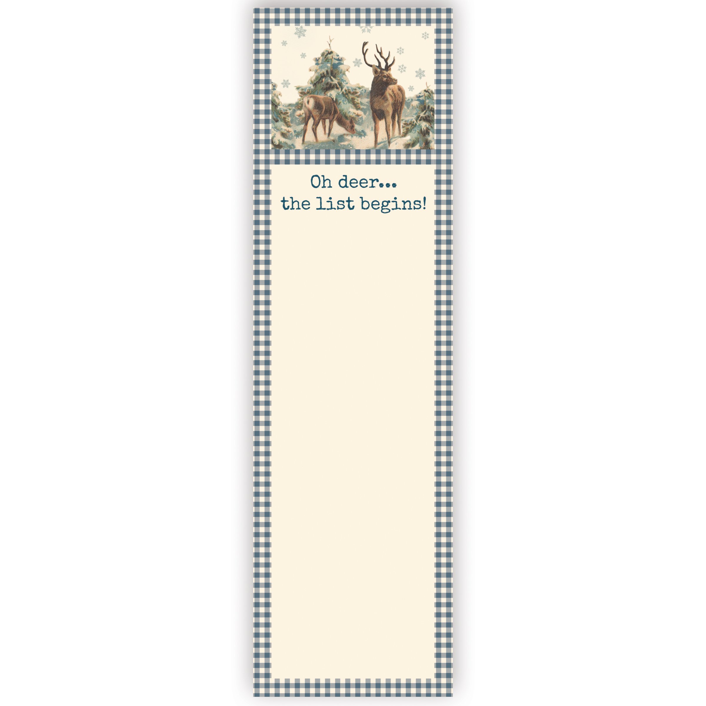 A list notepad from our Christmas Collection displaying vintage art of a deer on a snowy mountain with a blue gingham border around a blank writing space and a fun deer pun that reads "Oh Deer... The List Begins!" Our Oh Deer The List Begins list pad includes 60 pages and a strong magnet to easily hang on magnetic surface for display. Proudly made in the USA. A fun Christmas gift perfect for adding functional style to any space.