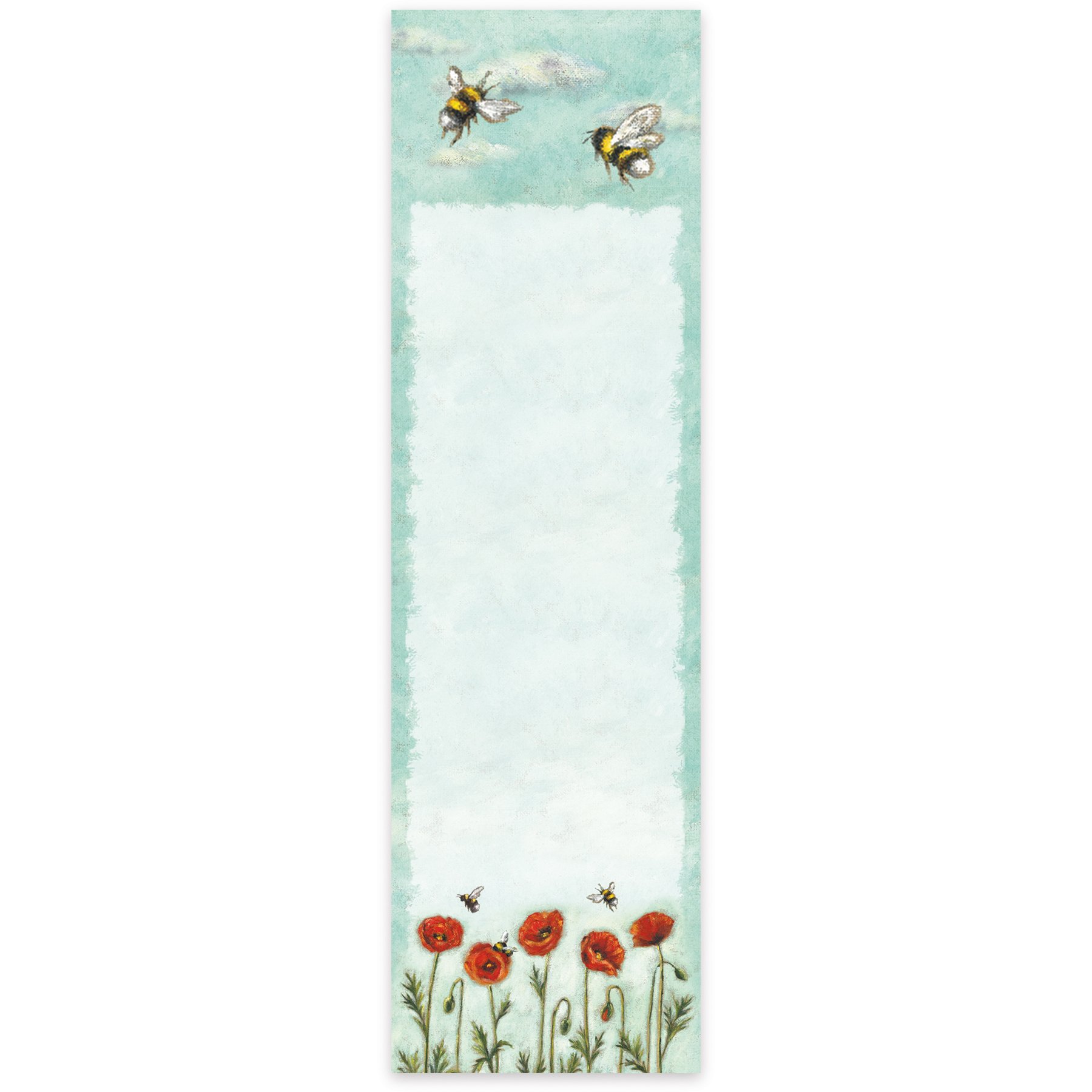 A list notepad from our Garden Collection displaying a hand painted design of a bees in the sky and a field of poppies with a decorative space to write in between. Design is replicated from original artwork painted onto burlap canvas, giving the art a unique depth and texture. Includes 60 pages and a strong magnet to easily hang on magnetic surface. Our Poppies list pad is proudly made in the USA.