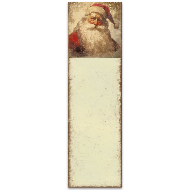 A list notepad from our Christmas Collection displaying a vintage portrait of Santa with distressed details and decorative space underneath for writing. Our Santa's Portrait list pad includes 60 pages and a strong magnet to easily hang on magnetic surface for display. Proudly made in the USA. A vintage Christmas gift perfect for adding functional style to any space.