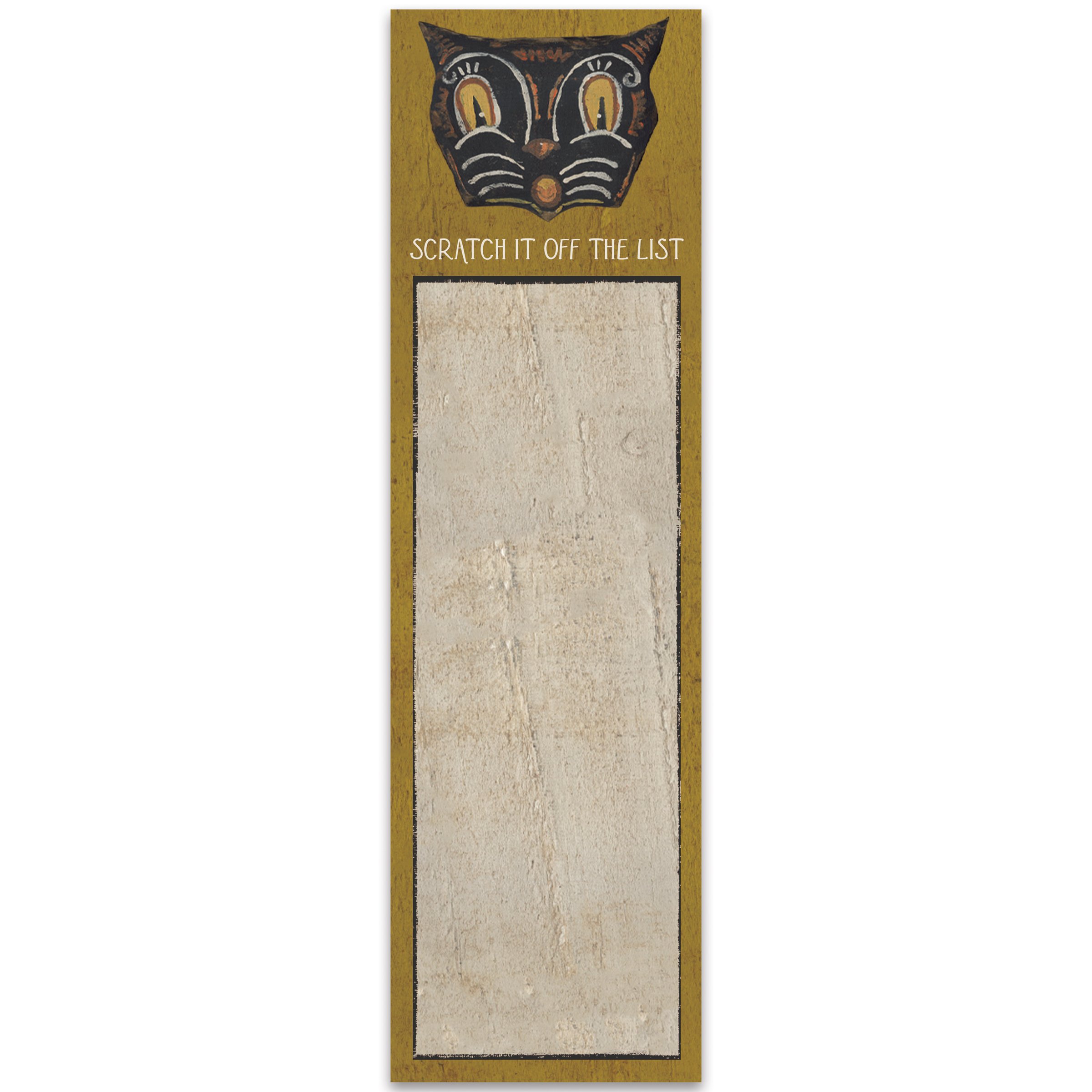 A list notepad from our Halloween Collection displaying a primitive inspired black cat face and fun seasonal sentiment that reads "Scratch It Off The List" with a decorative space underneath for writing. Cat face design is replicated from an original art piece made from a hand carved wooden shape that was hand painted with the face design. Our Scratch It Off The List pad includes 60 pages and a strong magnet to easily hang on magnetic surface for display. Proudly made in the USA. A rustic Halloween-themed gift perfect for adding functional style to any space.