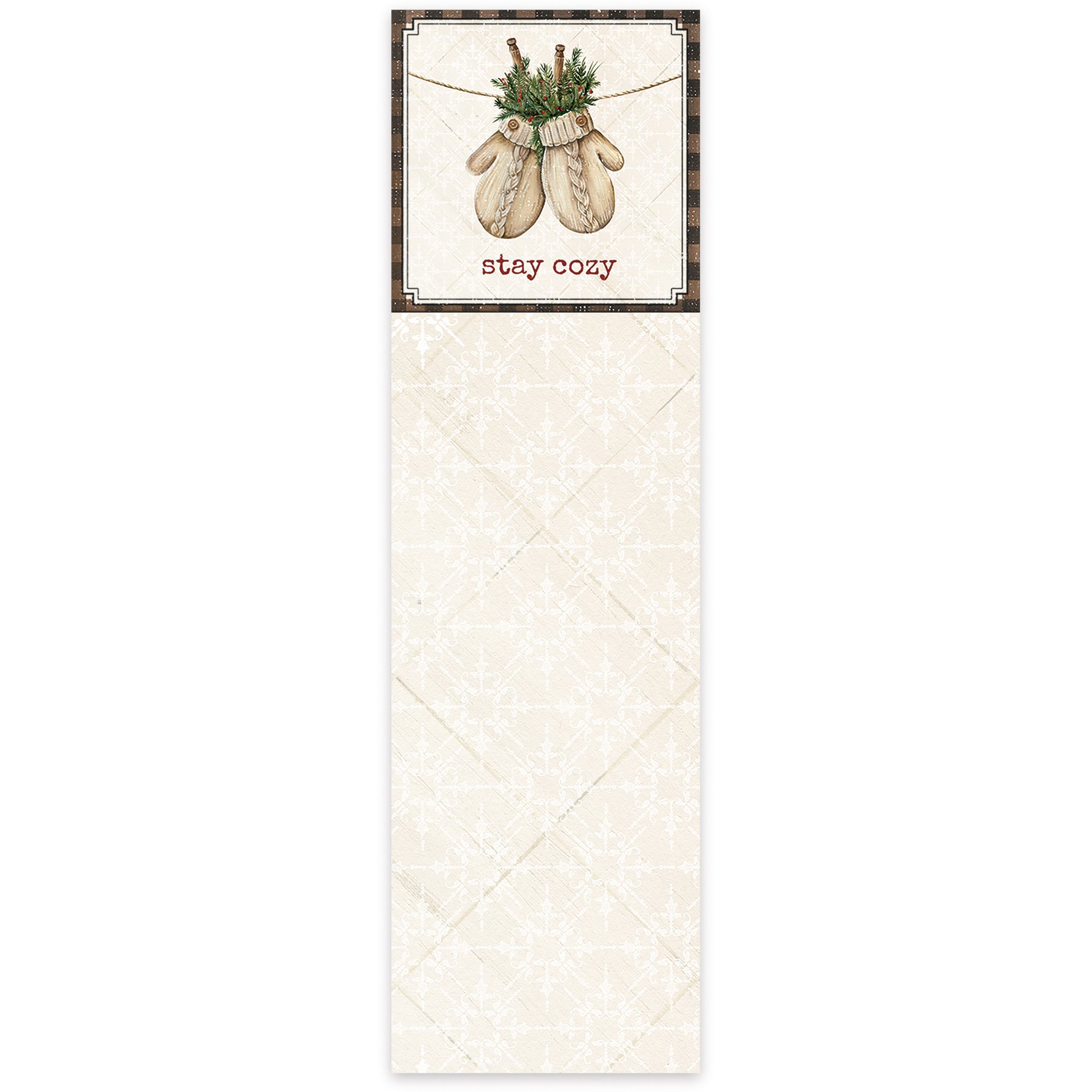 A magnetic paper list notepad from our Christmas Collection featuring a "Stay Cozy" sentiment with mittens and bristled branch designs. Complements well with coordinating styles for a cozy and cohesive collection. The Stay Cozy list pad contains 60 pages and strong back magnet. Made in USA.