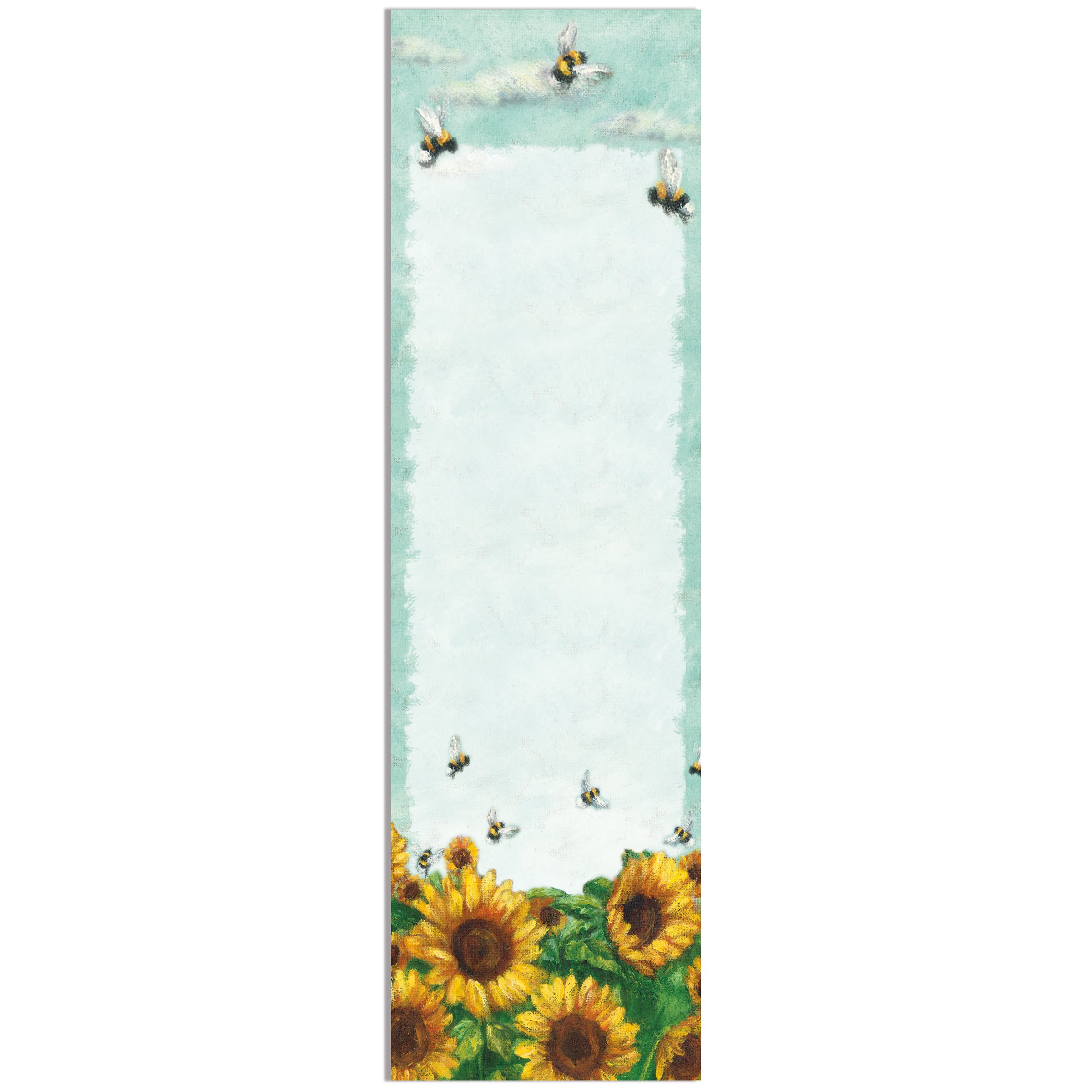 A list notepad from our Garden Collection displaying a hand painted design of a bees in the sky and a field of sunflowers with a decorative space to write in between. Sunflower inspired design is replicated from original artwork painted onto burlap canvas, giving the art a unique depth and texture. Our Sunflower Bees list pad includes 60 pages and a strong magnet to easily hang on magnetic surface for display. Proudly made in the USA. A garden-themed everyday accessory perfect for adding functional style to any space.