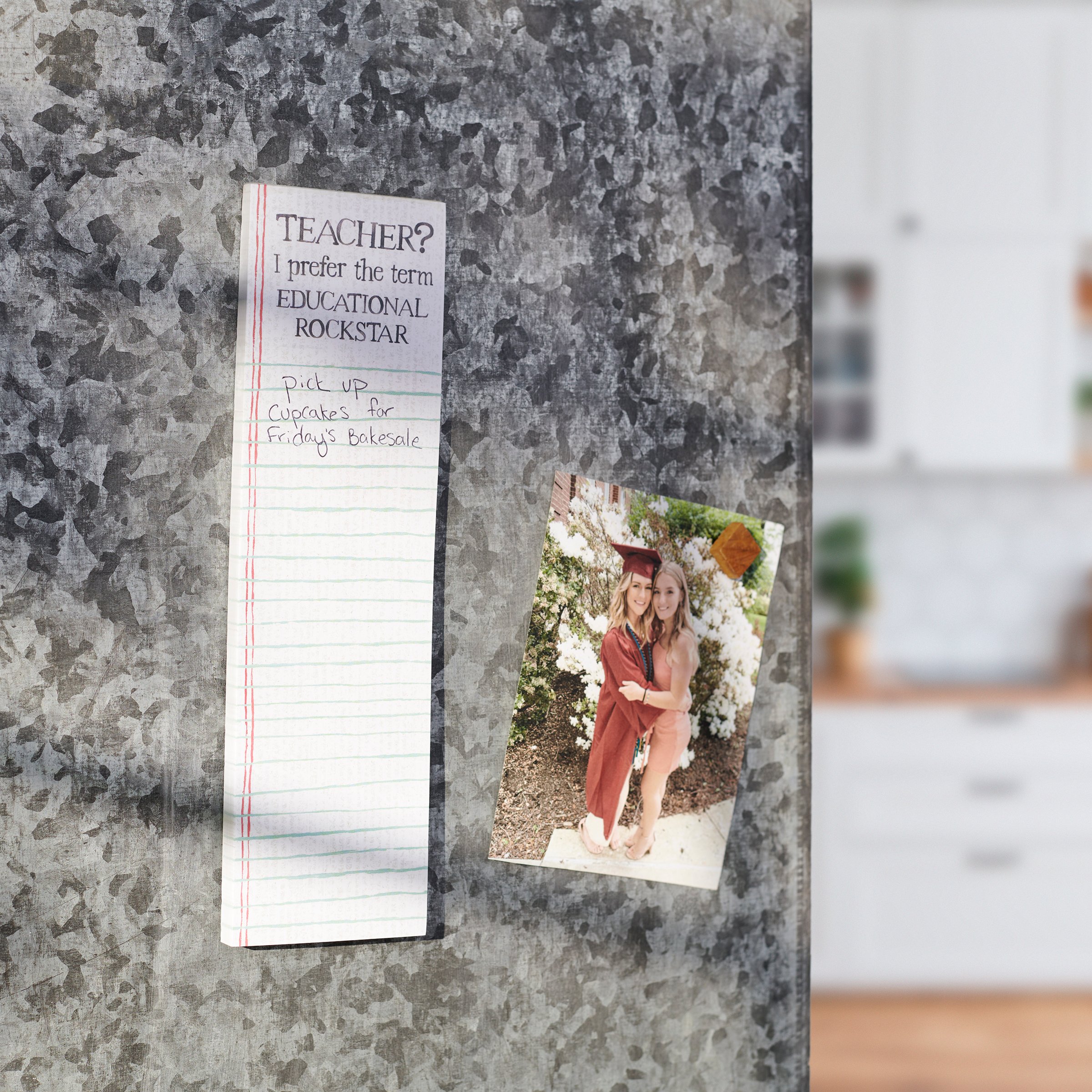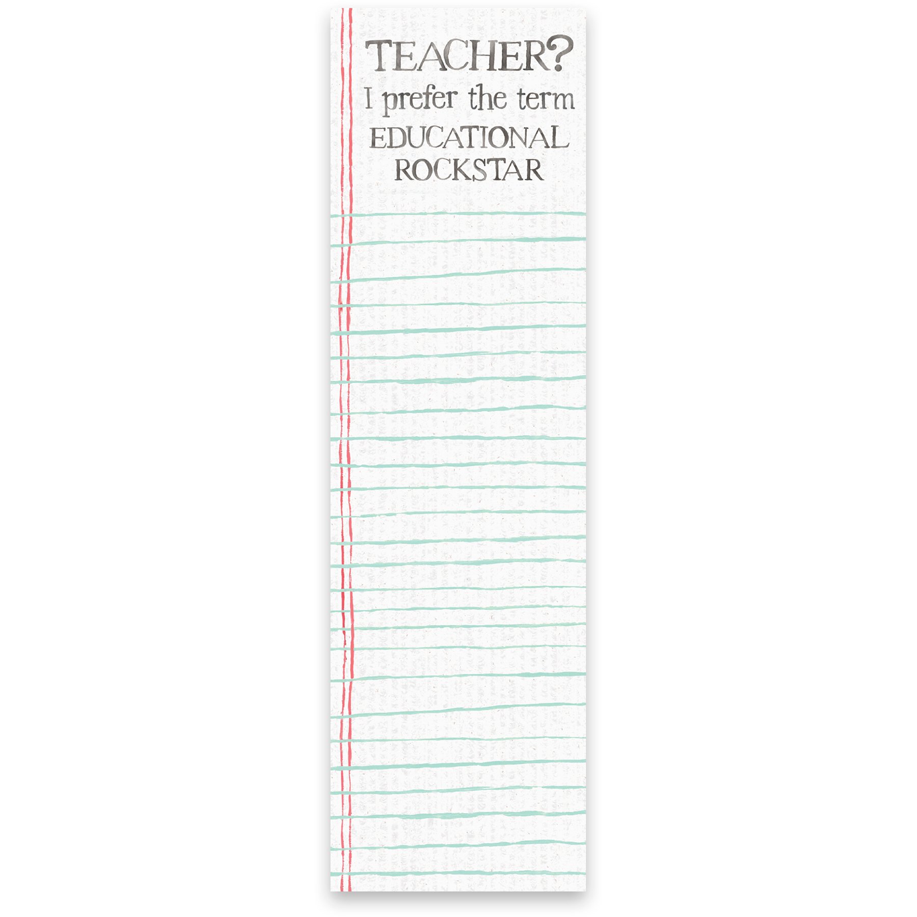 A magnetic list notepad featuring a watercolor "Teacher? I Prefer The Term Educational Rockstar" sentiment and background design to resemble lined notebook paper. Includes 60 pages and strong magnet. Complements well with other pieces in collection to create a cohesive display. Made in the USA.