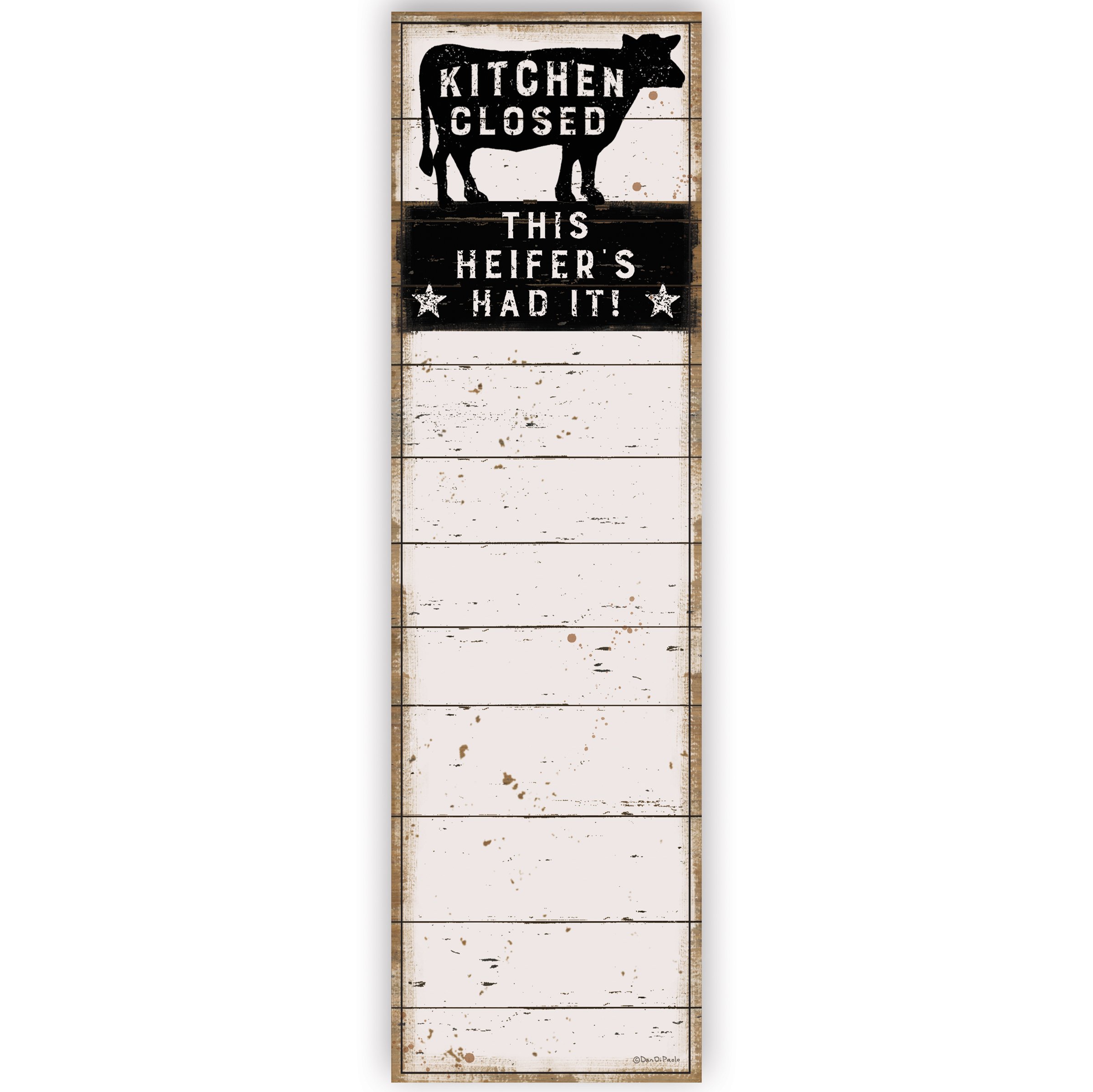 A list notepad from our Farmhouse Collection displaying a rustic design of a cow with a fun farm inspired sentiment that reads "Kitchen Closed - This Heifer's Had It!" and a decorative space underneath for writing. Our This Heifer's Had It list pad includes 60 pages and a strong magnet to easily hang on magnetic surface for display. Proudly made in the USA. A rustic farm-themed gift perfect for adding functional style to any space.