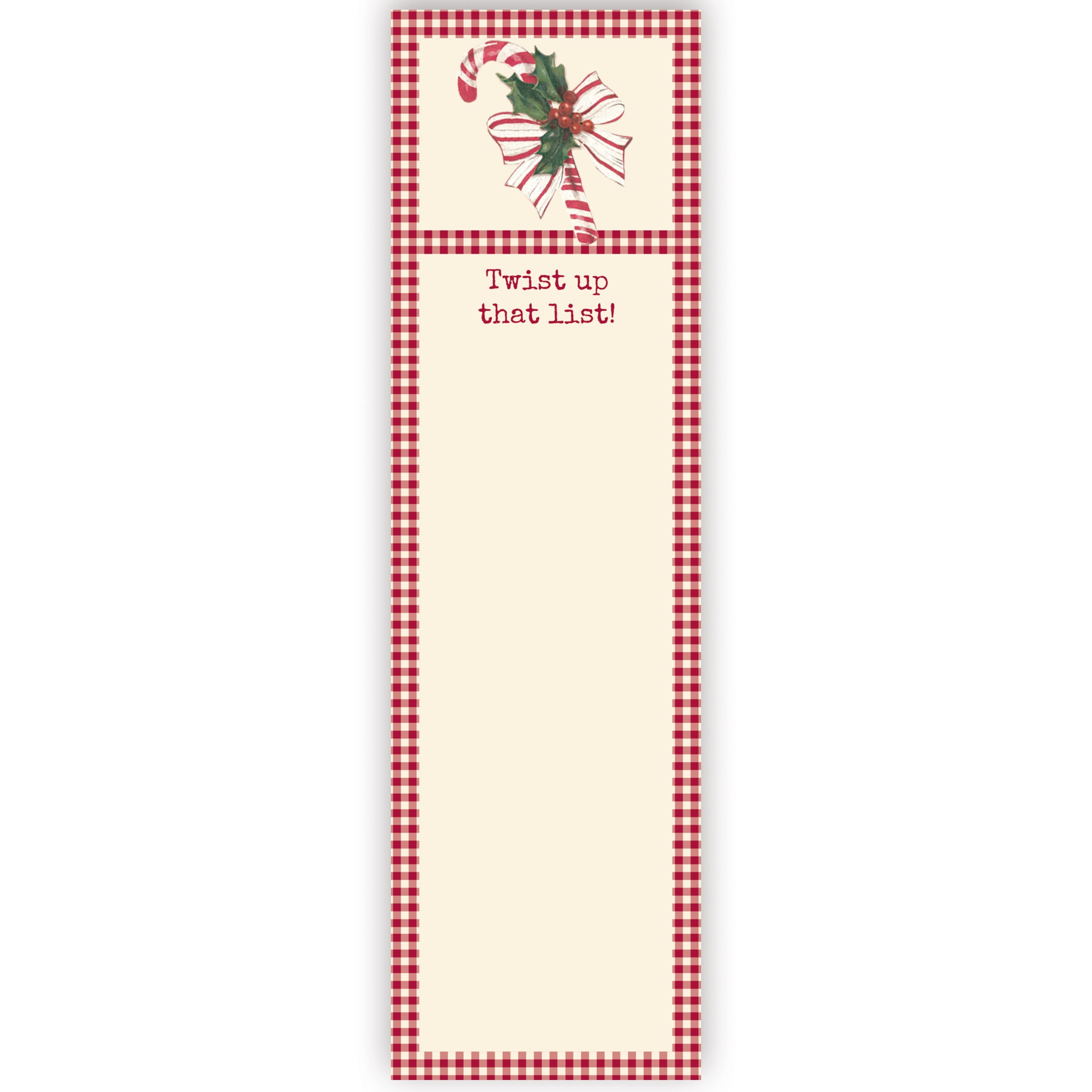 A list notepad from our Christmas Collection displaying vintage art of a candy cane and bow with a red gingham border around a blank writing space and a fun holiday sentiment that reads "Twist Up That List!" Our Twist Up That List pad includes 60 pages and a strong magnet to easily hang on magnetic surface for display. Proudly made in the USA. A fun Christmas gift perfect for adding functional style to any space.