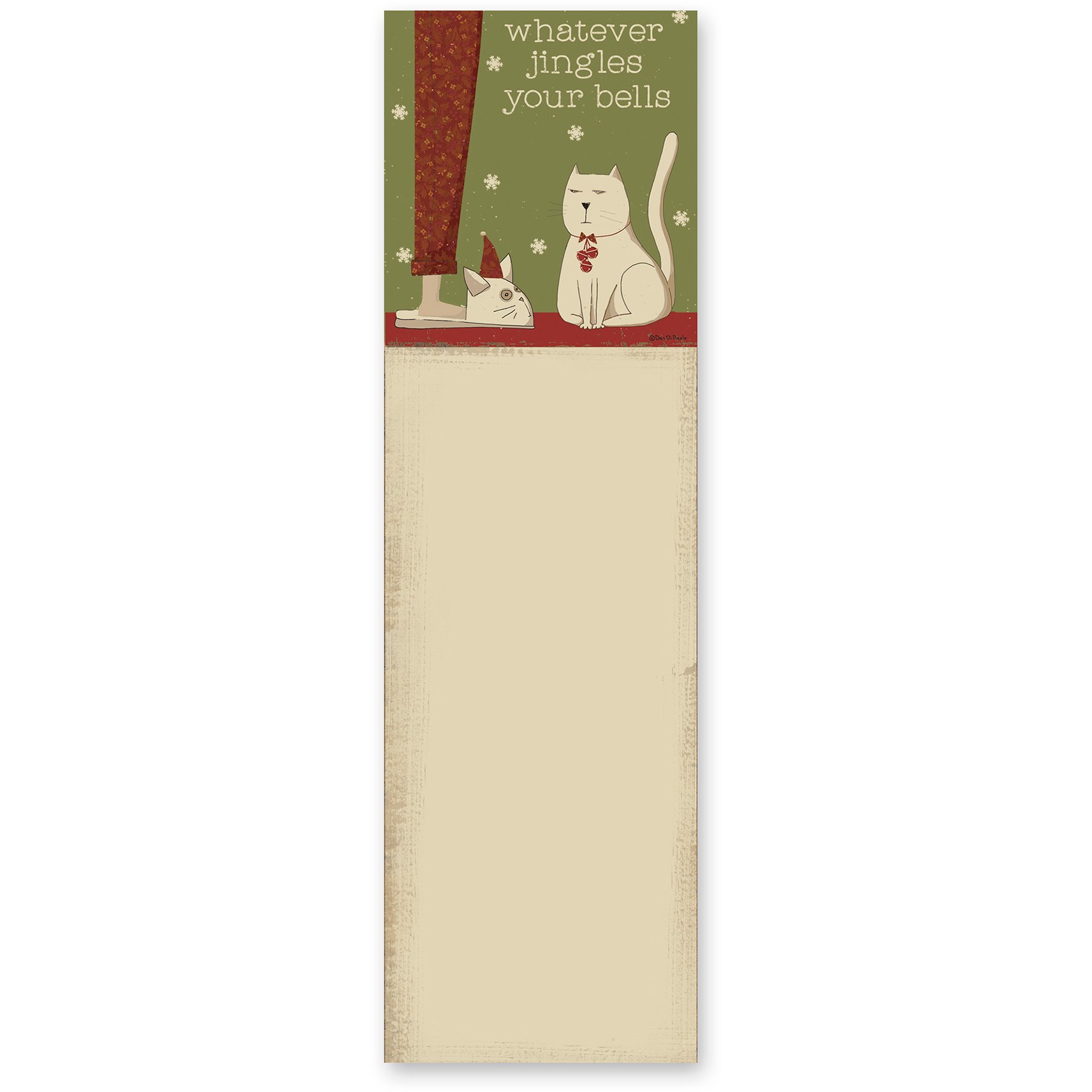 A list notepad displaying a rustic holiday design of a sassy cat wearing holiday bells and a fun seasonal sentiment that reads "Whatever Jingles Your Bells" with decorative space to write underneath. Our Jingles Your Bells list pad includes 60 pages and a strong magnet to easily hang on magnetic surface for display. Proudly made in the USA. A fun pet-themed gift perfect for adding seasonal style and function to any space.