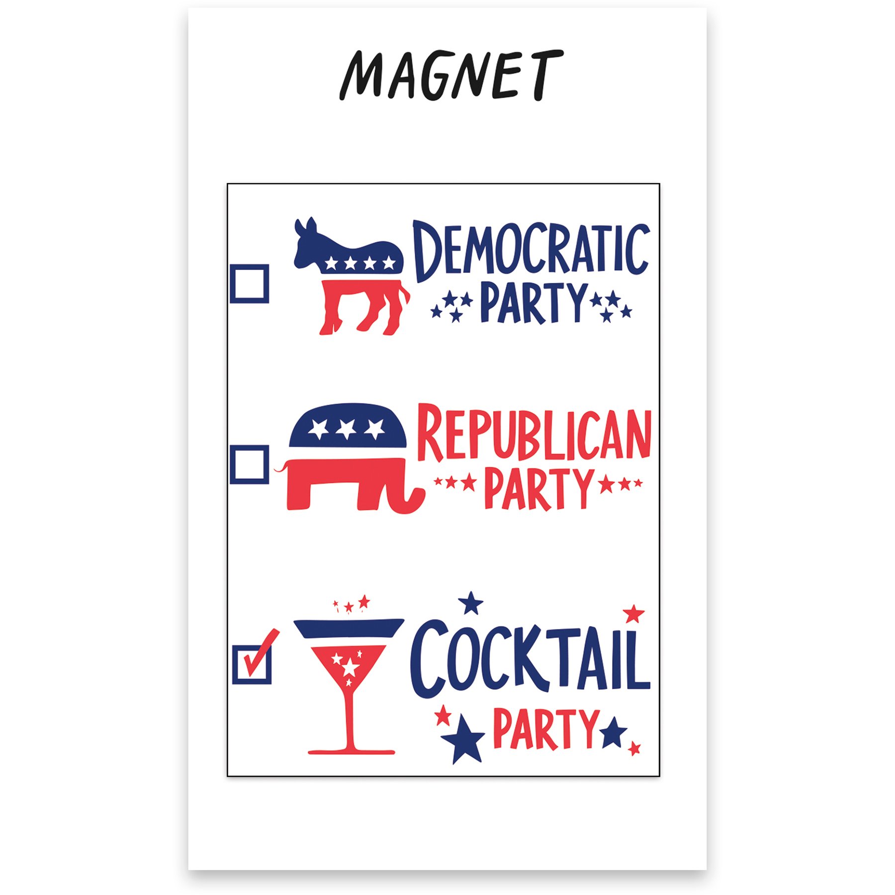 A magnet featuring a check list design and "Democratic Party Republican Party Cocktail Party" sentiment on a white palette. Magnet is waterproof, UV protected, and ultra-strong.