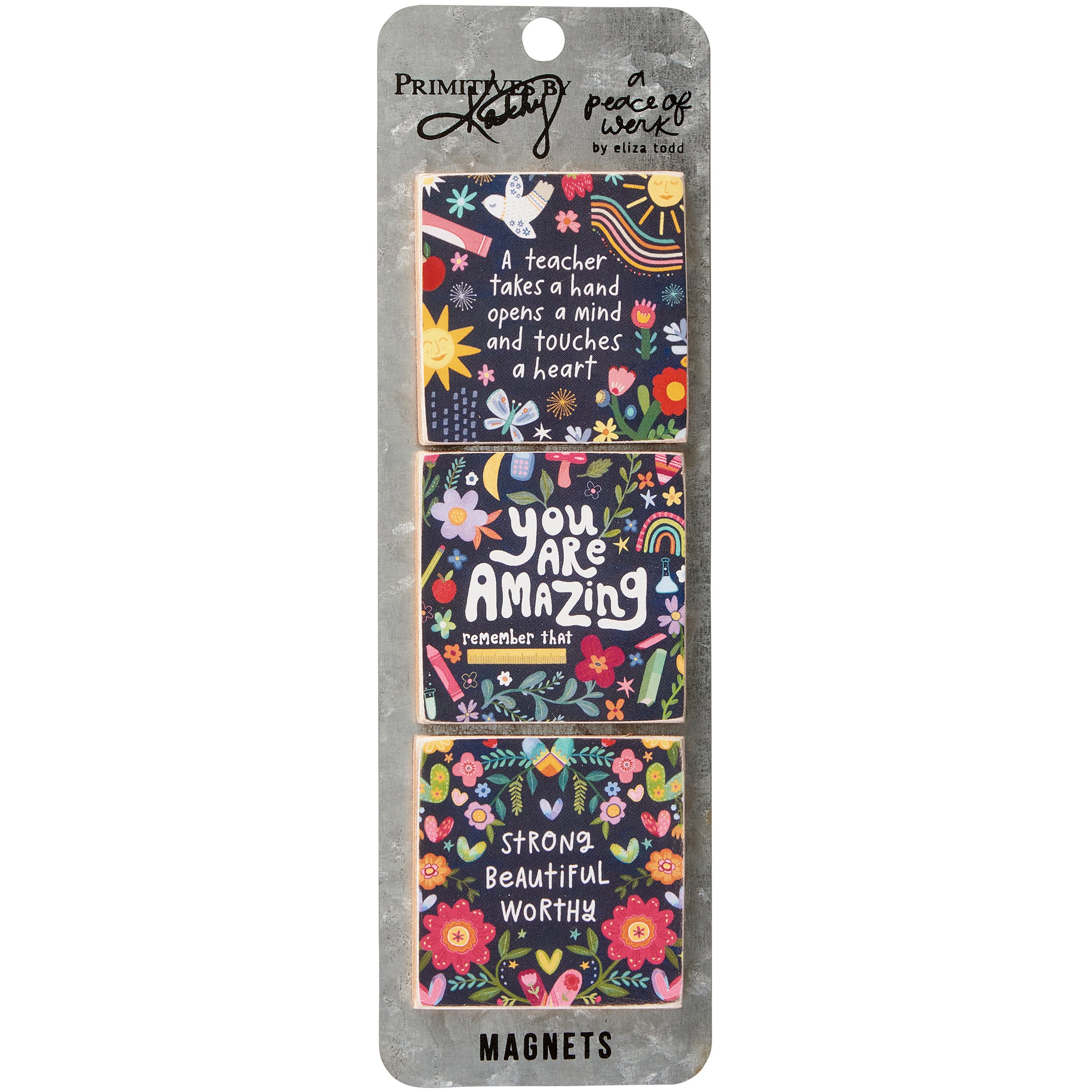 A set of three wooden magnets from our Teacher Collection displaying vibrant hand illustrated designs of flowers, birds, and classroom objects surrounding inspirational teacher-themed sentiments on each. Sentiments read "A Teacher Takes A Hand Opens A Mind And Touches A Heart," "You Are Amazing - Remember That," and "Strong Beautiful Worthy." Our Amazing magnet set is packaged on a galvanized metal card inside a poly bag for easy rack display and gifting. An inspirational teacher-themed gift perfect for everyday home or classroom display.