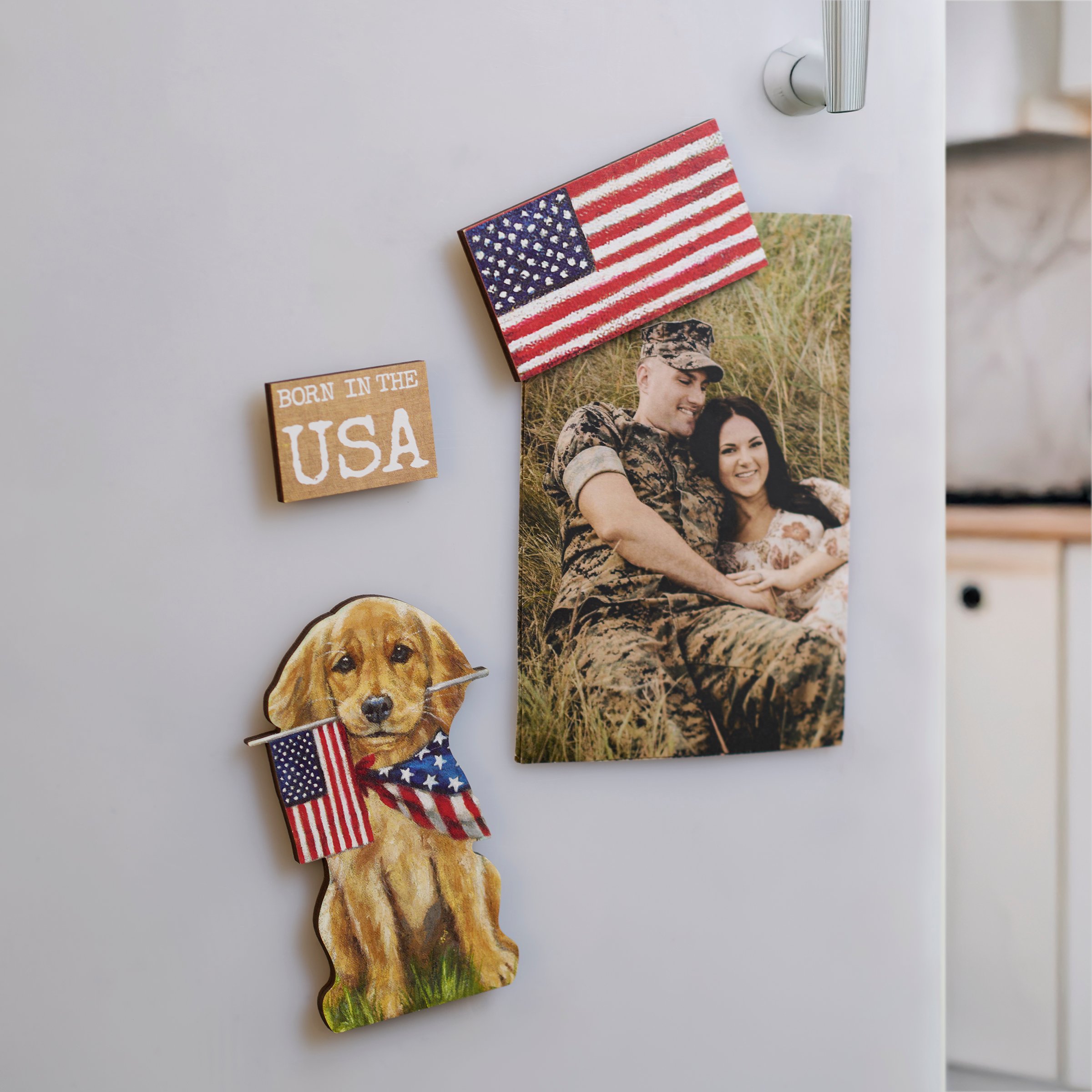 A set of 3 wooden magnets from our Patriotic Collection displaying rustic American flag inspired designs on each as well as a patriotic sentiment. Patriotic designs include an American flag, a patriotic golden retriever puppy, and a "Born In The USA" sentiment all replicated from original artwork painted onto burlap canvas, giving the art a unique depth and texture. Our Born In The USA magnet set is placed on a patriotic blue metal card and packaged in a poly bag making it great for gifting with a hole in the card for easy store rack display. A set of patriotic home accents perfect for 4th of July and Memorial Day decorating or celebrating stars and stripes all year round.