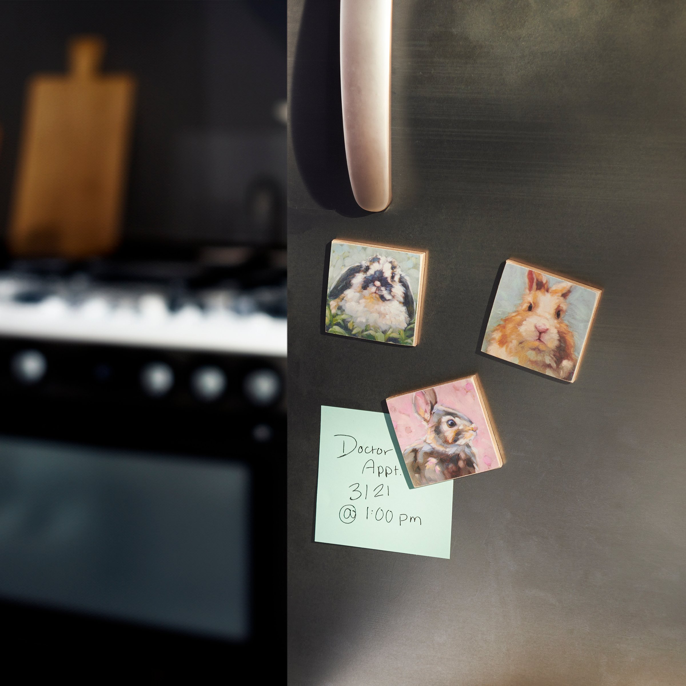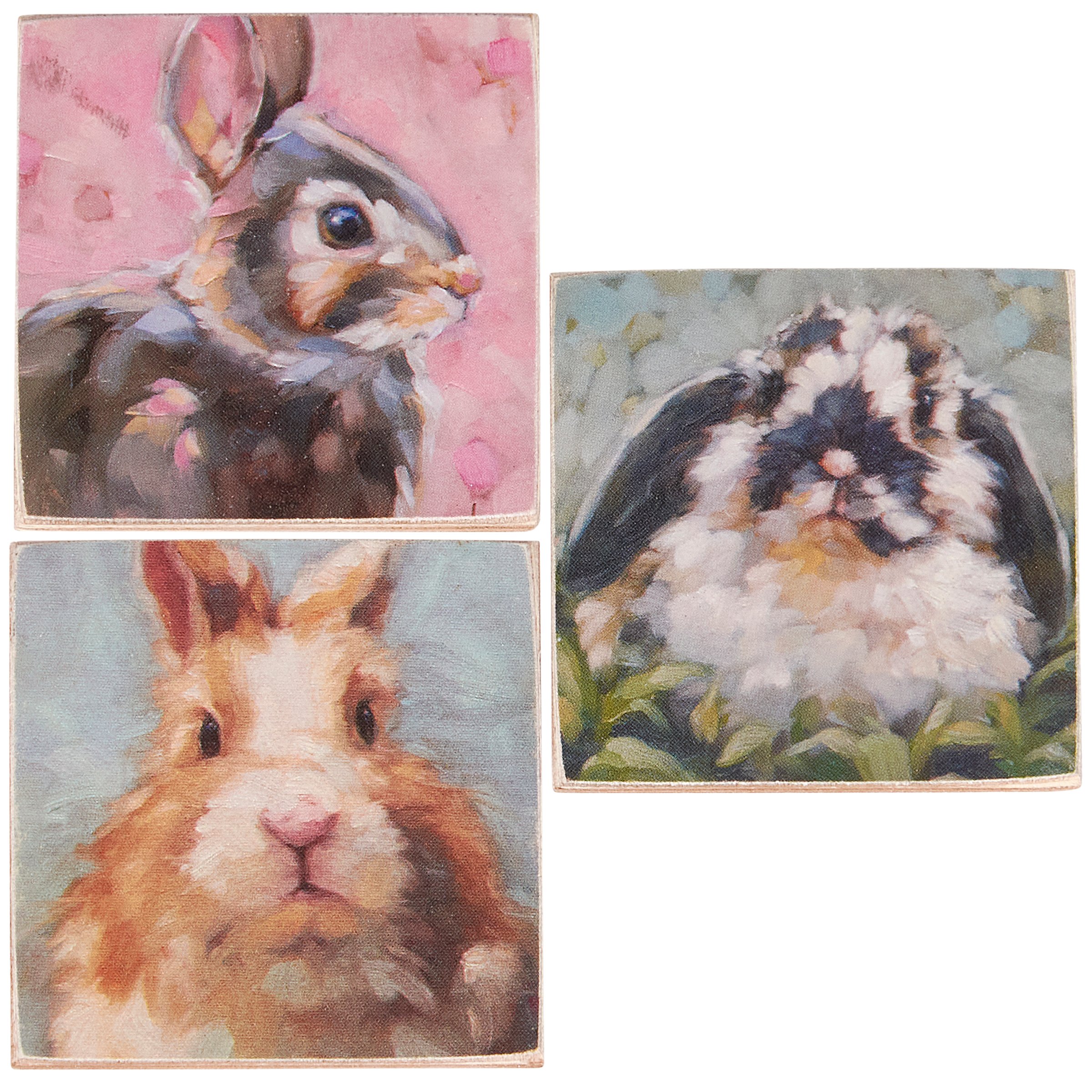 A set of 3 wooden magnets from our Easter & Spring Collection displaying charming scenes of various bunnies on each magnet with distressed details for a rustic touch. Designs are replicated from original artwork hand painted in a unique textured style. Our Bunny magnet set is packaged on a galvanized metal card and in poly bag for easy store display and gifting. A gift set of spring-themed home accents with a variety of display options.