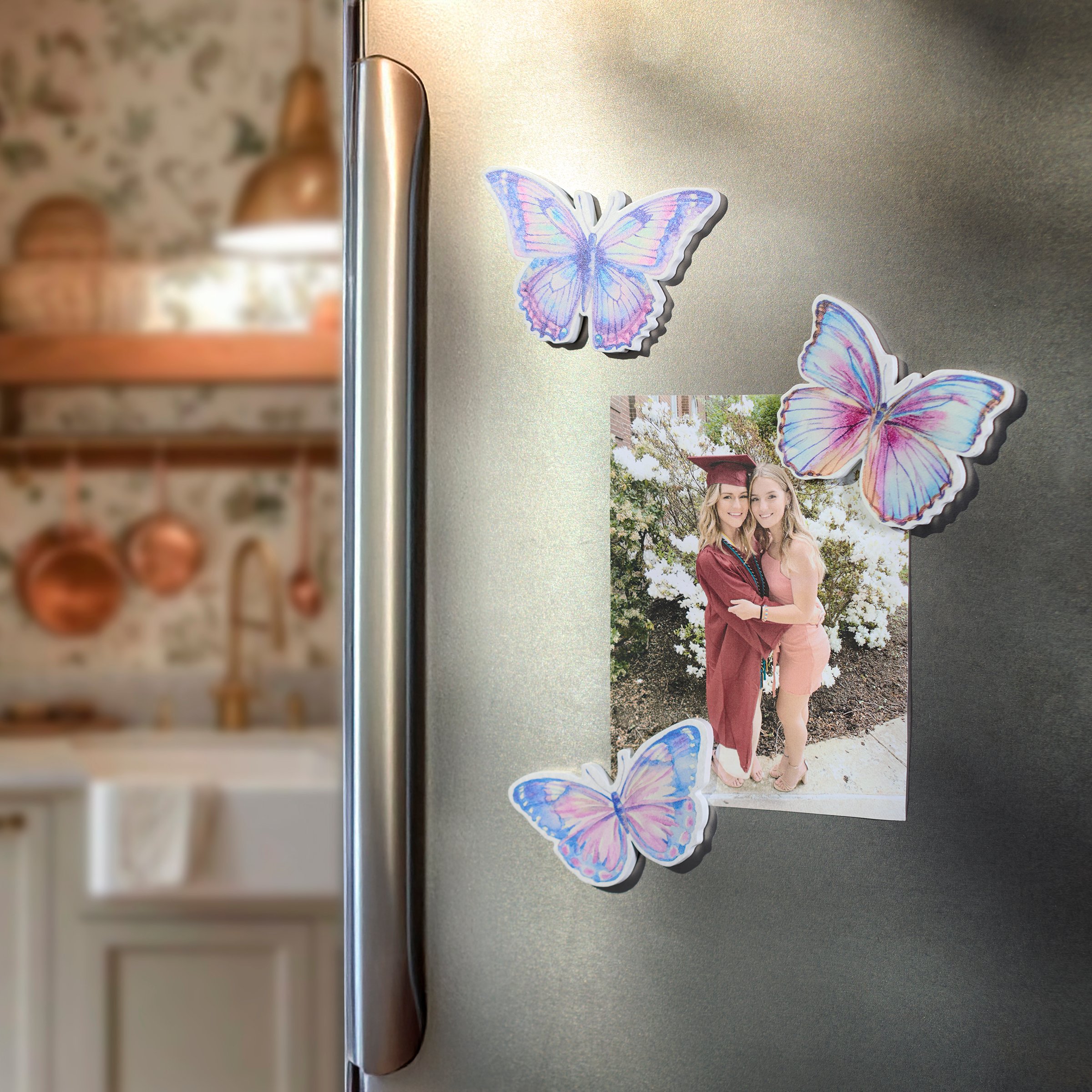 A set of 3 wooden magnets from our Garden Collection cut in the shape of the displayed butterfly designs featuring vibrant colors and coordinating cream color on the sides and back. Each stylish butterfly design is replicated from original art hand painted in an elegant watercolor style. Our Butterflies magnet set is placed on a sturdy light purple metal card and packaged in a poly bag making it great for gifting with a hole in the card for easy store rack display. A stylish butterfly-themed gift with a variety of display options.