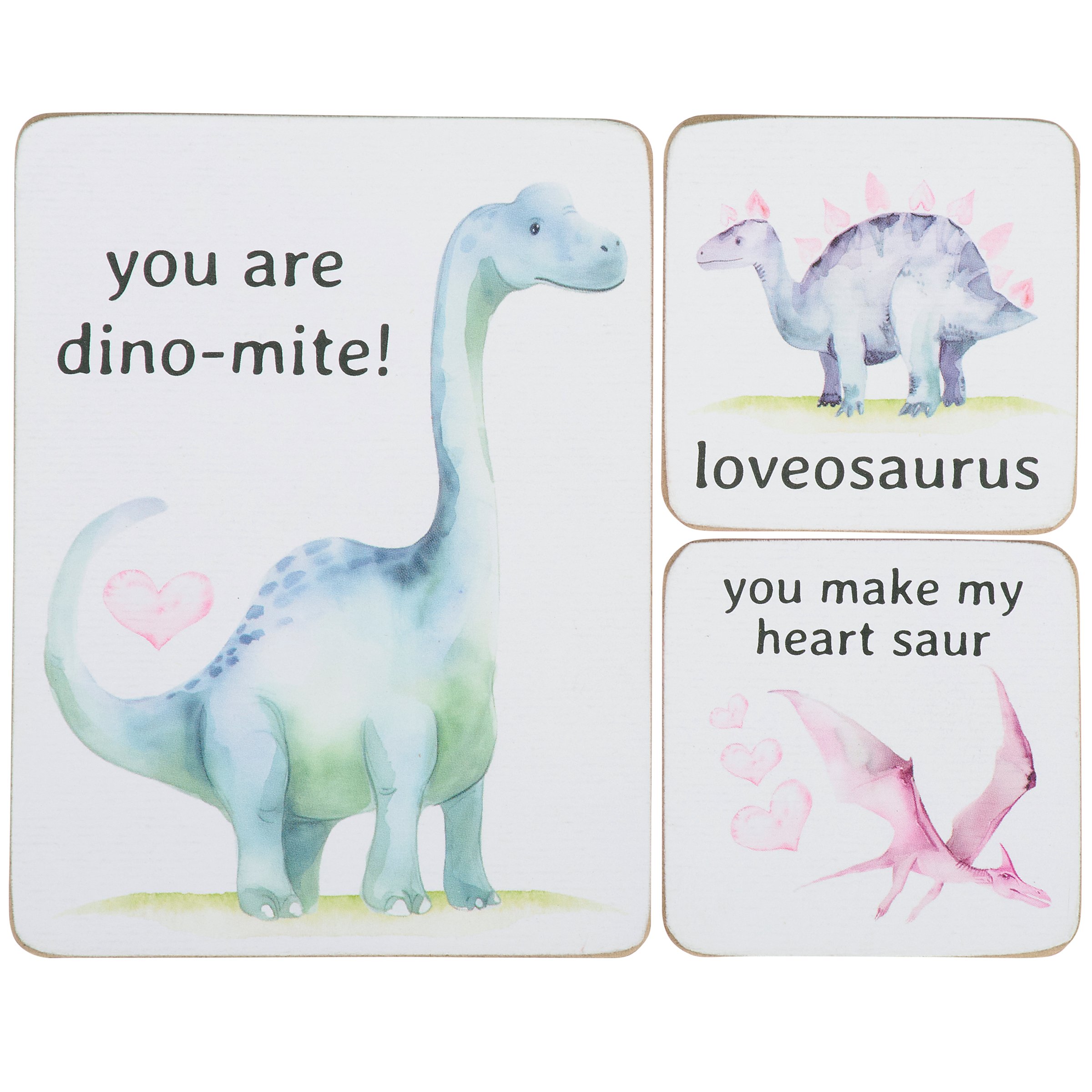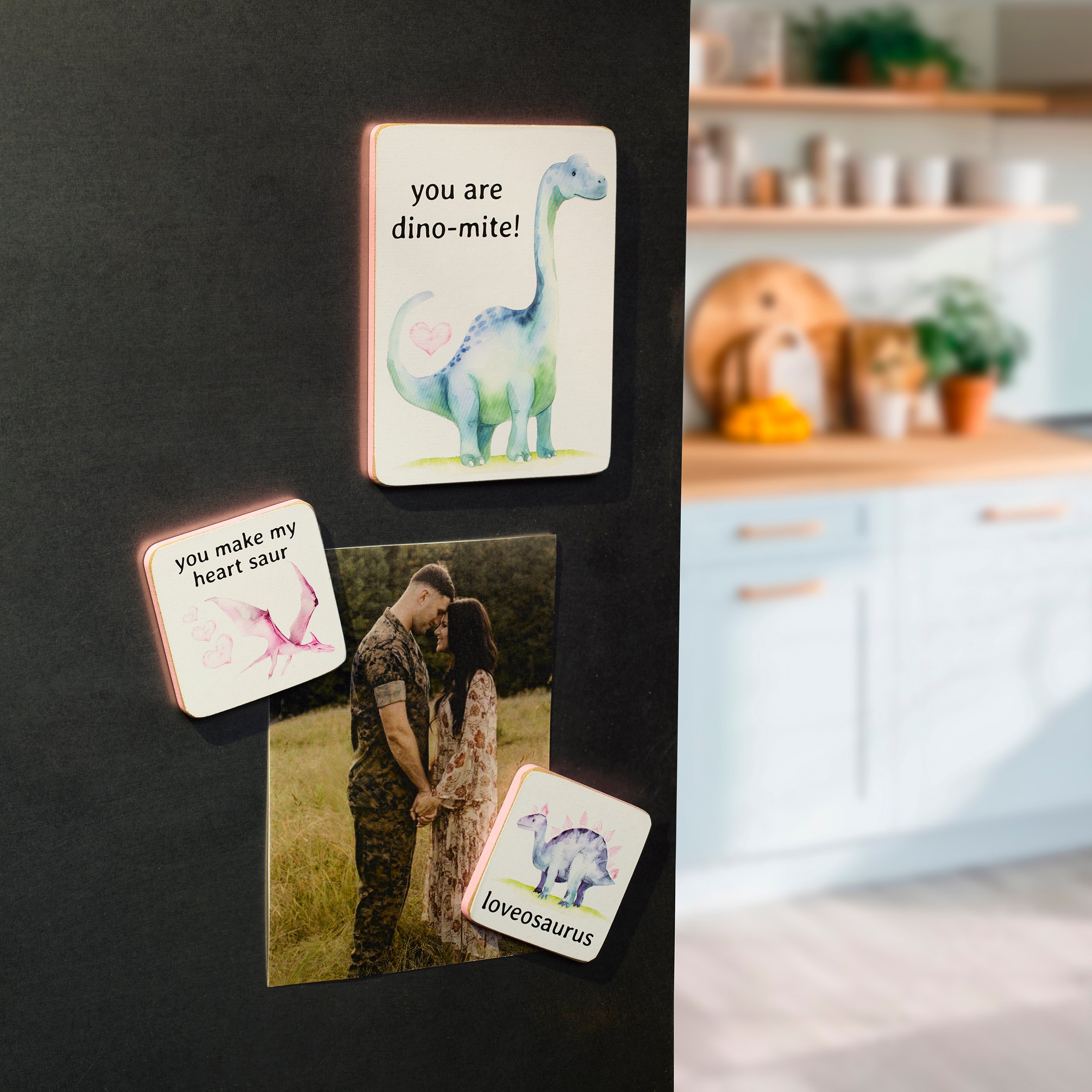 A set of 3 wooden magnets from our Valentine's Day Collection displaying cute dinosaur themed designs with love-themed dinosaur puns on each. Dinosaur puns read "Loveosaurus," "You Make My Heart Saur," and "You Are Dino-mite!" Our Dino-mite magnet set is placed on a vibrant blue metal card and packaged in a poly bag making it great for gifting with a hole in the card for easy store rack display. A set of cute dinosaur inspired home accents that offers a fun alternative for Valentine's Day decorating.