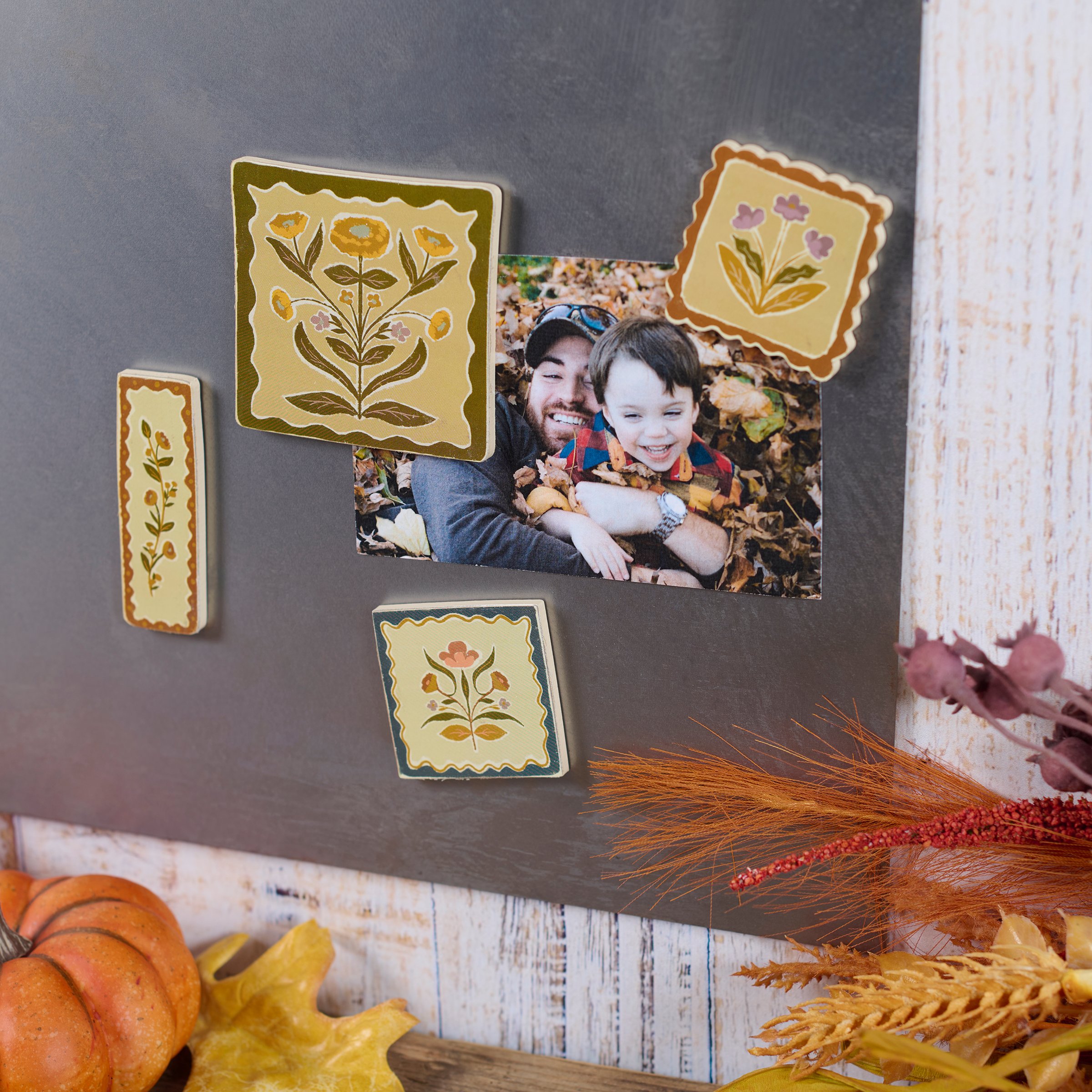 A set of 4 wooden magnets from our Fall & Harvest Collection featuring coordinating designs displaying folk art inspired fall florals replicated from original art hand painted in a unique watercolor style. Our Fall Folk Floral magnet set is placed on a tan metal card and packaged in a poly bag making it great for gifting with a hole in the card for easy store rack display. A set of folk art fall home accents perfect for adding personality to any space.