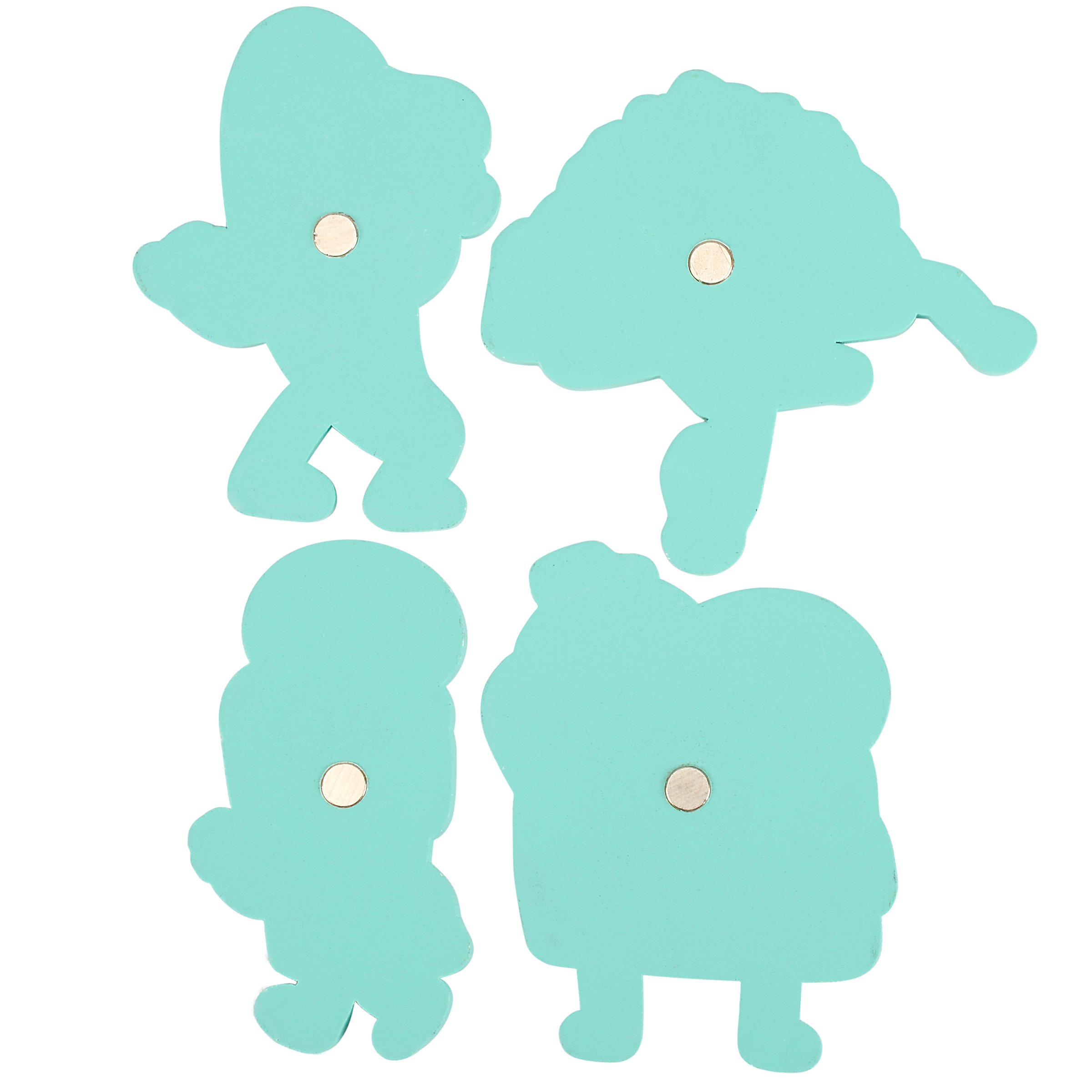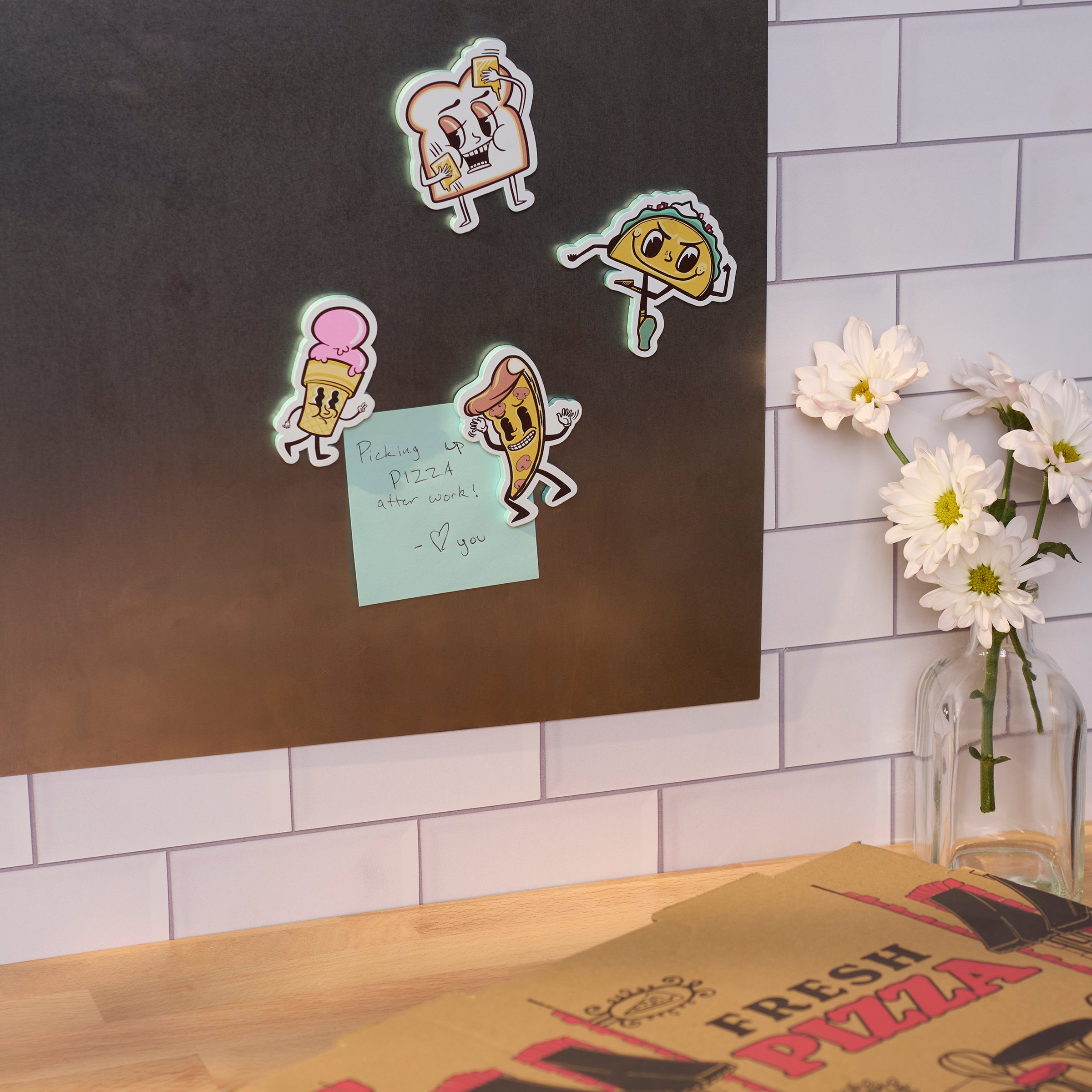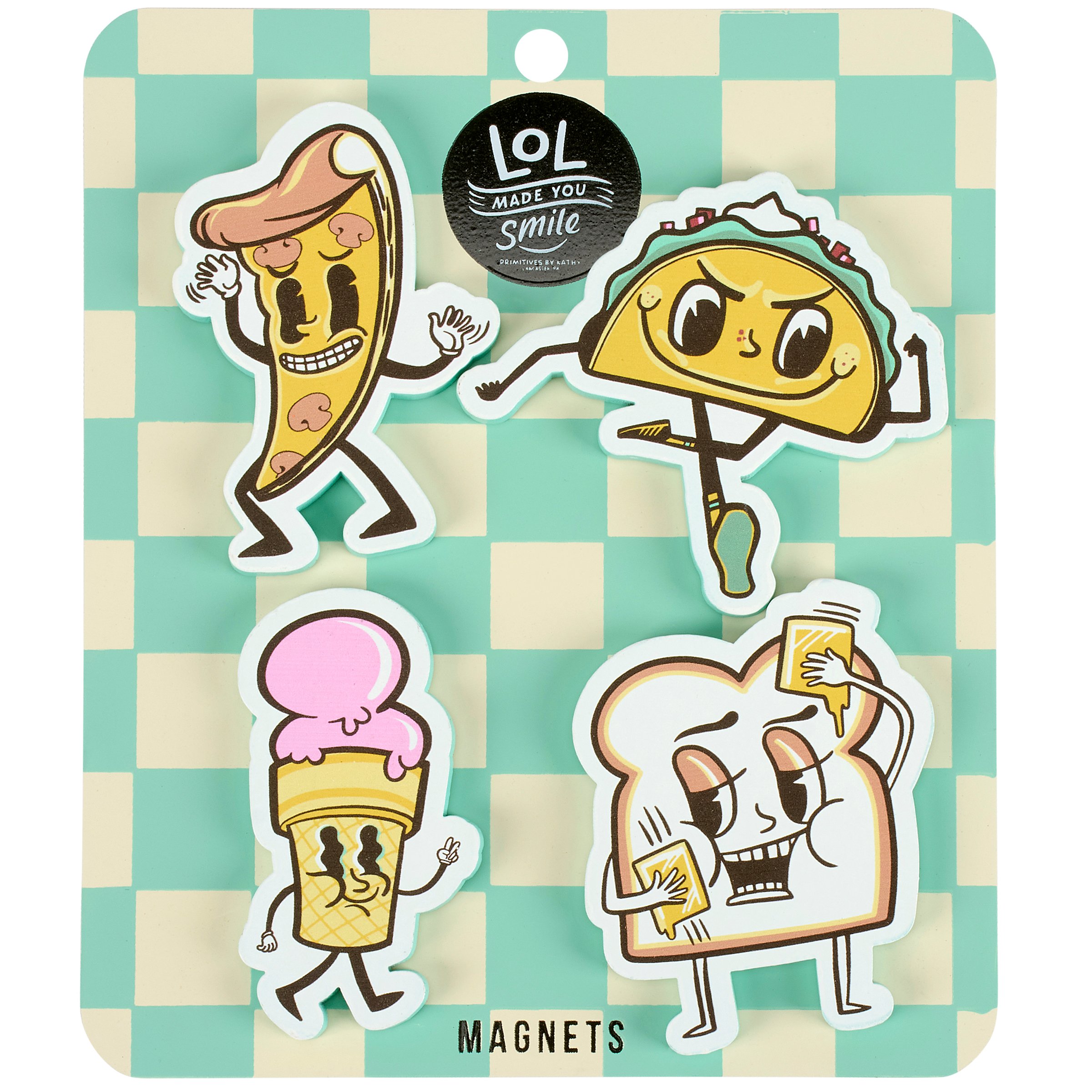 A set of 4 wooden magnets from our LOL-Made You Smile Collection cut in the shape of the displayed food character designs hand illustrated in a fun retro style with coordinating retro green color on the sides and back. Retro food-themed magnets include a pizza slice, a taco, an ice cream cone, and buttered toast. Our Food Crew magnet set is placed on a coordinating metal card and packaged in a poly bag making it great for gifting with a hole in the card for easy store rack display. A retro food-themed gift with a variety of display options.