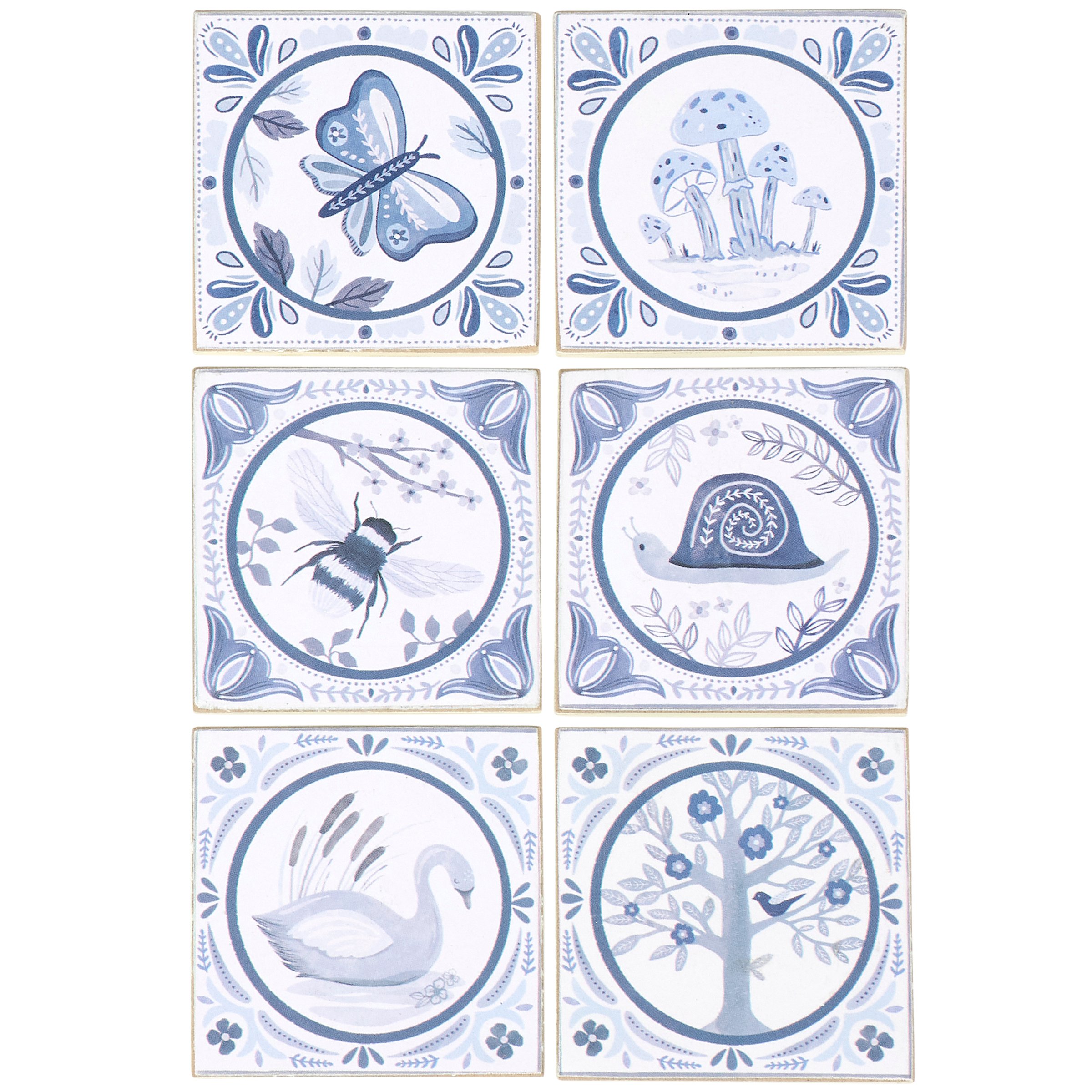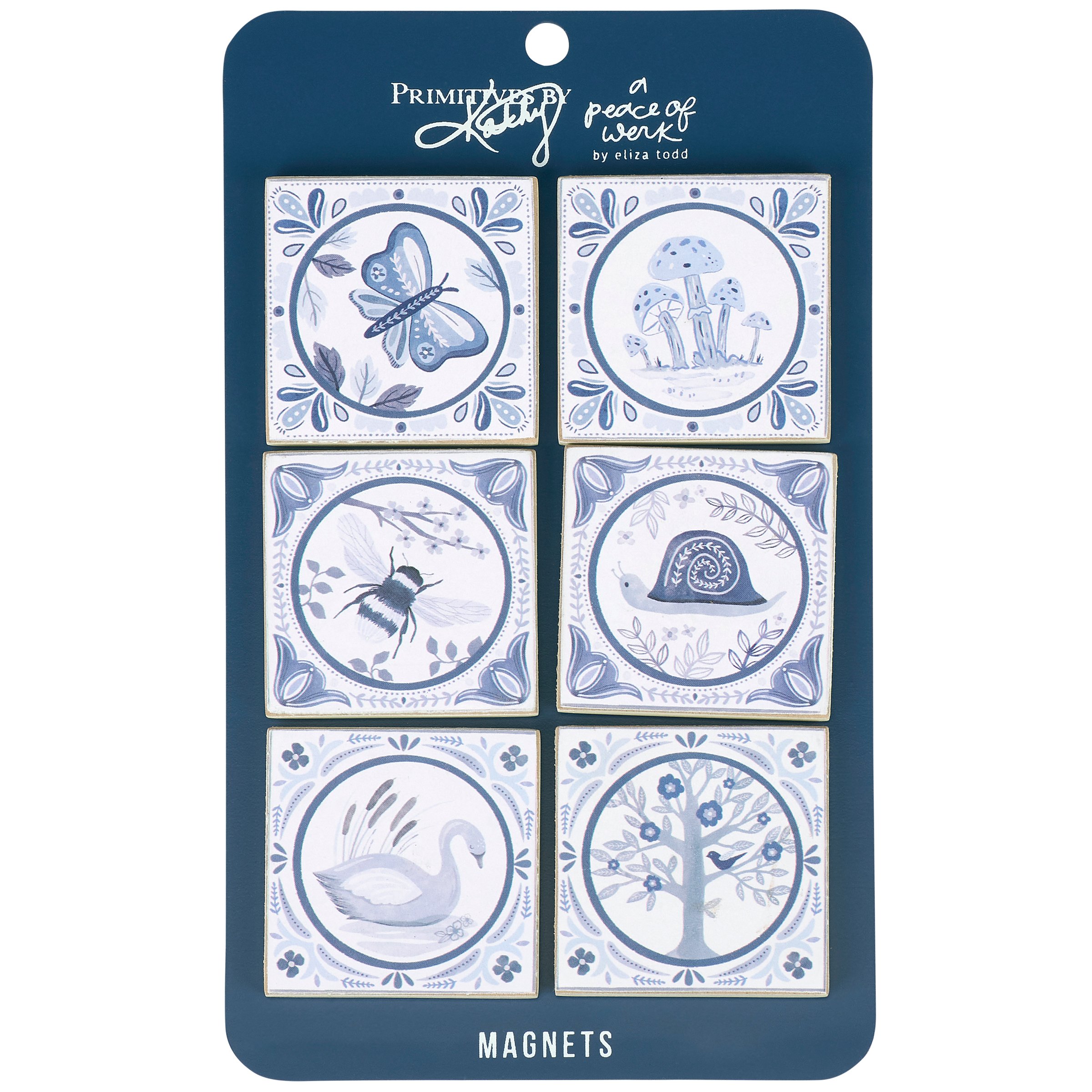 A set of 6 wooden magnets from our Home Collection displaying charming tile inspired designs in a calming indigo color palette. Indigo tile designs feature individual nature scenes inside tile borders all replicated from original hand illustrated artwork. Our Indigo Tiles magnet set is placed on an indigo color metal card and packaged in a poly bag making it great for gifting with a hole in the card for easy store rack display. A set of stylish home accents perfect for adding personality to any space.