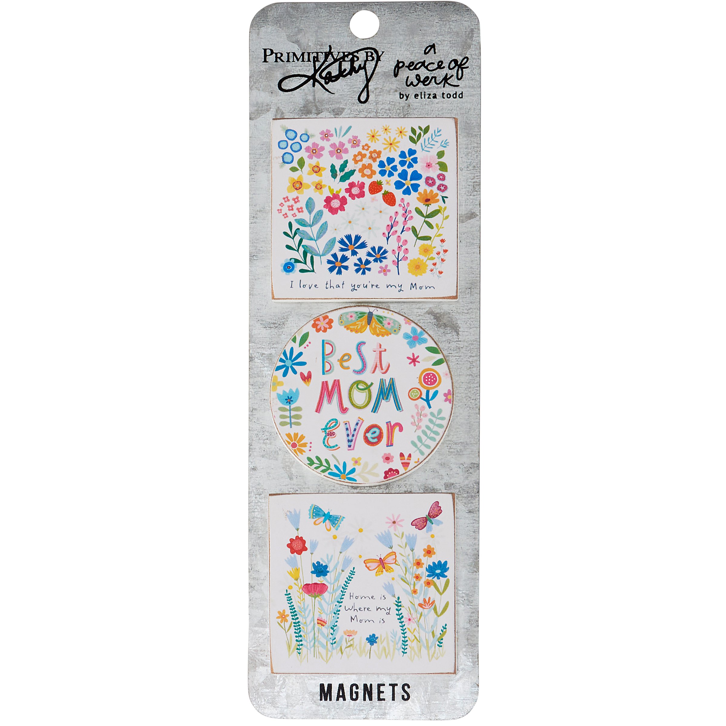 A set of three wooden magnets from our Mother's Day Collection displaying vibrant hand illustrated designs of flowers and nature surrounding heartwarming mom-themed sentiments on each. Sentiments read "I Love That You're My Mom," "Best Mom Ever," and "Home Is Where My Mom Is." Our My Mom magnet set is packaged on a galvanized metal card inside a poly bag for easy rack display and gifting. A lovely gift perfect for Mother's Day or as an everyday home accent.