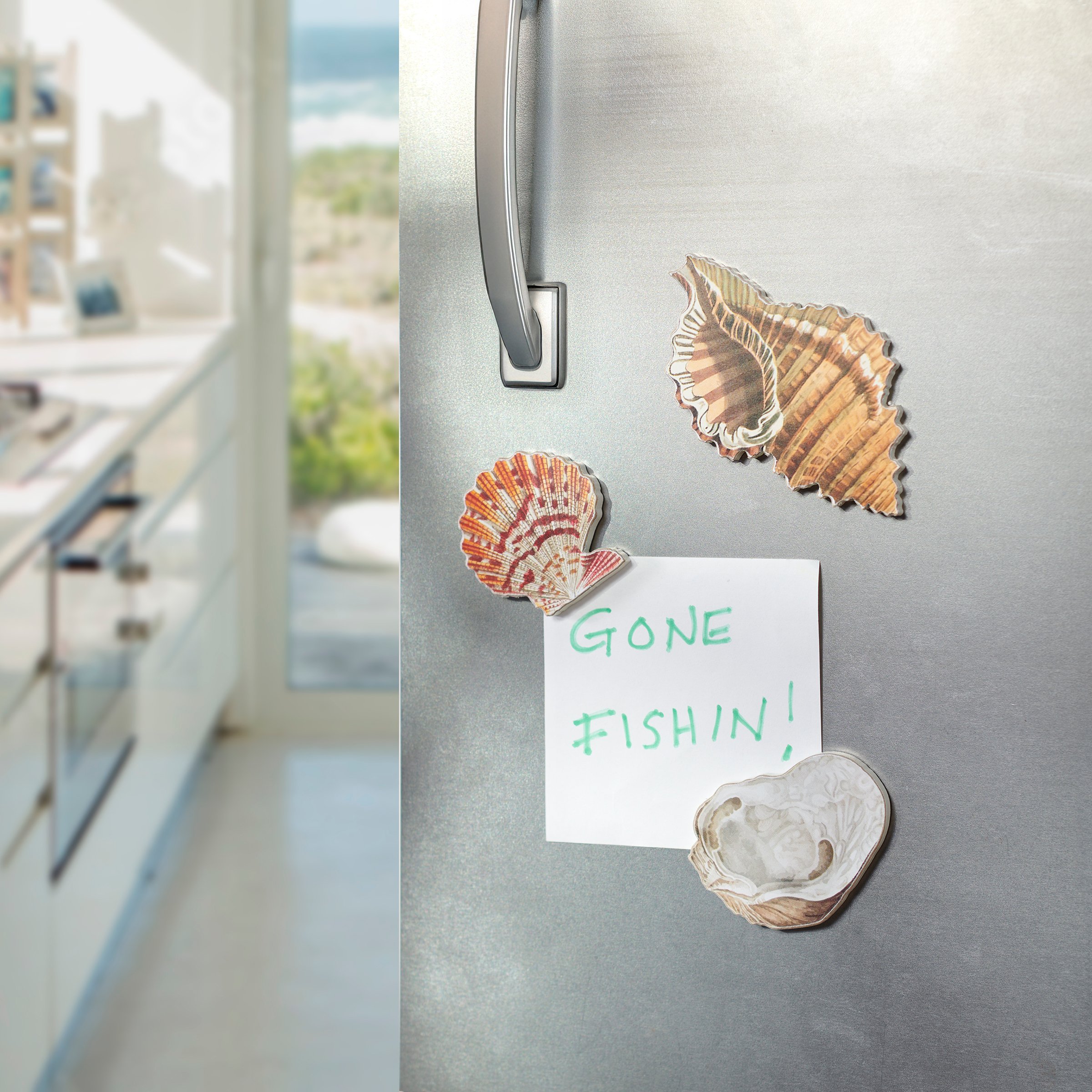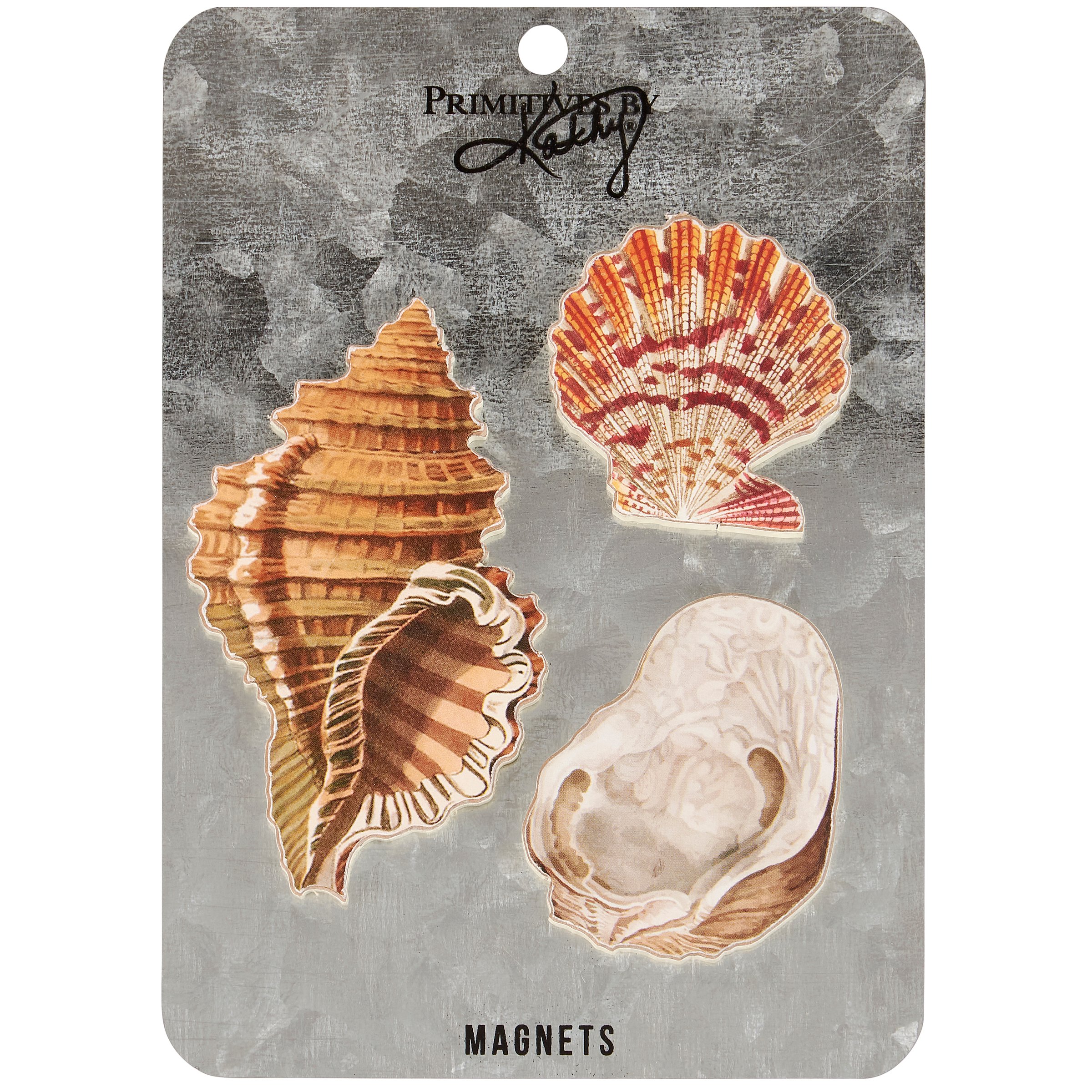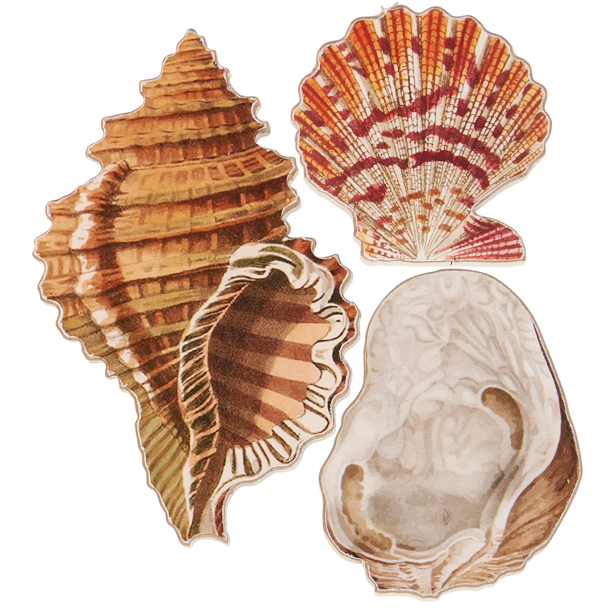 A set of 3 wooden magnets from our Beach Collection cut in the shape of the displayed vintage seashell designs with coordinating cream color on the sides and back. Our Seashell magnet set is placed on a sturdy galvanized metal card and packaged in a poly bag making it great for gifting with a hole in the card for easy store rack display. A vintage beach-themed gift with a variety of display options.