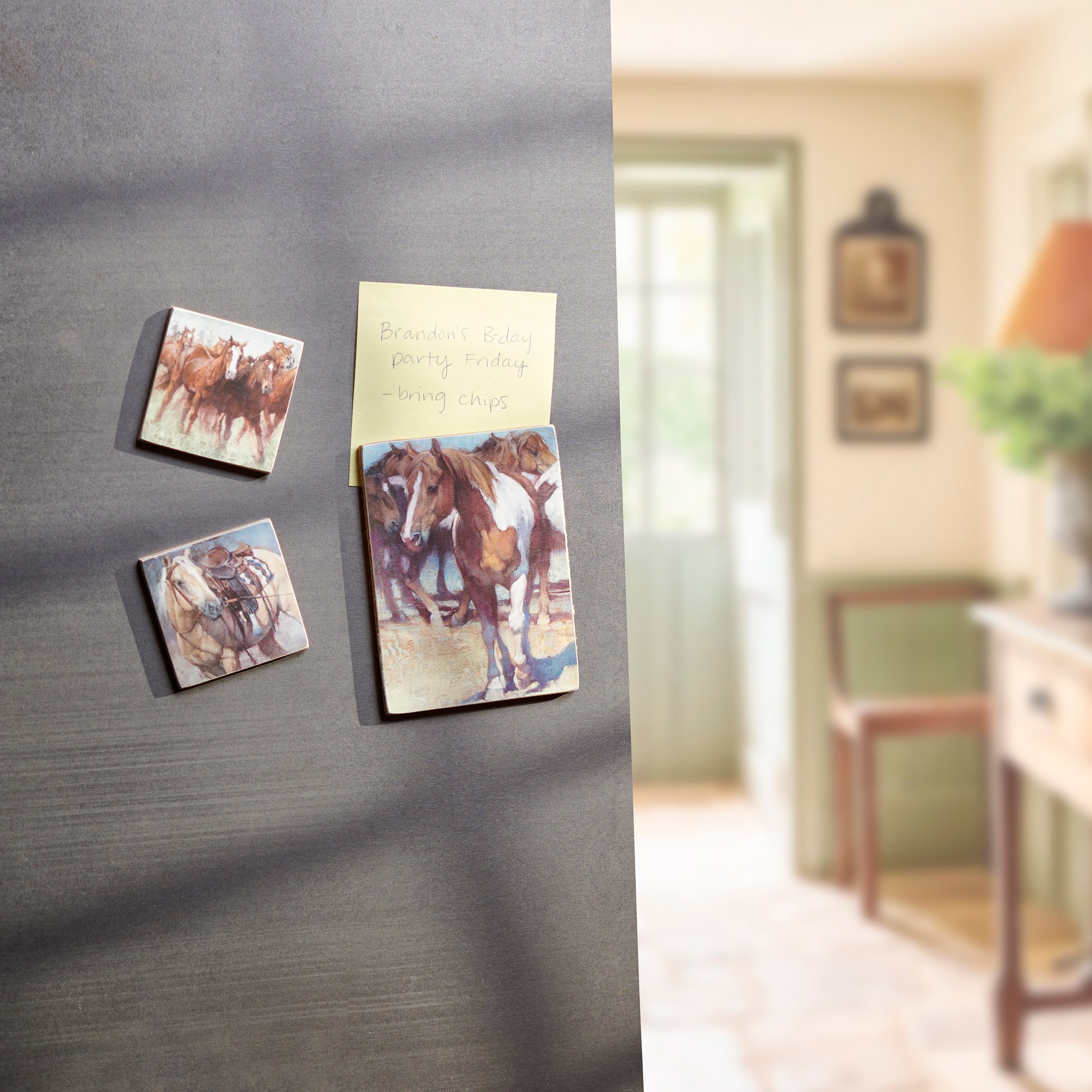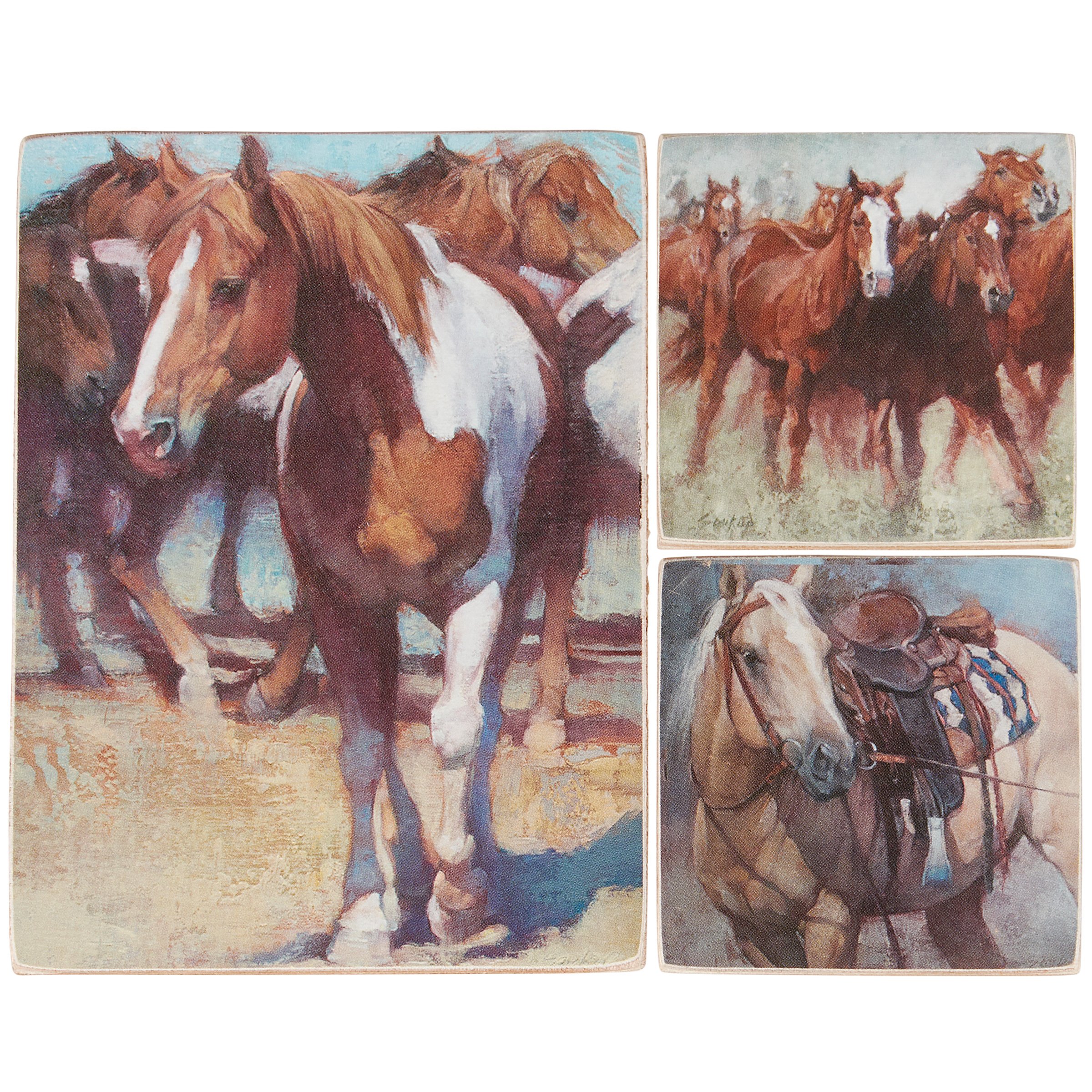 A set of three wooden magnets from our Western Collection displaying hand painted scenes of horses in western-themed scenes. Designs are replicated from original hand painted artwork for added texture. Our Western Horse magnet set is packaged on a galvanized metal card and in poly bag for easy store display and gifting. A gift set of western-themed home accents with a variety of display options.