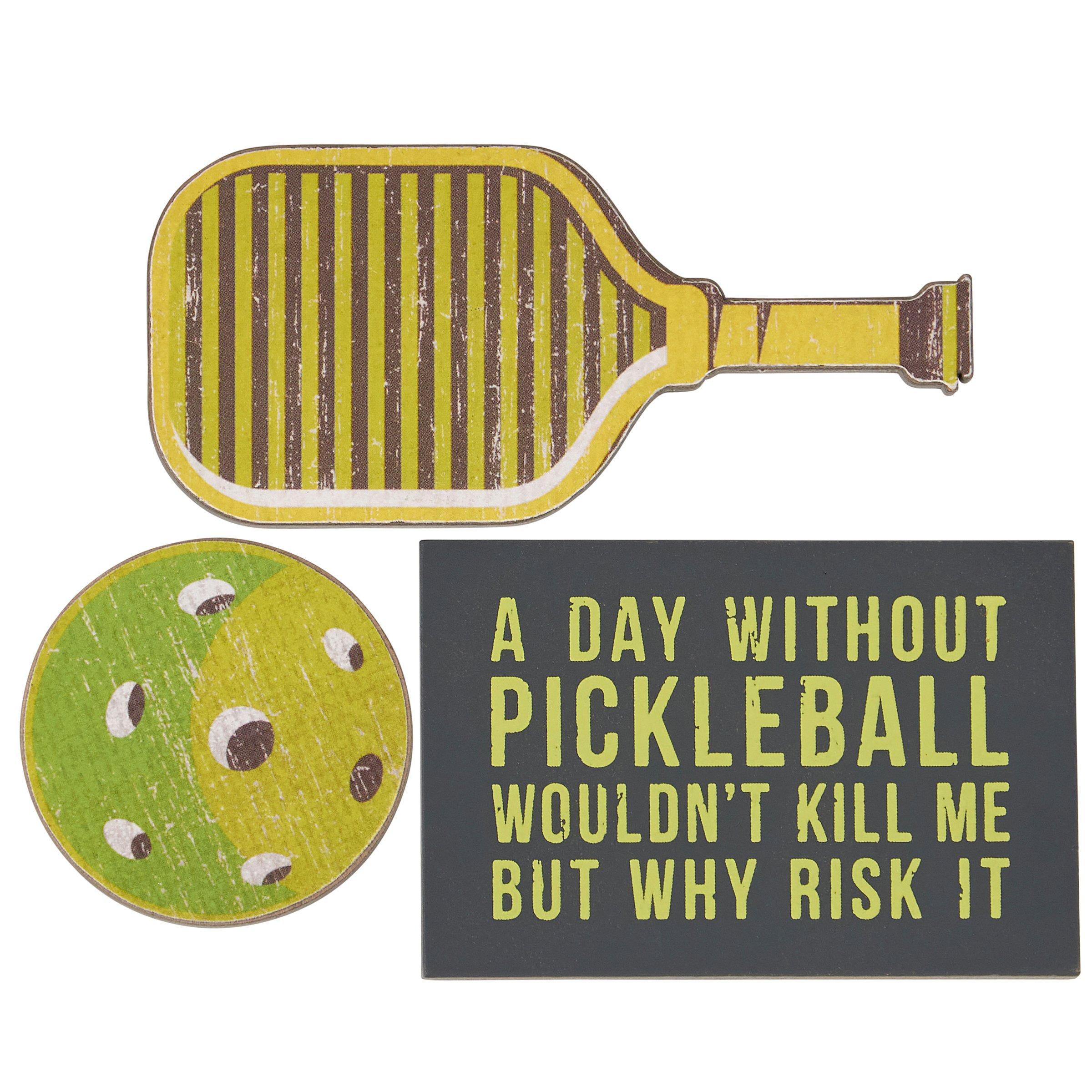 A set of 3 wooden magnets from our Sports Collection cut in the shape of the displayed pickleball inspired designs with coordinating gray color on the sides and back. Pickleball themed magnets include a pickleball paddle, pickleball, and a funny pickleball sentiment that reads "A Day Without Pickleball Wouldn't Kill Me But Why Risk It." Our Without Pickleball magnet set is placed on a sturdy galvanized metal card and packaged in a poly bag making it great for gifting with a hole in the card for easy store rack display. A fun pickleball-themed gift with a variety of display options.