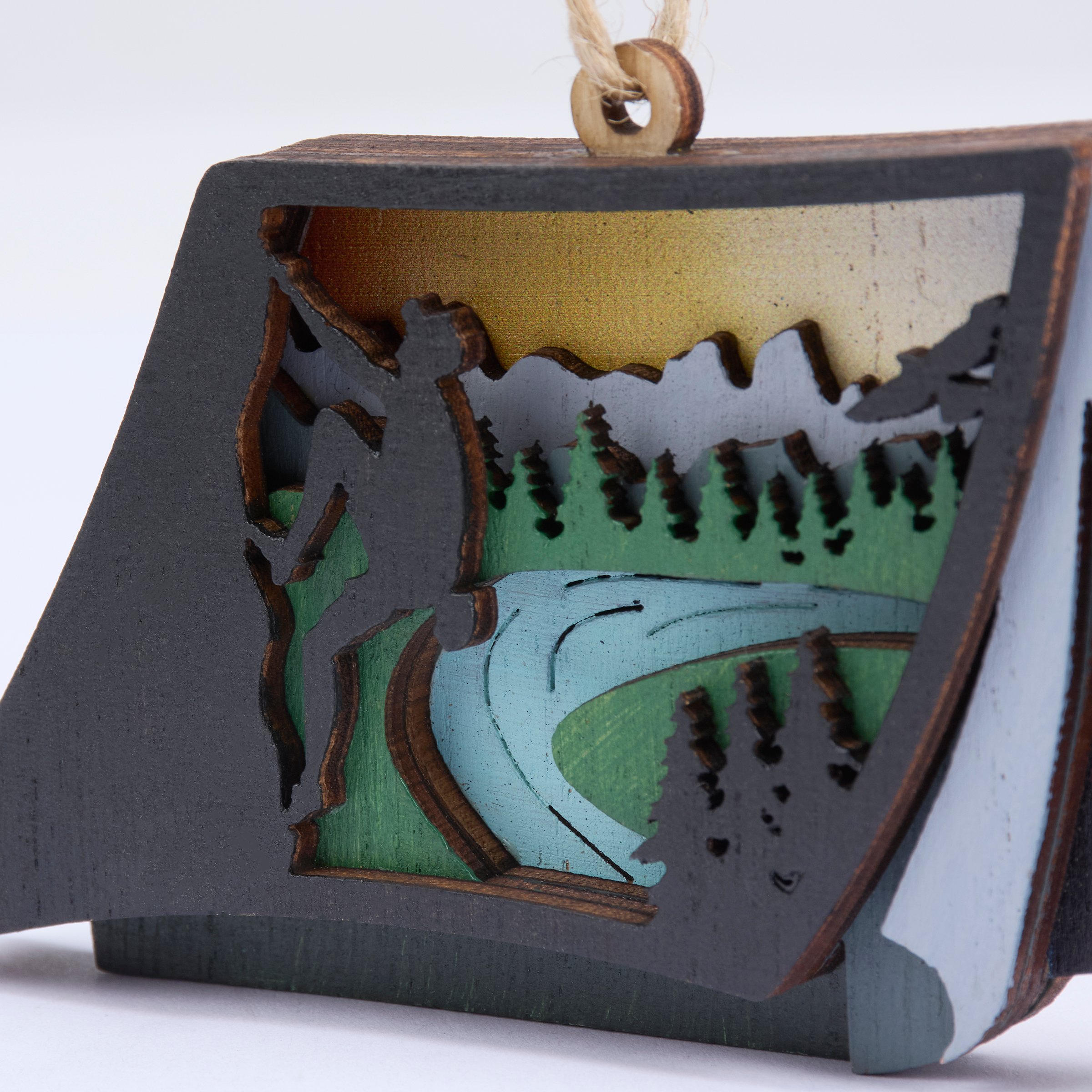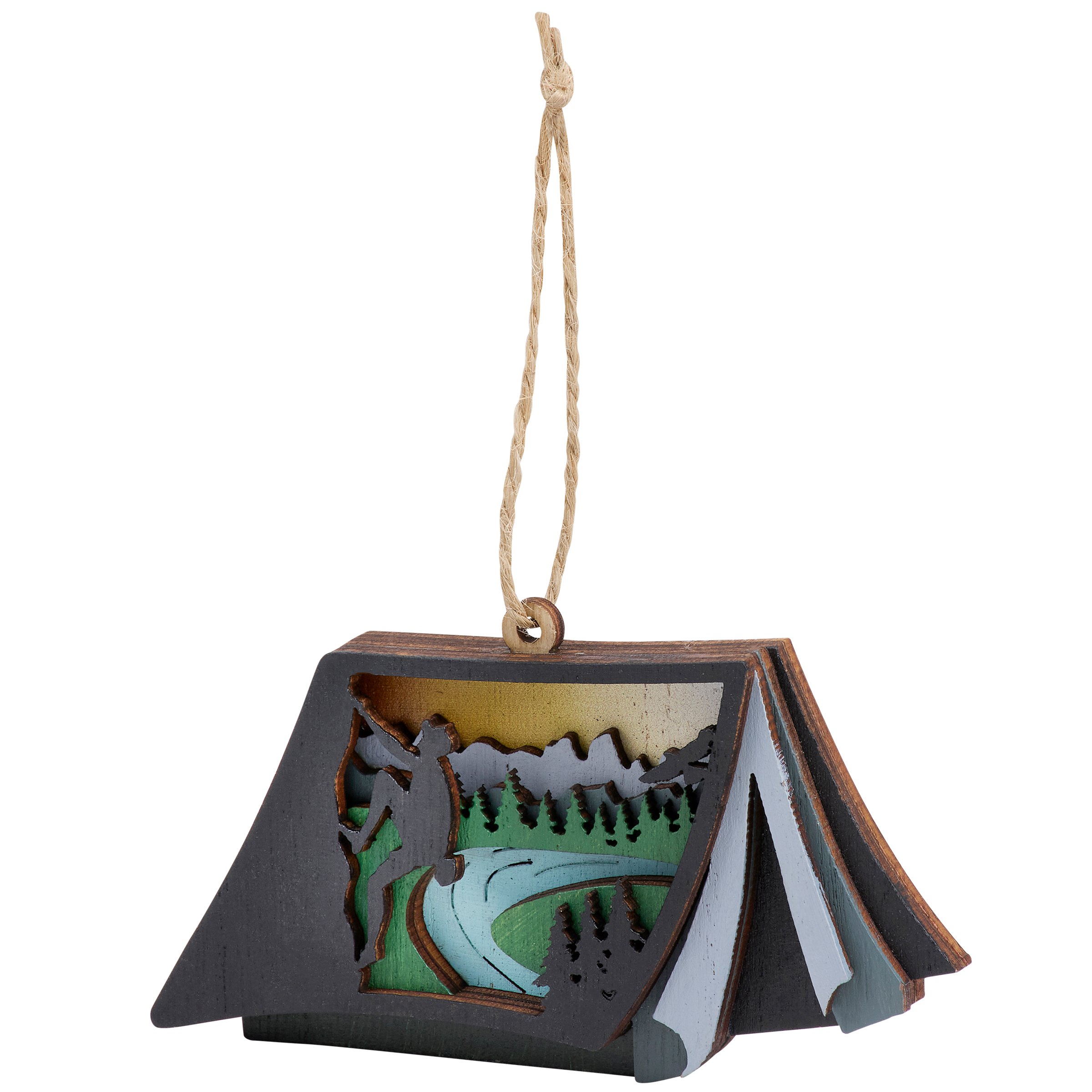 A wooden ornament from our Lake & Cabin Collection featuring a camping tent shape cut from natural wood with a cliff climbing scene displayed inside that is made with layered cutouts of colored wood pieces for added dimension. Our Camping Tent magnetic ornament is ready to hang via the attached jute hanger with a magnet attached to the back for additional display options. A rustic home accent perfect for adding personality to a Christmas tree or for nature themed displays.
