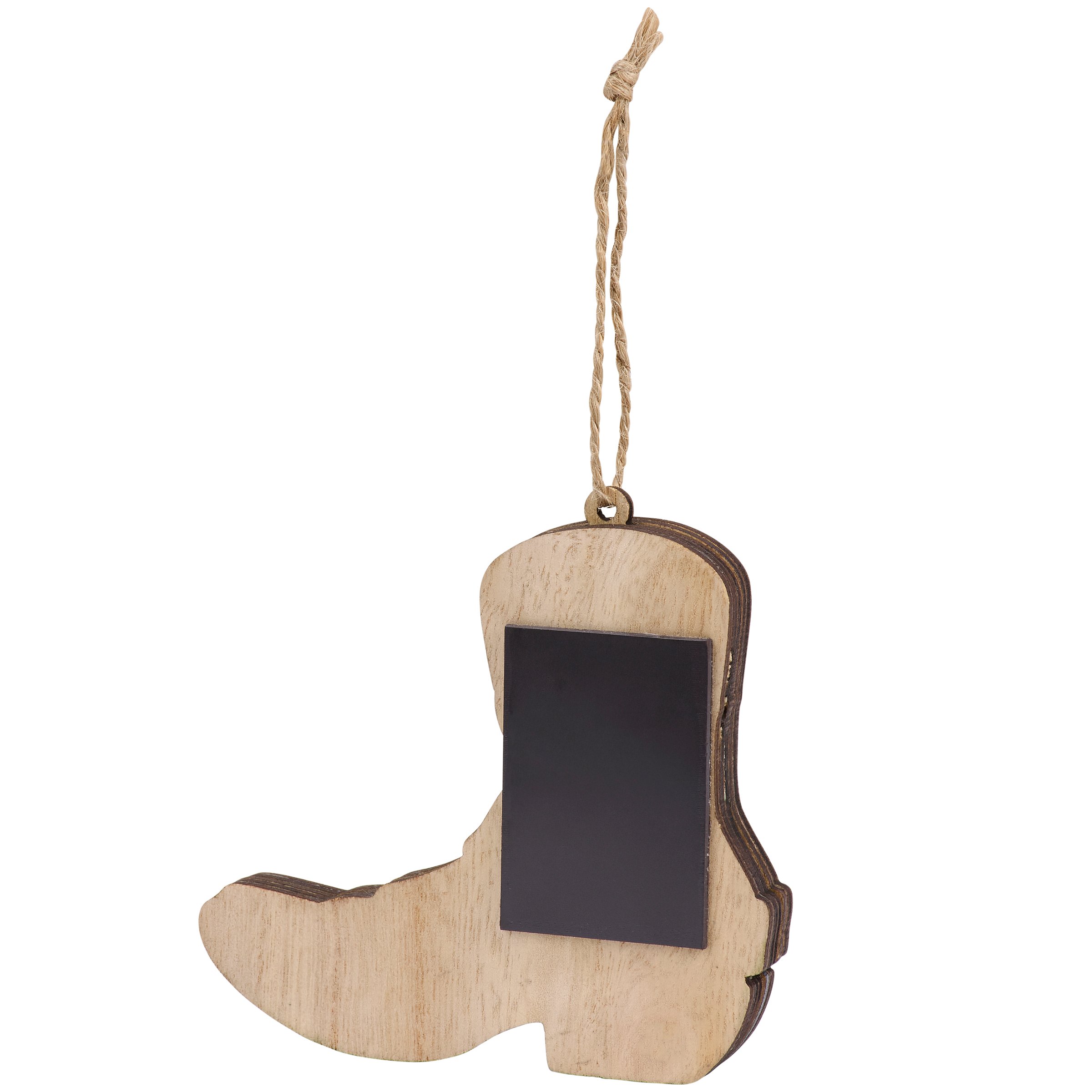 A wooden ornament from our Western Collection featuring a cowboy boot shape cut from natural wood with a desert campfire scene of a cowboy on a horse displayed inside that is made with layered cutouts of colored wood pieces for added dimension. Our Cowboy Boot magnetic ornament is ready to hang via the attached jute hanger with a magnet attached to the back for additional display options. A rustic home accent perfect for adding personality to a Christmas tree or for western themed displays.