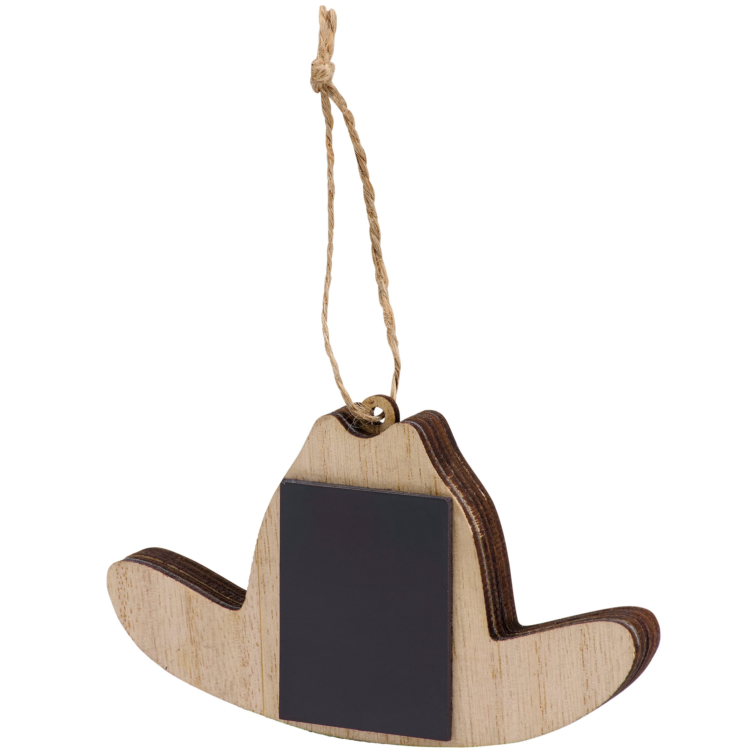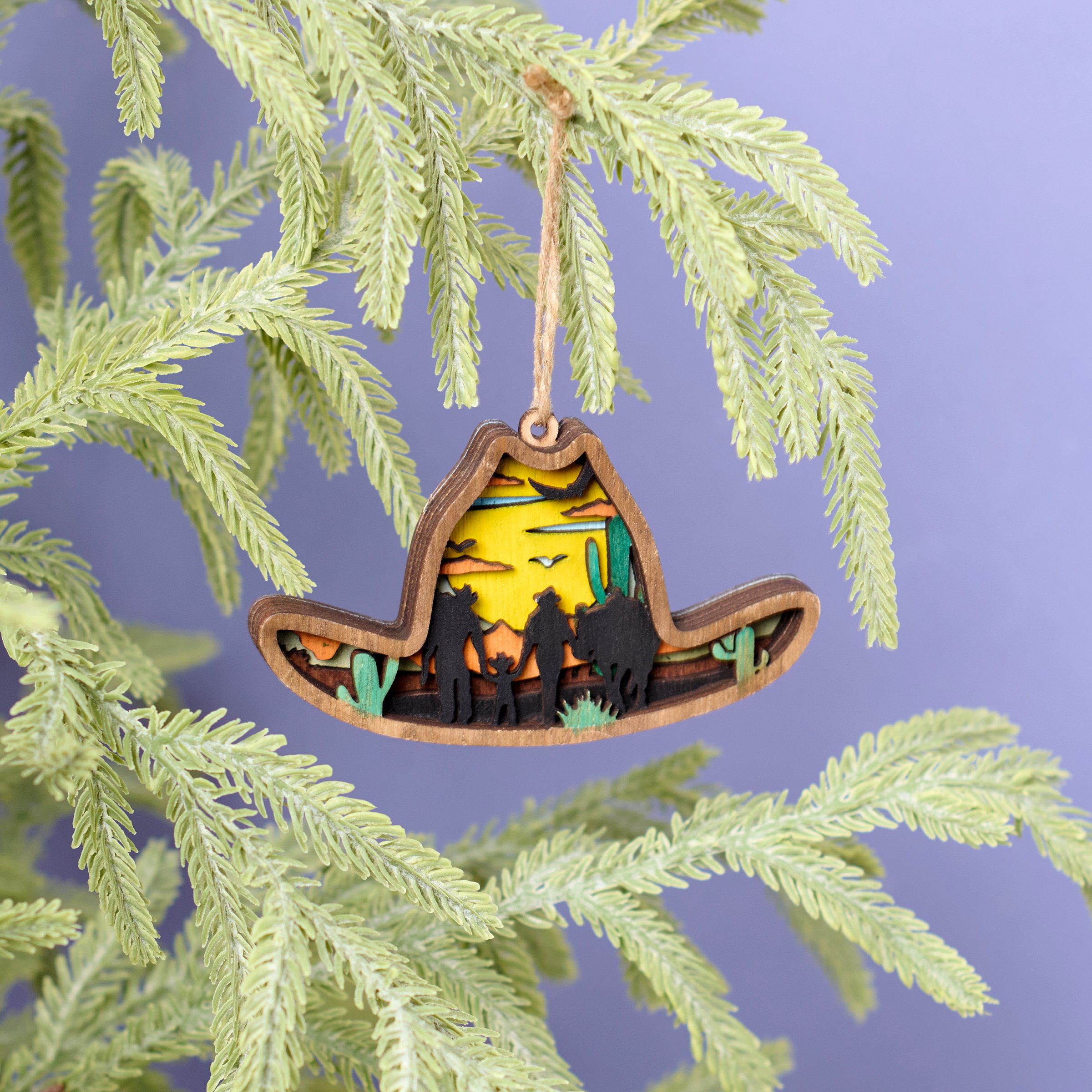 A wooden ornament from our Western Collection featuring a cowboy hat shape cut from natural wood with a desert scene of a family displayed inside that is made with layered cutouts of colored wood pieces for added dimension. Our Cowboy Hat magnetic ornament is ready to hang via the attached jute hanger with a magnet attached to the back for additional display options. A rustic home accent perfect for adding personality to a Christmas tree or for western themed displays.