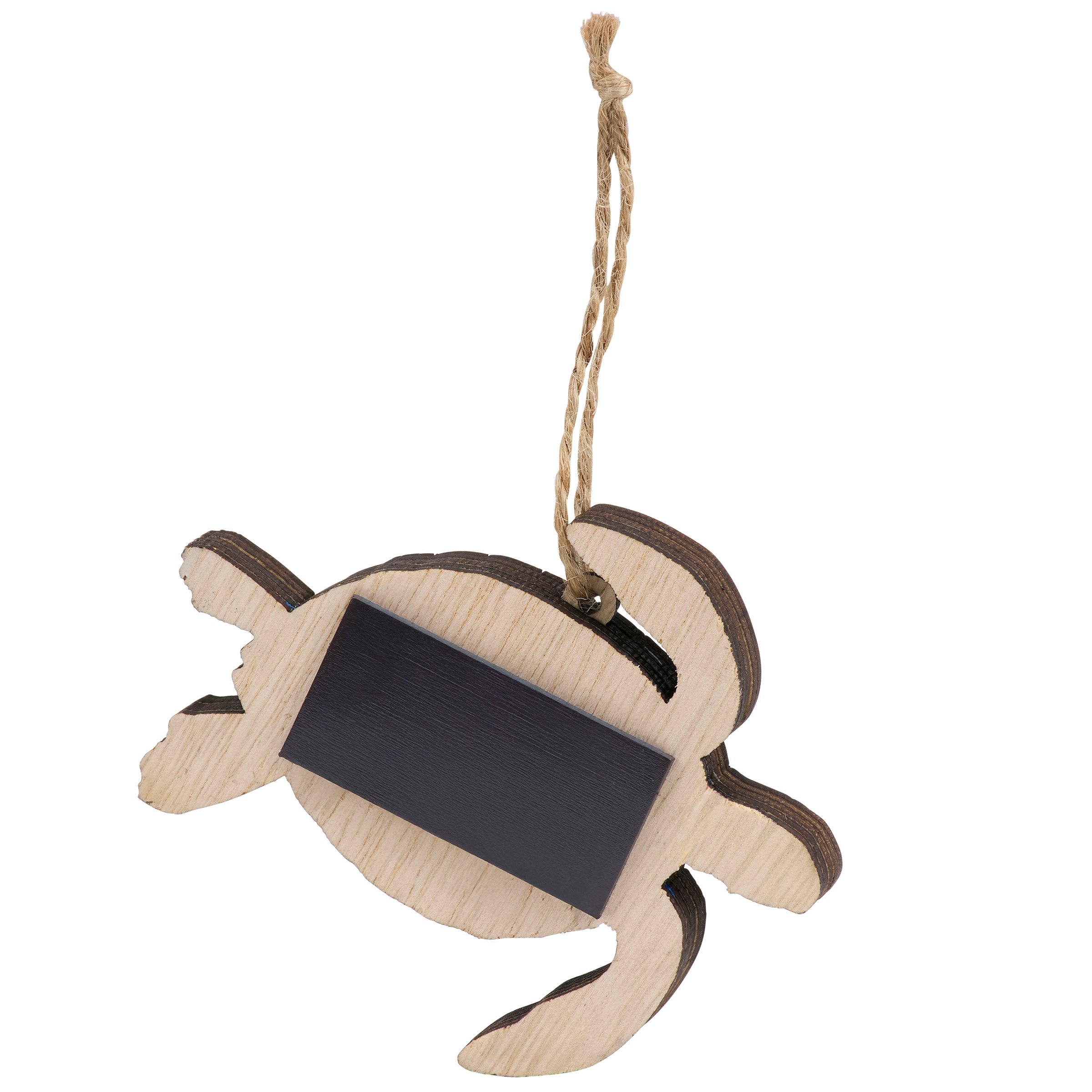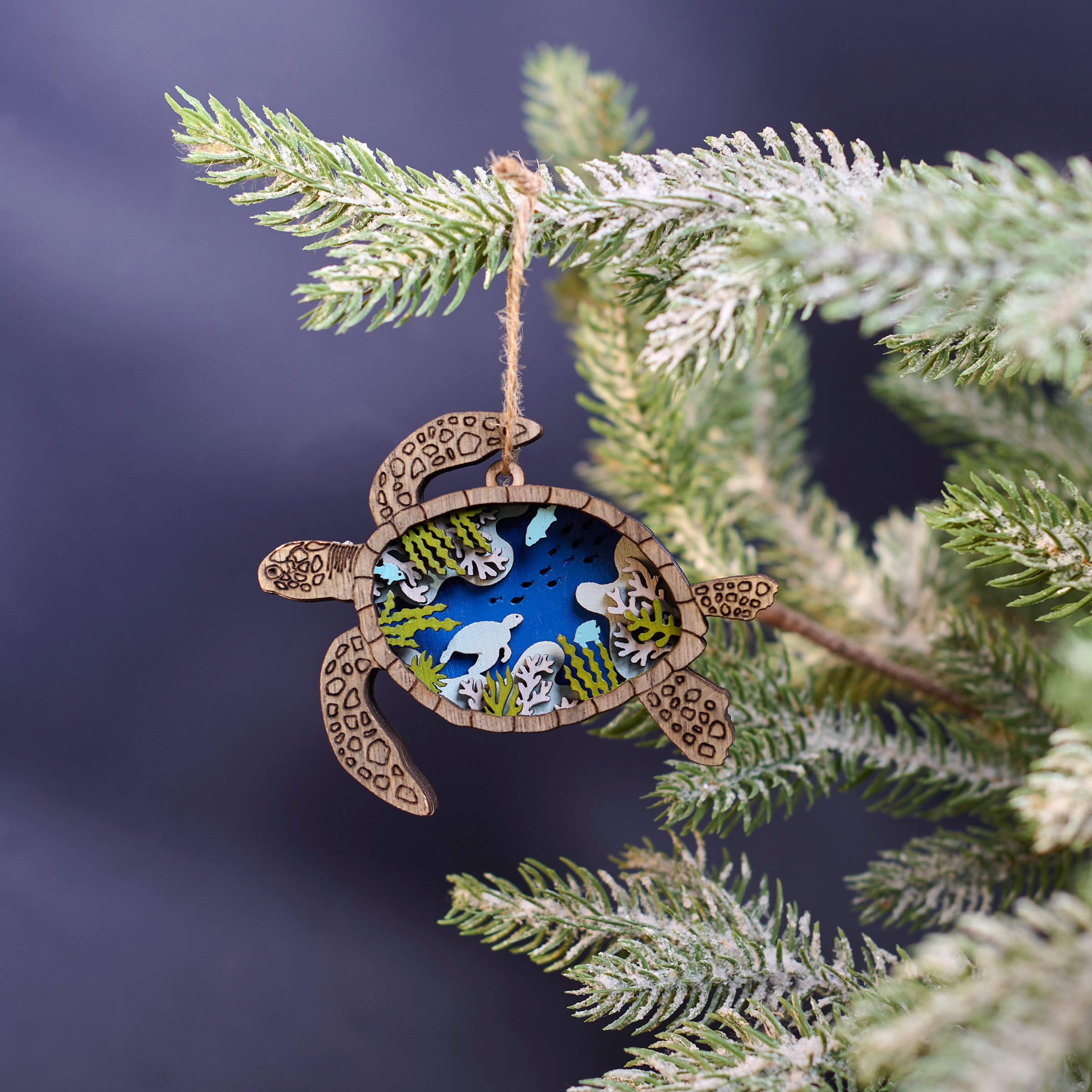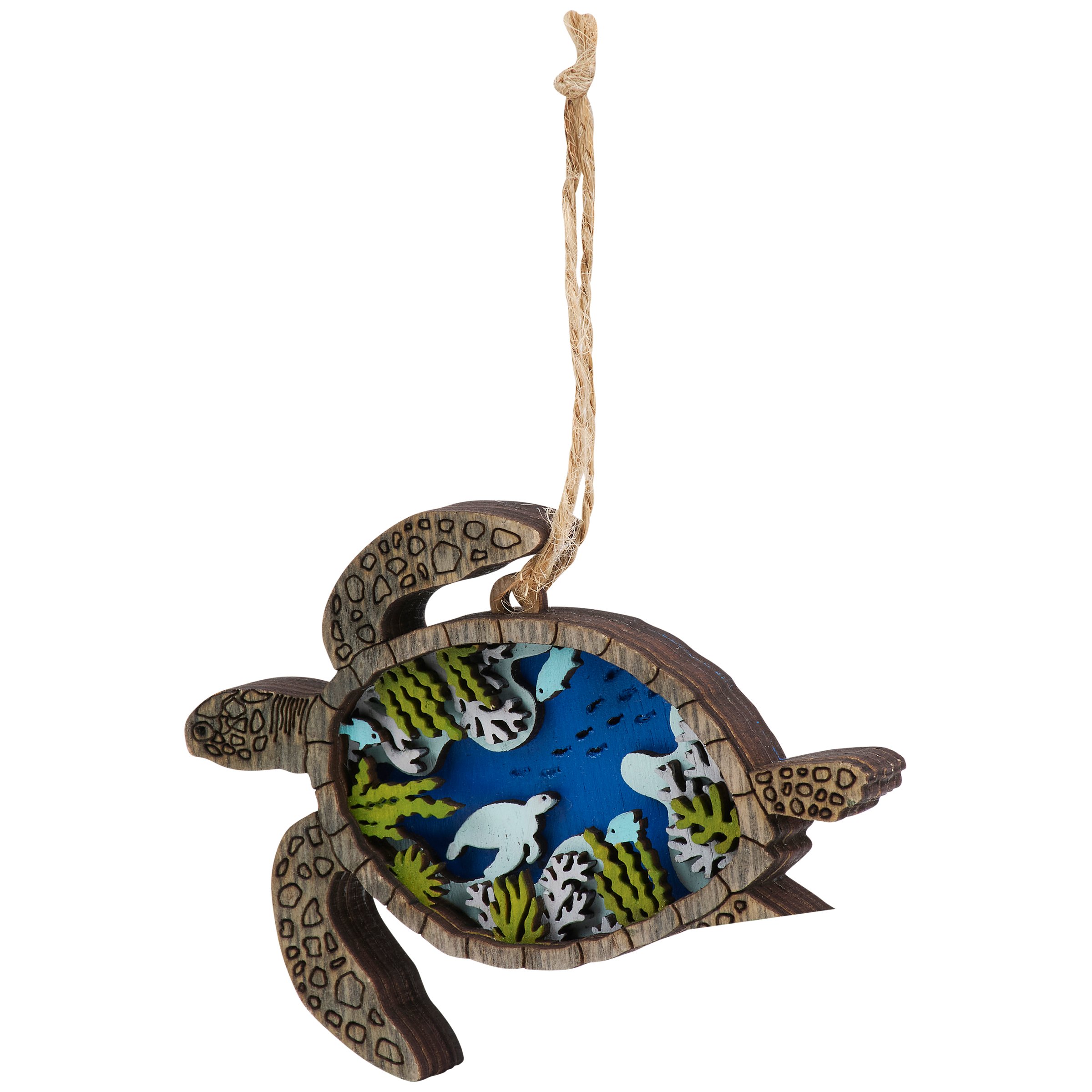 A wooden ornament from our Beach Collection featuring a sea turtle shape cut from natural wood with an ocean scene of turtles displayed inside that is made with layered cutouts of colored wood pieces for added dimension. Our Sea Turtle magnetic ornament is ready to hang via the attached jute hanger with a magnet attached to the back for additional display options. A rustic home accent perfect for adding personality to a Christmas tree or for beach themed displays.