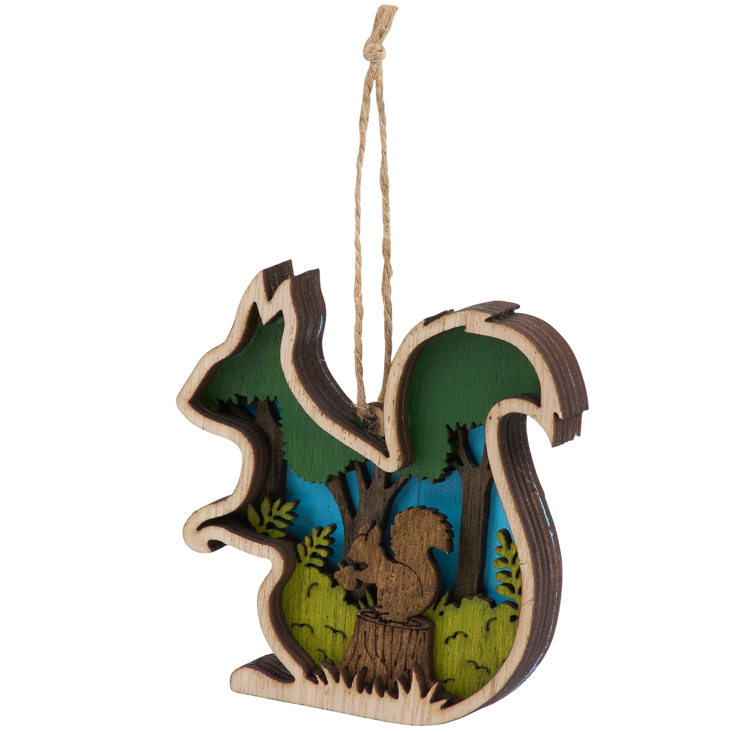 A wooden ornament from our Lake & Cabin Collection featuring a squirrel shape cut from natural wood with a forest scene of squirrel eating an acorn displayed inside that is made with layered cutouts of colored wood pieces for added dimension. Our Squirrel magnetic ornament is ready to hang via the attached jute hanger with a magnet attached to the back for additional display options. A rustic home accent perfect for adding personality to a Christmas tree or for nature themed displays.