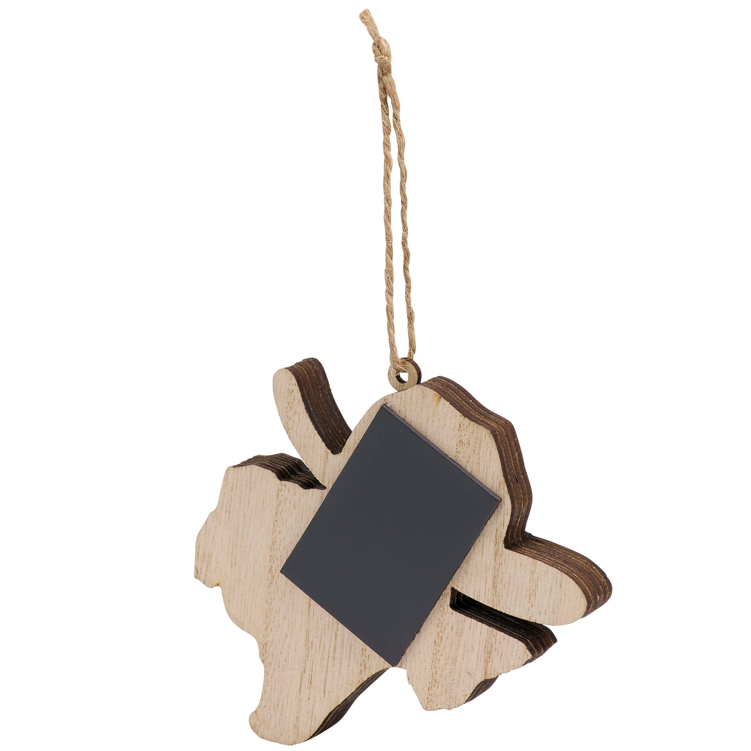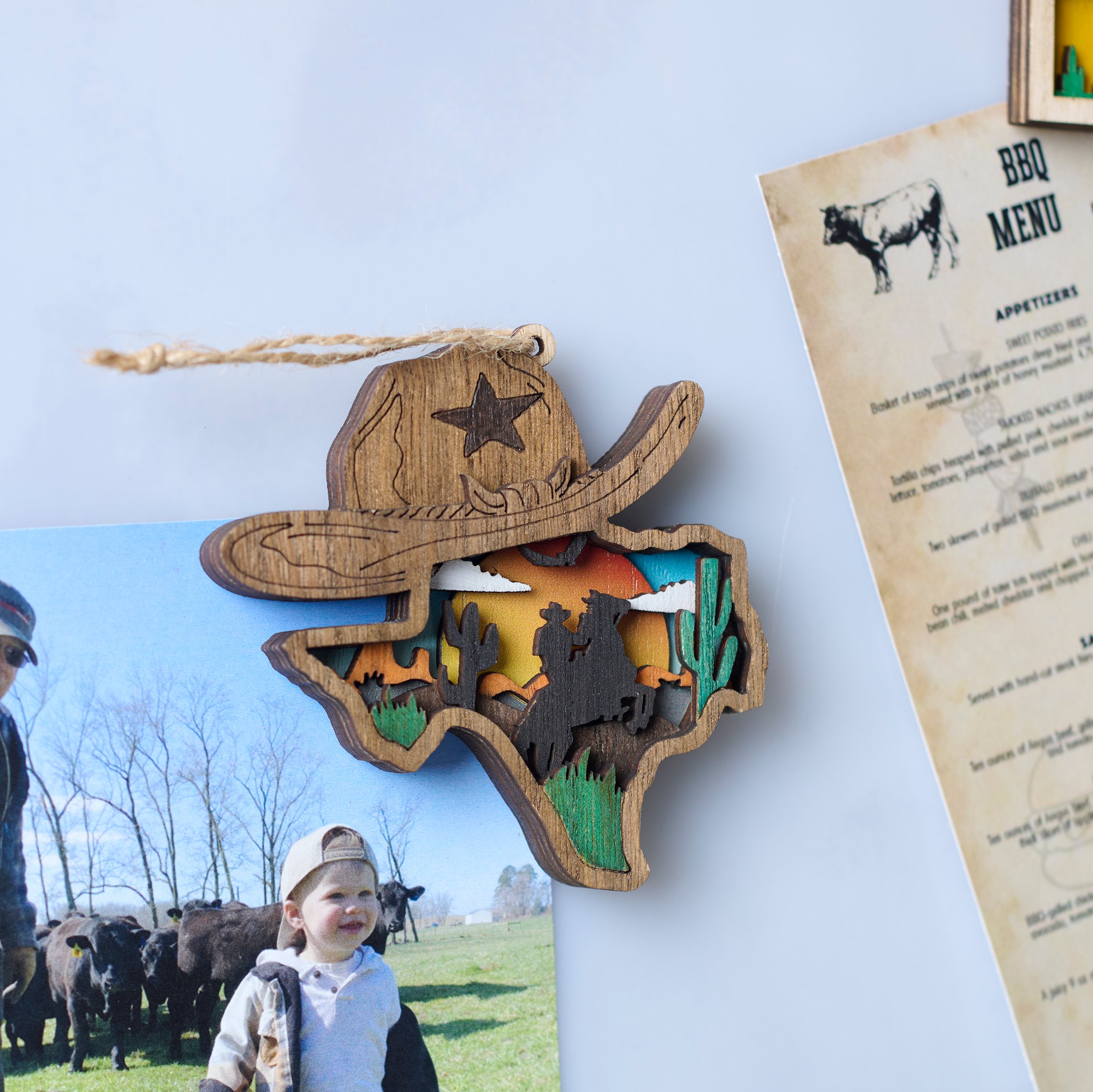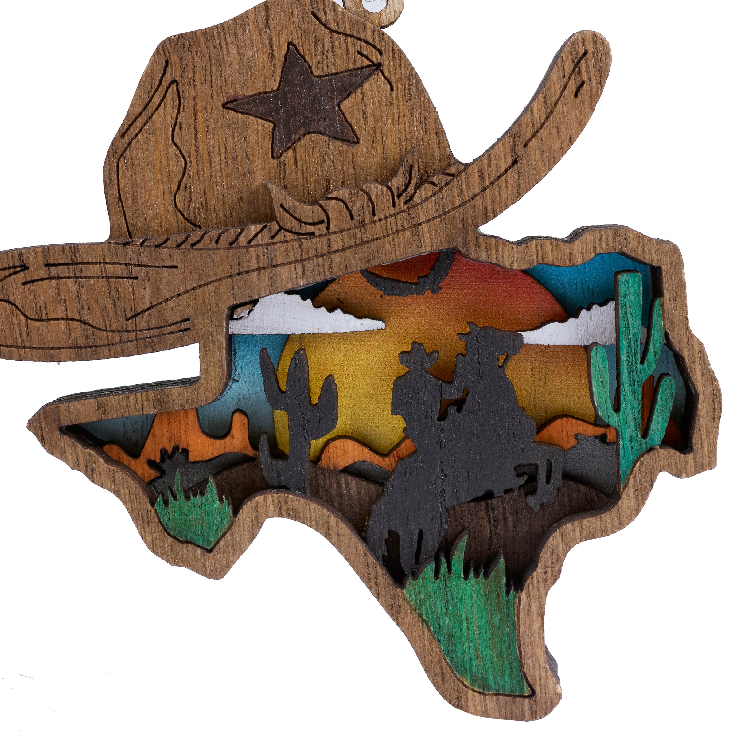 A wooden ornament from our Western Collection featuring a cowboy hat on the state Texas shape cut from natural wood with a desert scene of a cowboy on a horse displayed inside that is made with layered cutouts of colored wood pieces for added dimension. Our Texas Cowboy Hat magnetic ornament is ready to hang via the attached jute hanger with a magnet attached to the back for additional display options. A rustic home accent perfect for adding personality to a Christmas tree or for western themed displays.