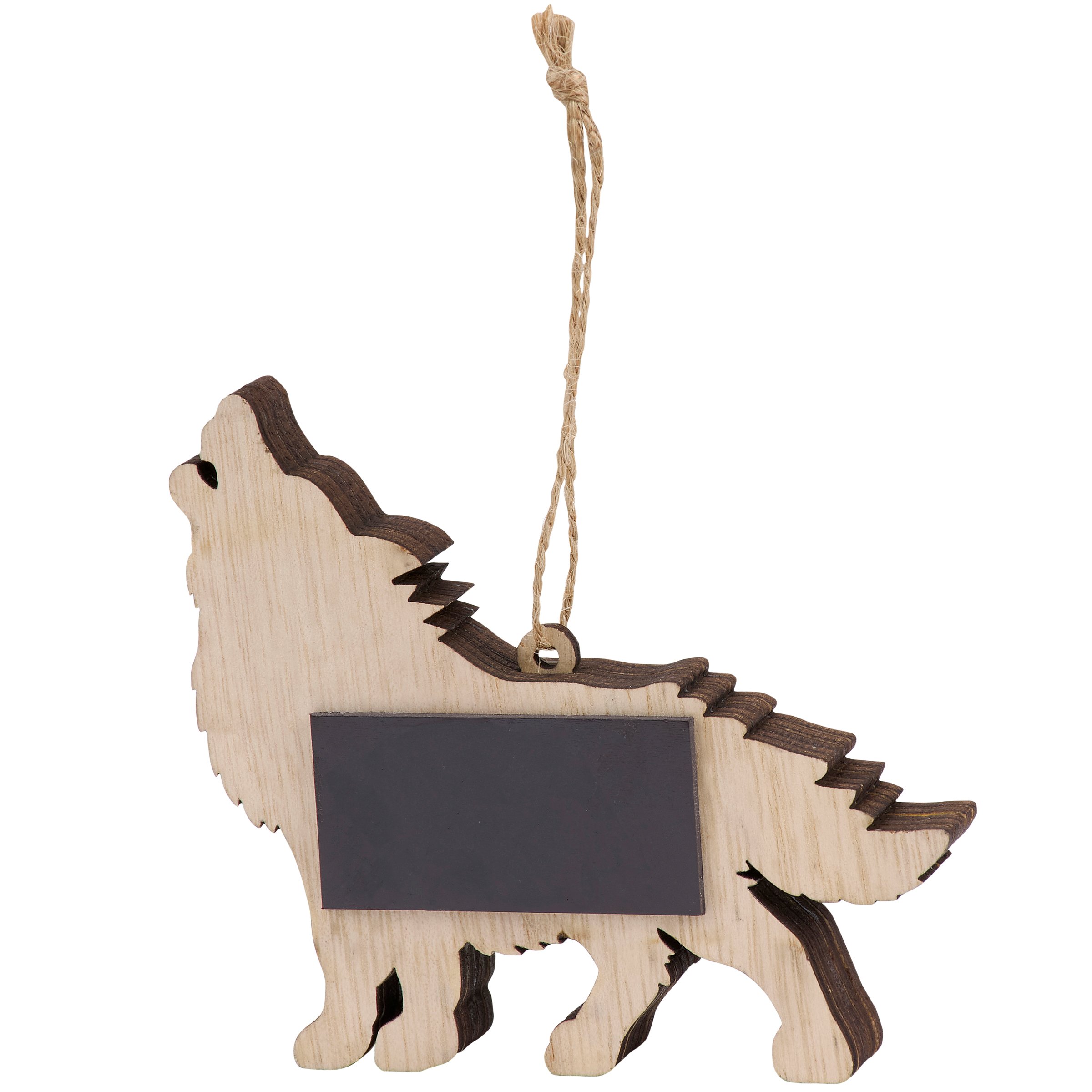 A wooden ornament from our Lake & Cabin Collection featuring a gray wolf shape cut from natural wood with a mountain scene of a wolf howling at the moon displayed inside that is made with layered cutouts of colored wood pieces for added dimension. Our Wolf magnetic ornament is ready to hang via the attached jute hanger with a magnet attached to the back for additional display options. A rustic home accent perfect for adding personality to a Christmas tree or for nature themed displays.