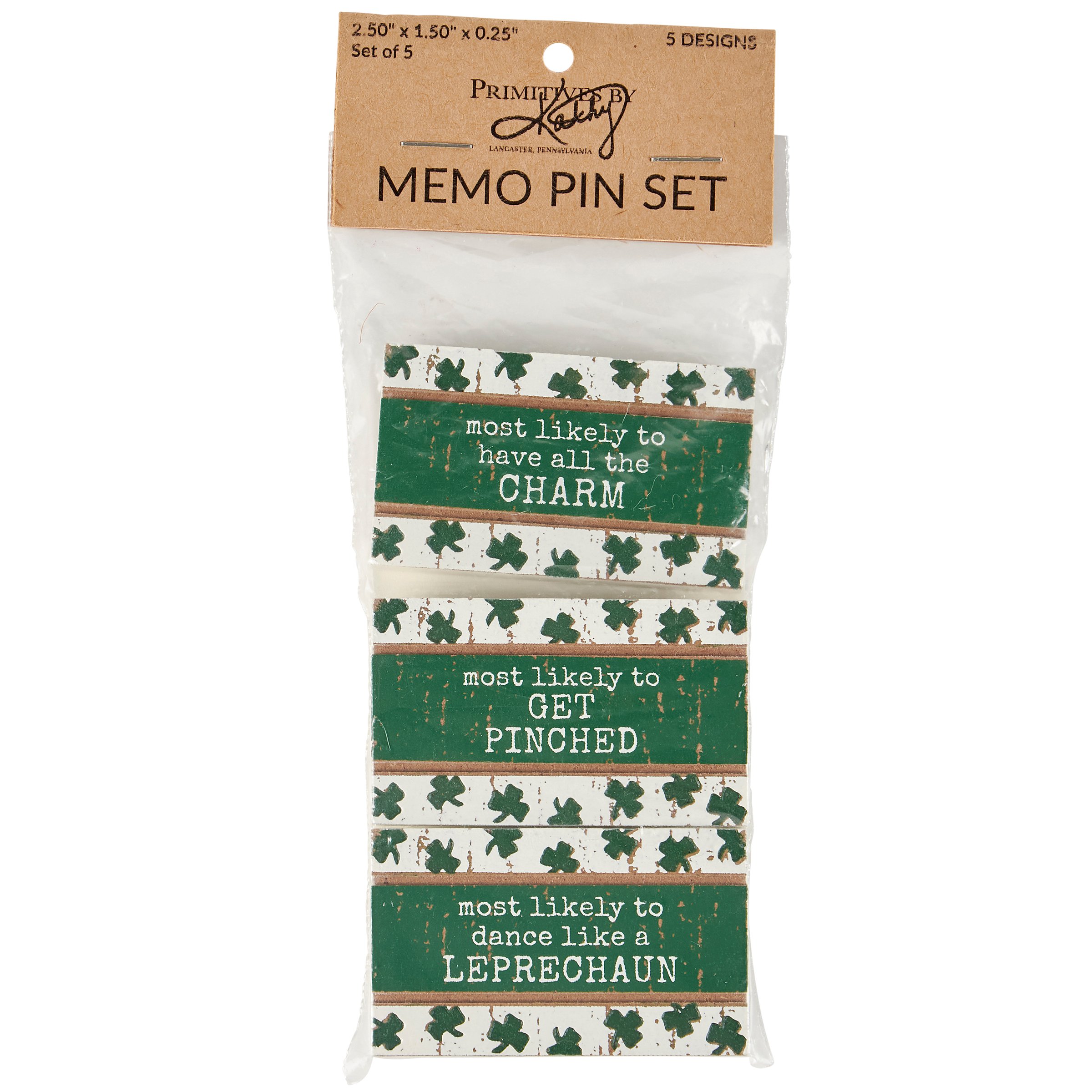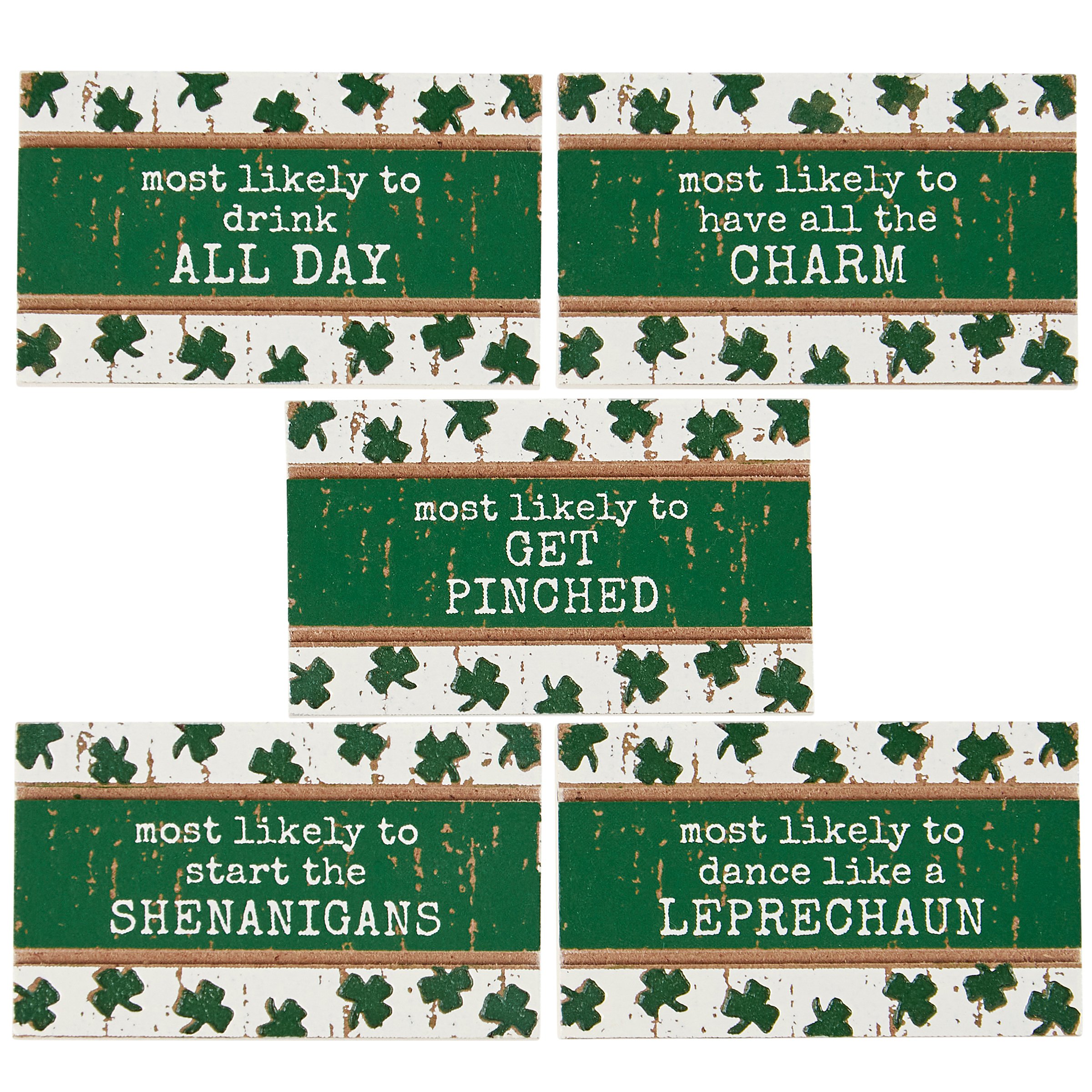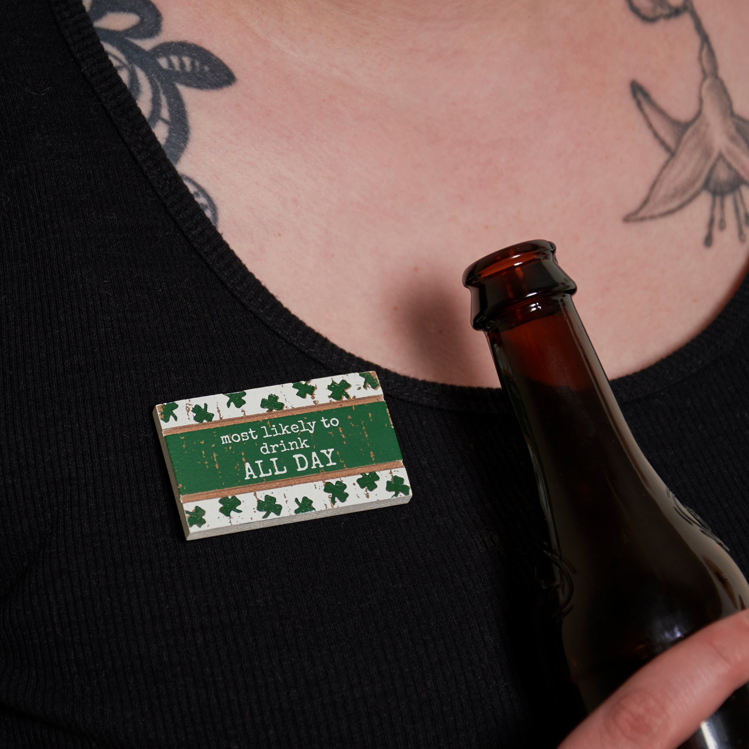 A set of wooden wearable pins from our St. Patrick's Day Collection displaying St. Patrick's Day inspired sentiments with a fun "Most Likely To…" theme perfect for celebrating the holiday with family and friends. Set includes five pins with rustic slat wood designs featuring debossed shamrock patterns and distressed details. Individual sentiments include "Most Likely To Drink All Day," "Most Likely To Have All The Charm," "Most Likely To Get Pinched," "Most Likely To Start The Shenanigans," and "Most Likely To Dance Like A Leprechaun." Pins easily attach to clothing using the magnetic clips on the back. Our Most Likely Magnetic Pin Set is packaged together in a poly bag and sealed with header card including a hole for easy rack display. A fun set of St. Patrick's Day accessories perfect for holiday events.
