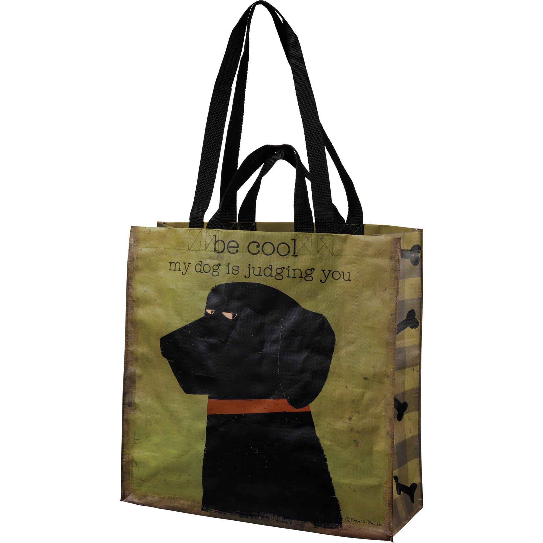 A rustic-inspired market tote bag featuring double-sided "Be Cool My Dog Is Judging You" sentiments with smug dog designs. Contains dual shoulder and hand straps with interior pocket; made from post-consumer materials. Complements well with coordinating pieces in collection for a sassy pet display.