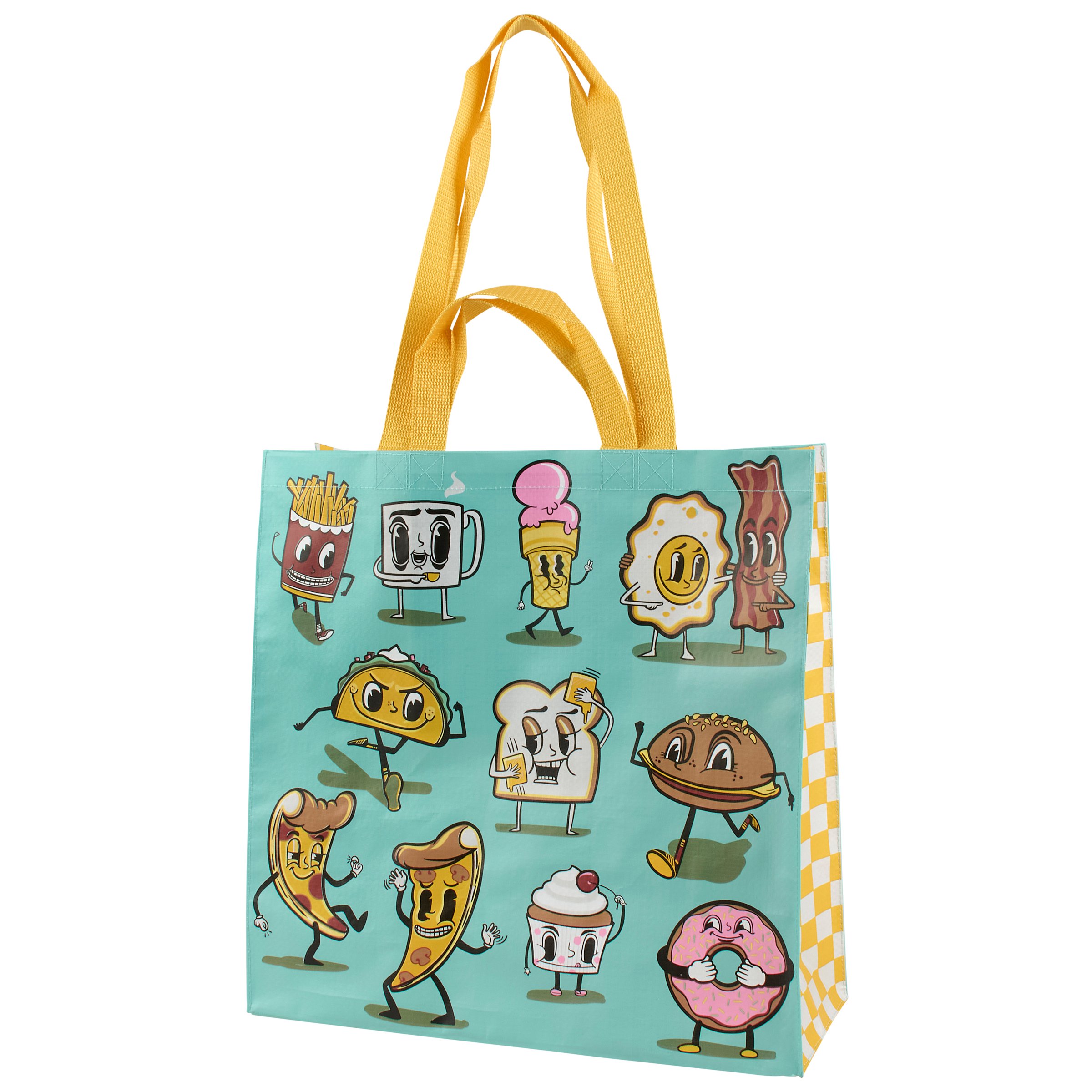 A double-sided market tote from our LOL-Made You Smile Collection displaying playful hand illustrated designs of various food characters hanging out together in a fun retro style. Foodie tote gussets display a coordinating retro checkerboard pattern. This everyday market tote includes both hand and shoulder straps in yellow nylon and a convenient inside pocket displaying a cupcake character. Our Food Crew tote bag is made from eco-friendly post-consumer material and folds flat for easy storage. A fun food-themed tote perfect for an everyday accessory or traveling.