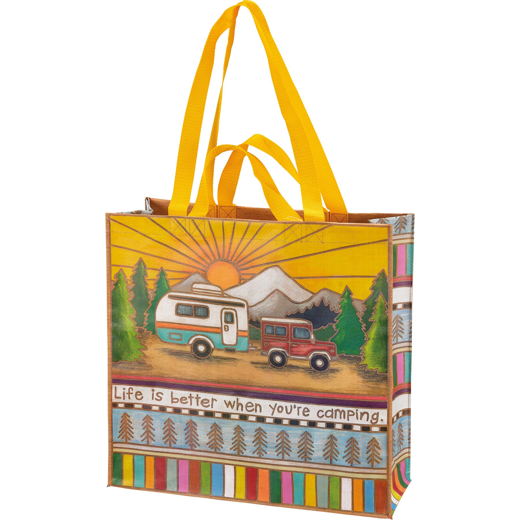 Made of post-consumer material, this double-sided market tote features a camper and other colorful wood burned designs with "Life Is Better When You're Camping" sentiment. Gusset features coordinating design. Our Life Is Better When You're Camping market tote contains an interior pocket and dual nylon hand and shoulder straps for easy carrying.