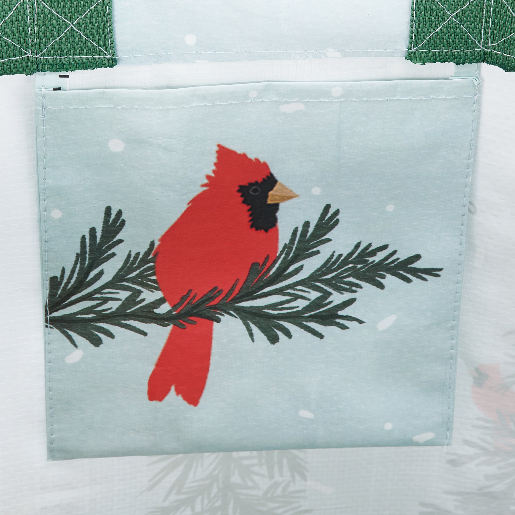 A double-sided tote from our Christmas Collection displaying a vivid hand illustrated design of cardinals in winter trees with uplifting sentiment that reads "May Love Cover Every Ground And May Peace Know No Bounds." Side gussets display coordinating design. Tote includes both hand and shoulder straps in green nylon and an inside pocket with cardinal design. Our May Peace Know No Bounds market tote is made from post-consumer material. An inspirational seasonal accessory perfect for holiday activities or traveling. .